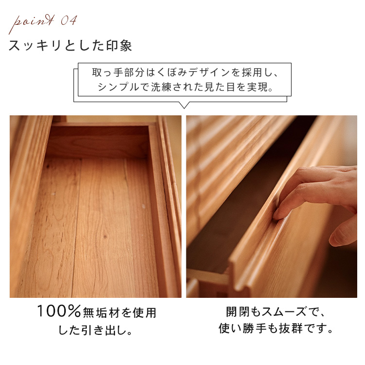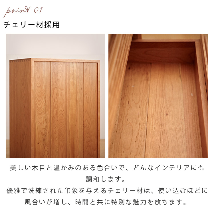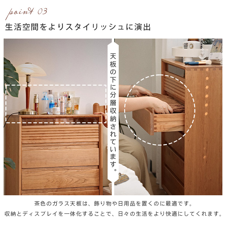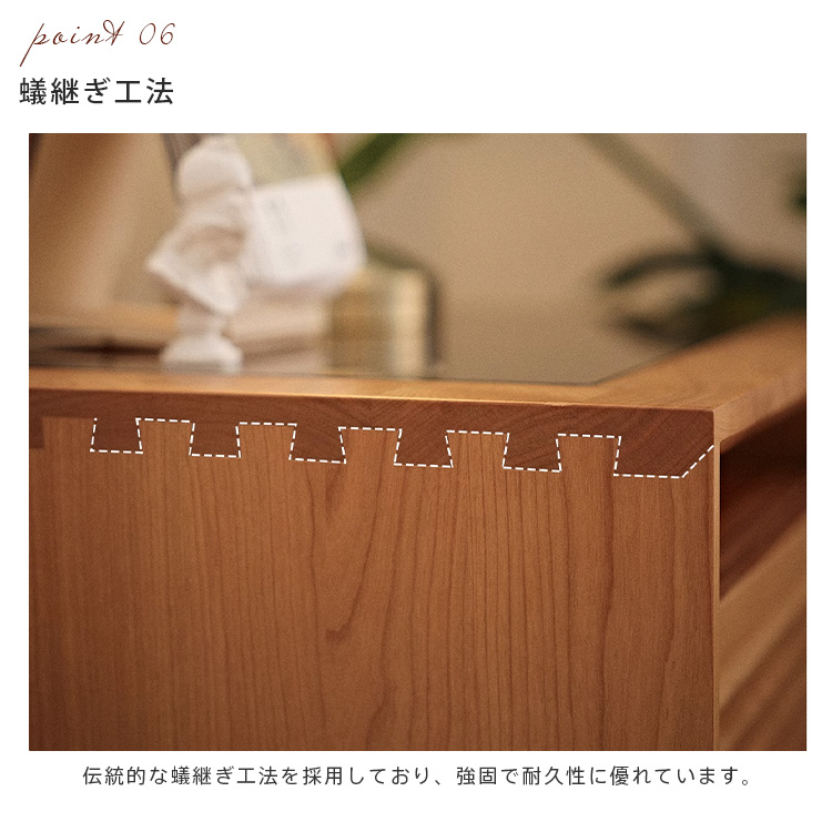 1.こだわりのチェリー材を使用した収納棚で、温もりと高級感のある空間を演出。2.すっきり見せるガラス扉デザインが、おしゃれなインテリアに洗練された印象を与えます。3.たっぷり収納できる引き出しと棚で、リモコンやゲーム機、雑誌などもすっきり整理可能。