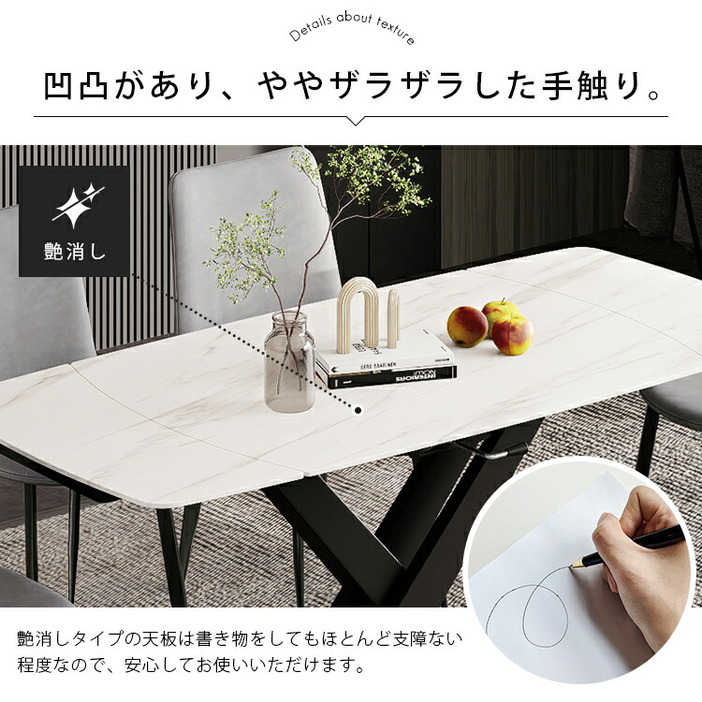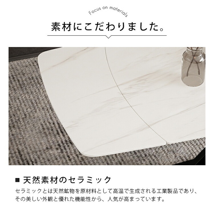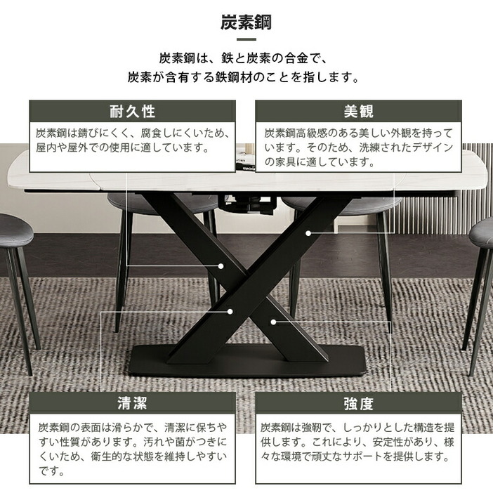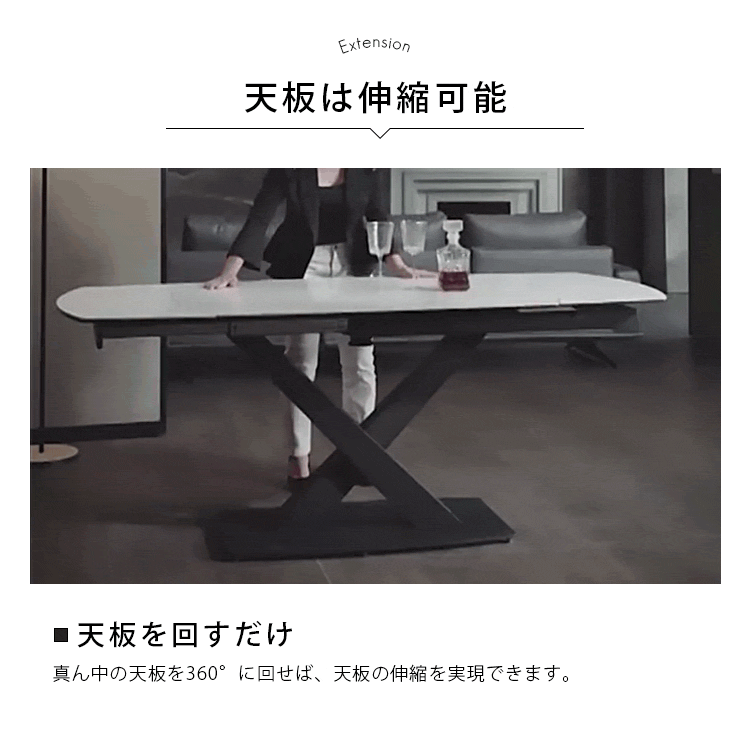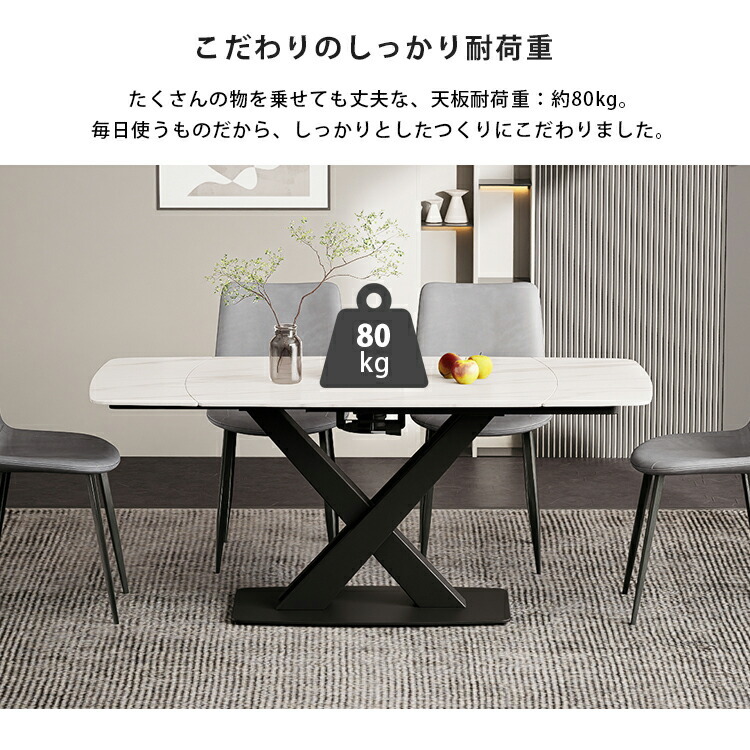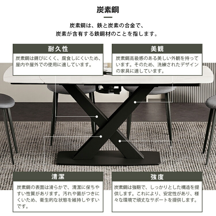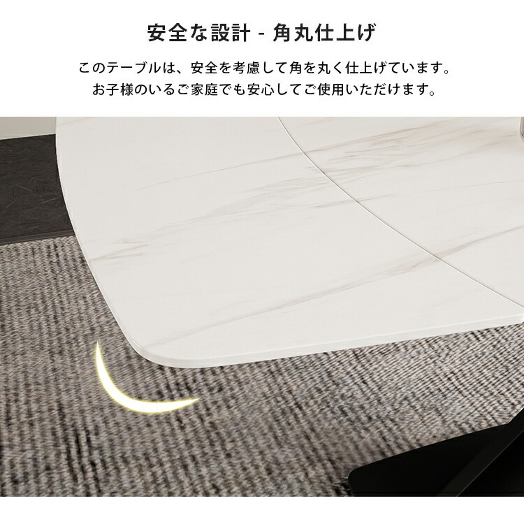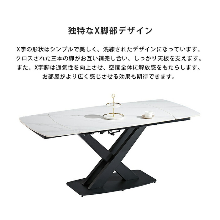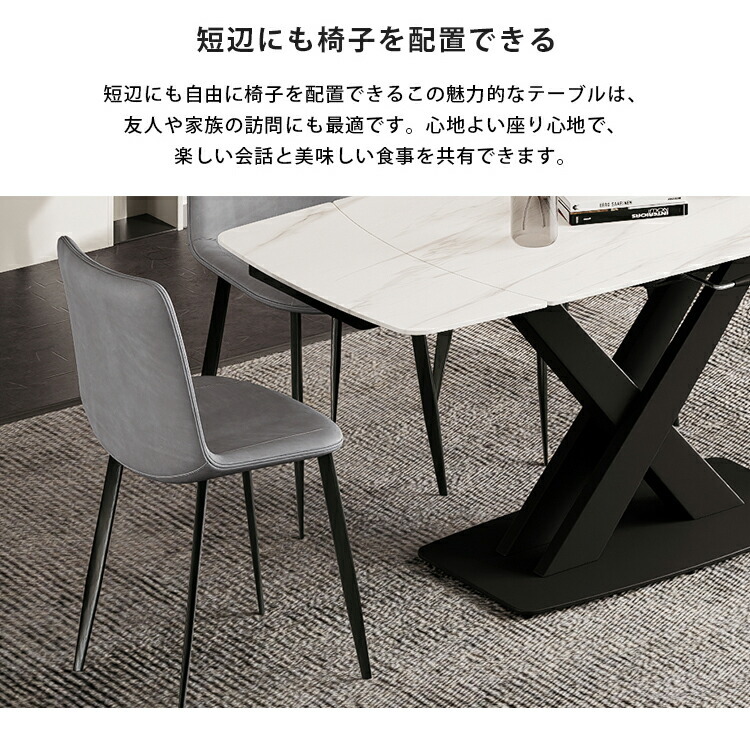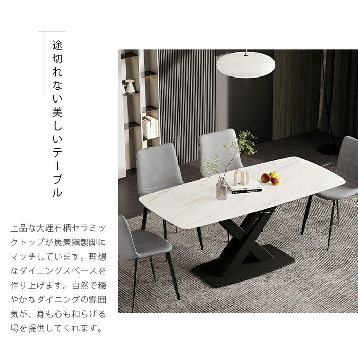 | おすすめのポイント | ■家族や友人が集まって食事する際に、フレキシブルに可変し、人数の増減に対応するというコンセプトで設計しました。 ■モダンでスタイリッシュなX型脚はデザイン性があり、空間に特別なアクセントを加えます。 ■テーブルの角を丸くした安全に配慮した設計で、お子様のいるご家庭でも安心してご使用いただけます。 ■セラミック天板は高級感があり、耐久性も備えています。美しさと実用性を兼ね備えています。 ■長方形のテーブルは、多くの場所に適応する柔軟性があります。狭いスペースにも置くことができ、壁に沿って配置することも可能です。 ■短辺にも椅子を自由に配置できる魅力的なテーブル。友人や家族の訪問でも心配はありません 。 |