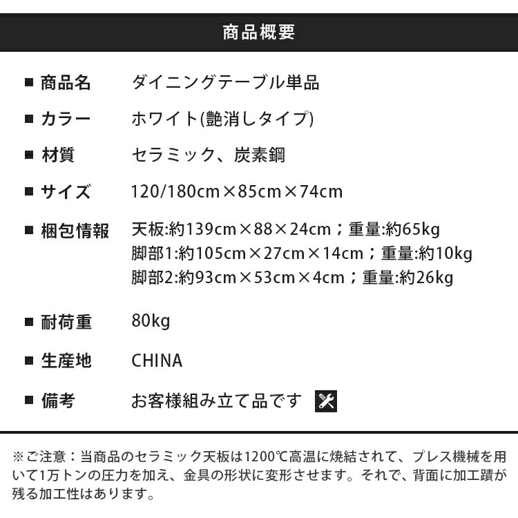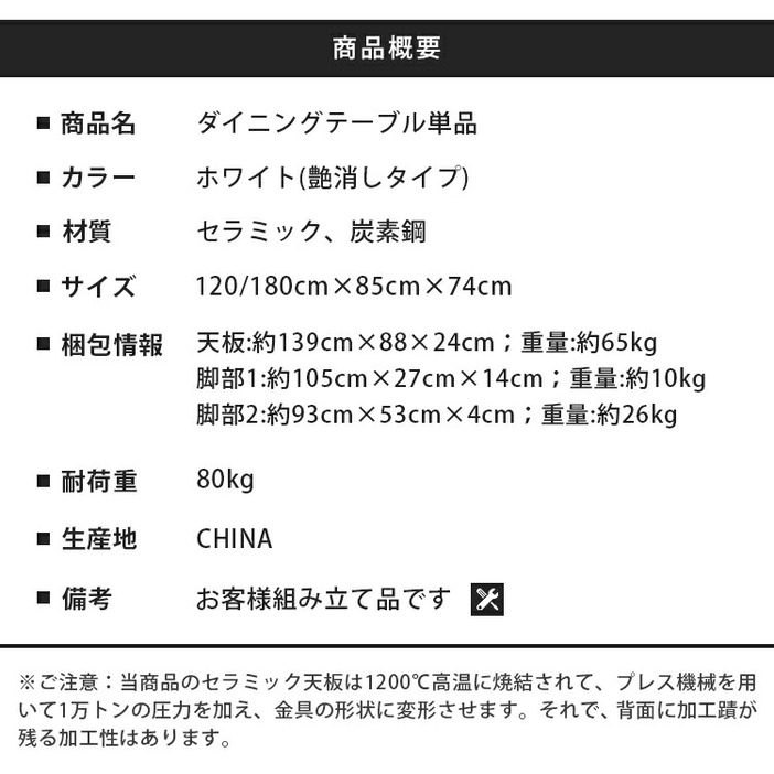 | 材質 | 天板:セラミック 脚:炭素鋼 |