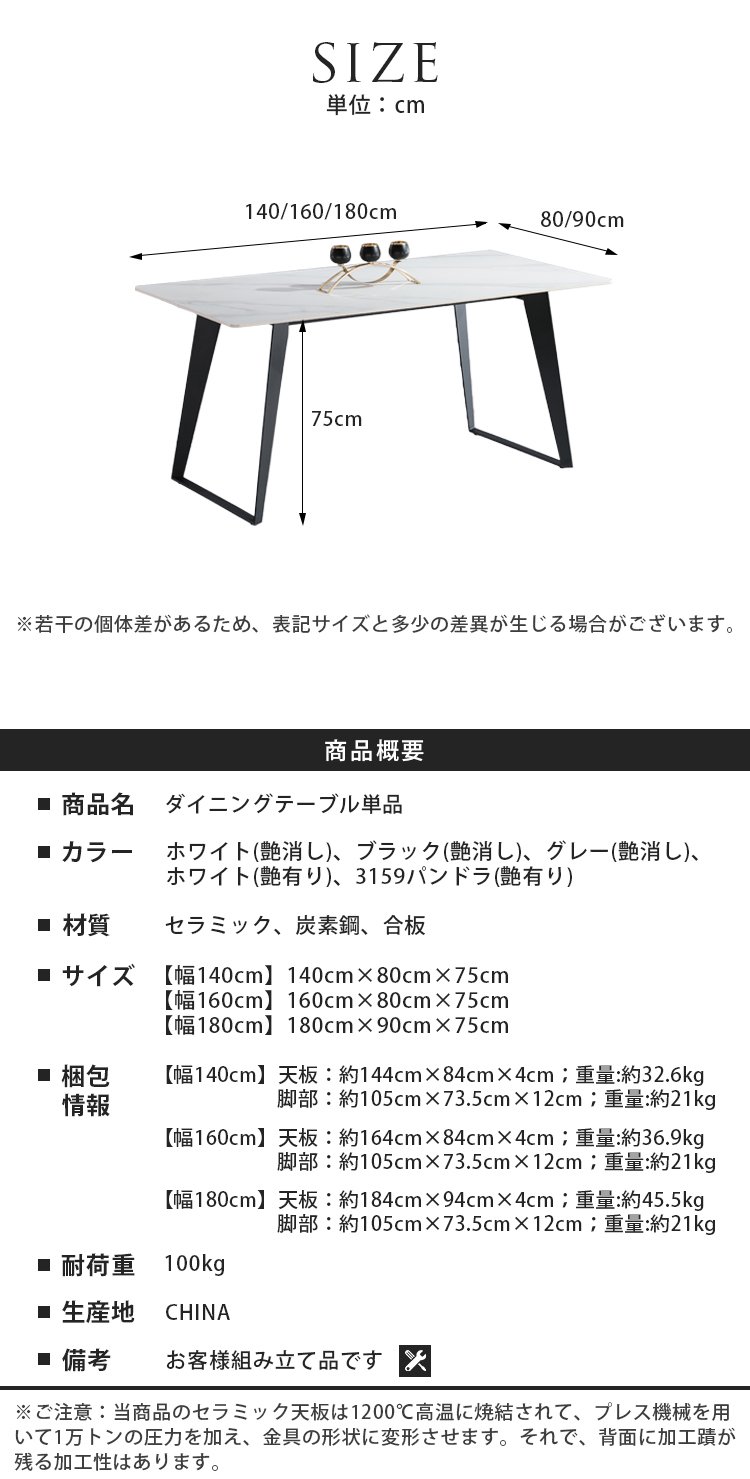 | 商品サイズ | ■テーブル 140×80×75cm 160×80×75cm 180×90×75cm |