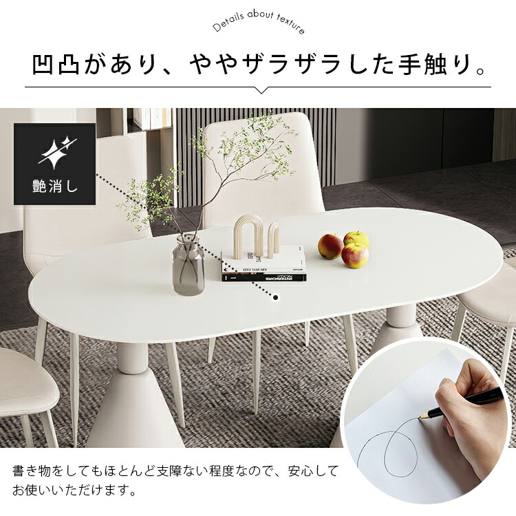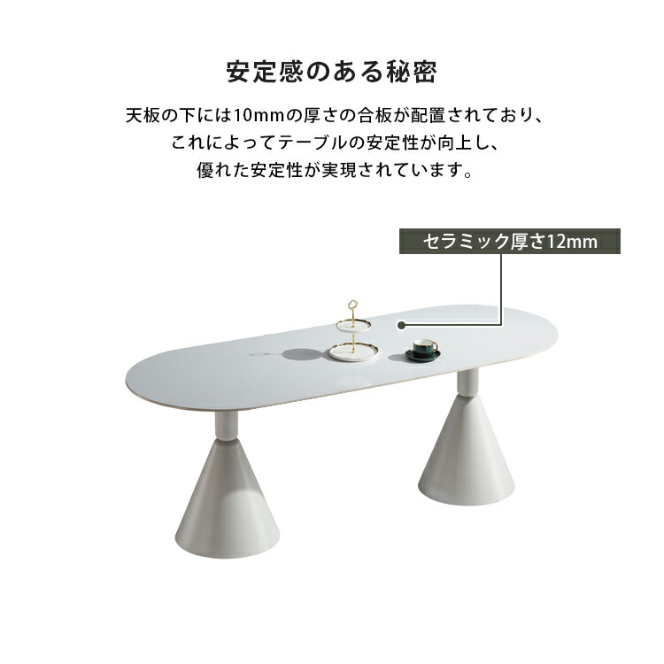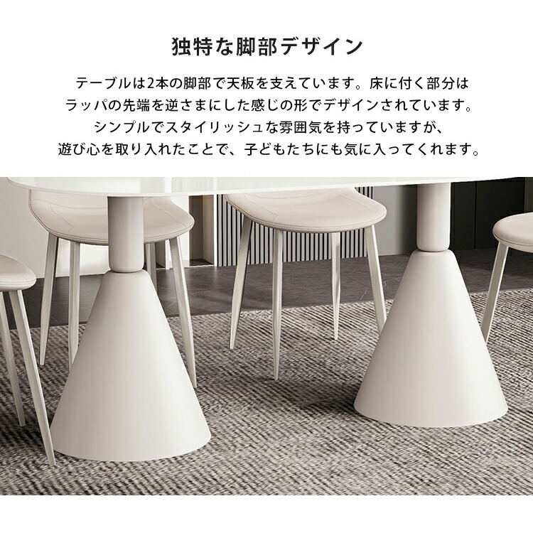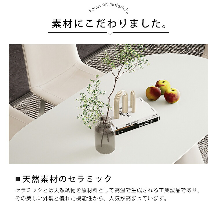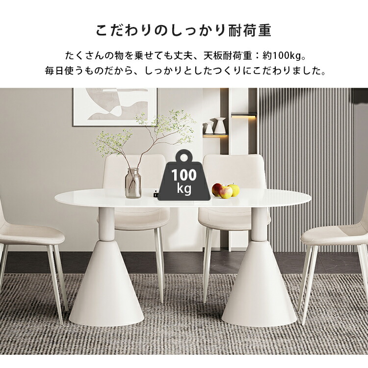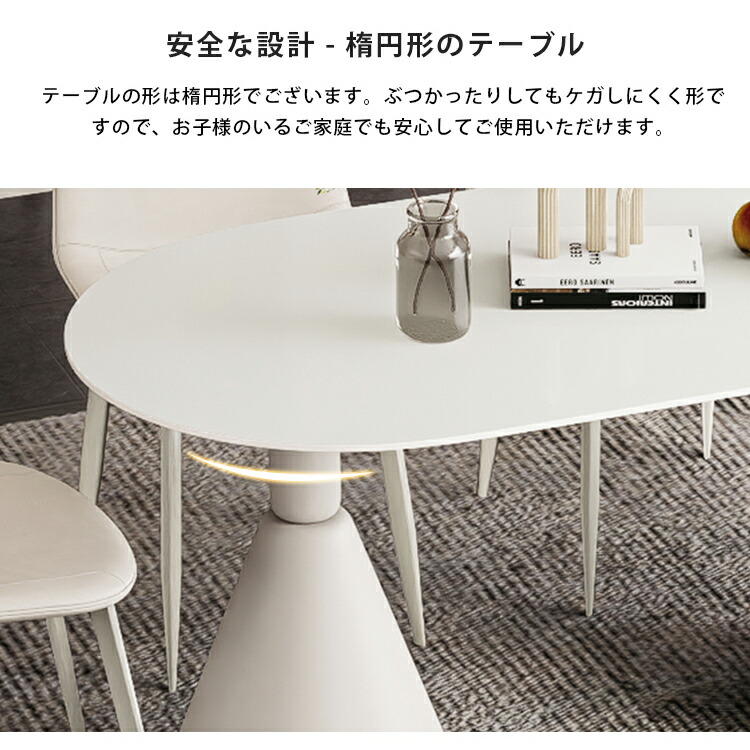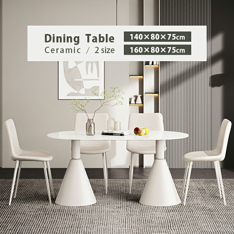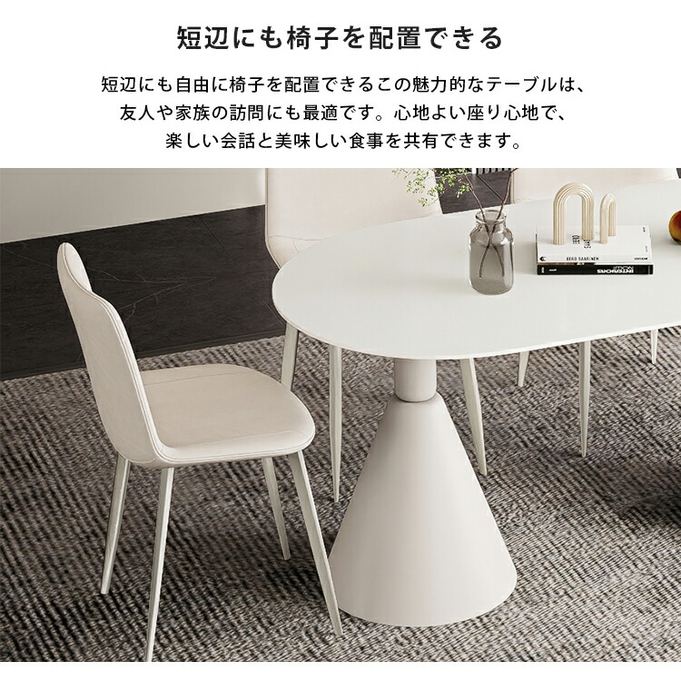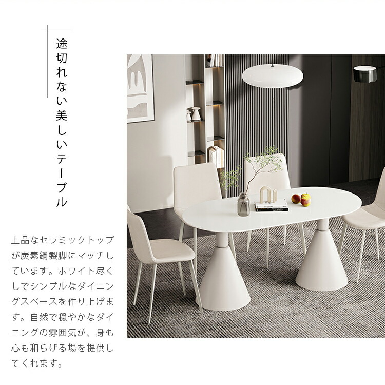| おすすめのポイント | ■ホワイトのカラーは清潔感を与え、部屋を明るく演出します。 ■短辺にも椅子を自由に配置できる魅力的なテーブル。友人や家族の訪問でも心配はありません 。 ■モダンでスタイリッシュな脚はデザイン性があり、空間に特別なアクセントを加えます。 ■テーブルの角を丸くした安全に配慮した設計で、お子様のいるご家庭でも安心してご使用いただけます。 ■セラミック天板は高級感があり、耐久性も備えています。美しさと実用性を兼ね備えています。 ■長方形のテーブルは、多くの場所に適応する柔軟性があります。狭いスペースにも置くことができ、壁に沿って配置することも可能です。 |