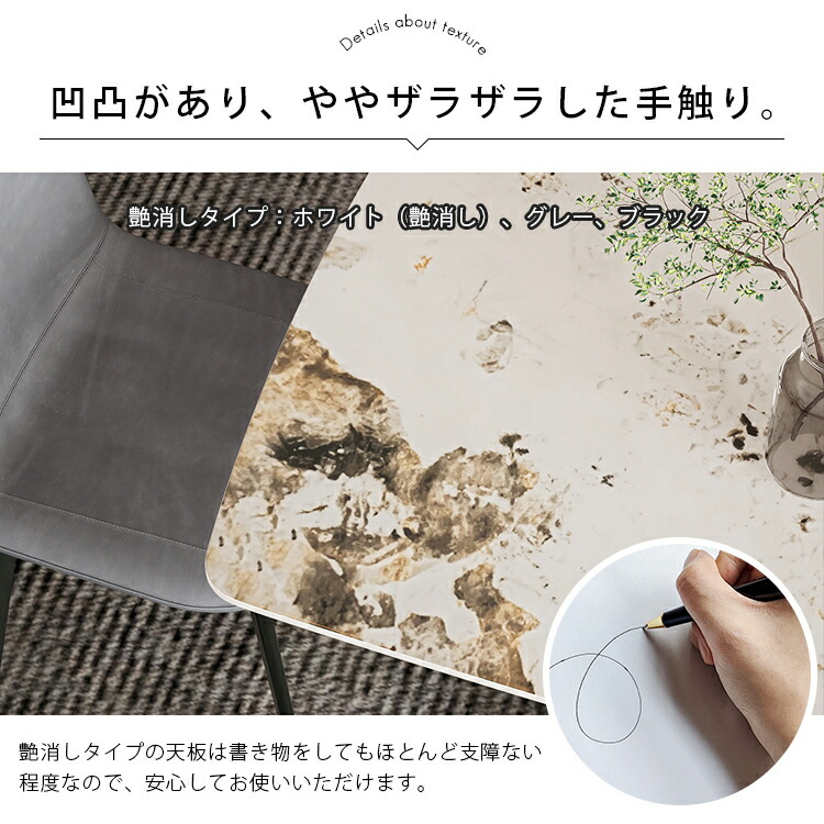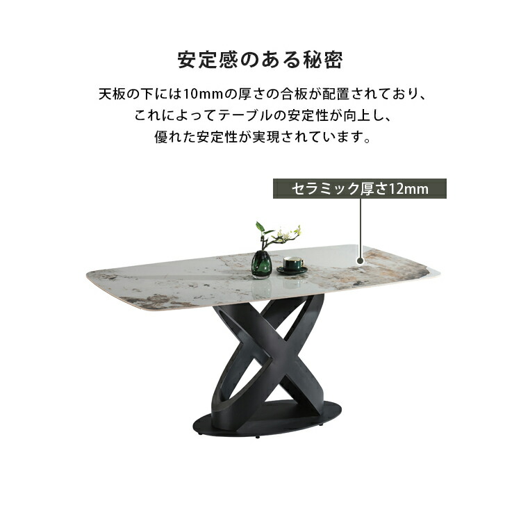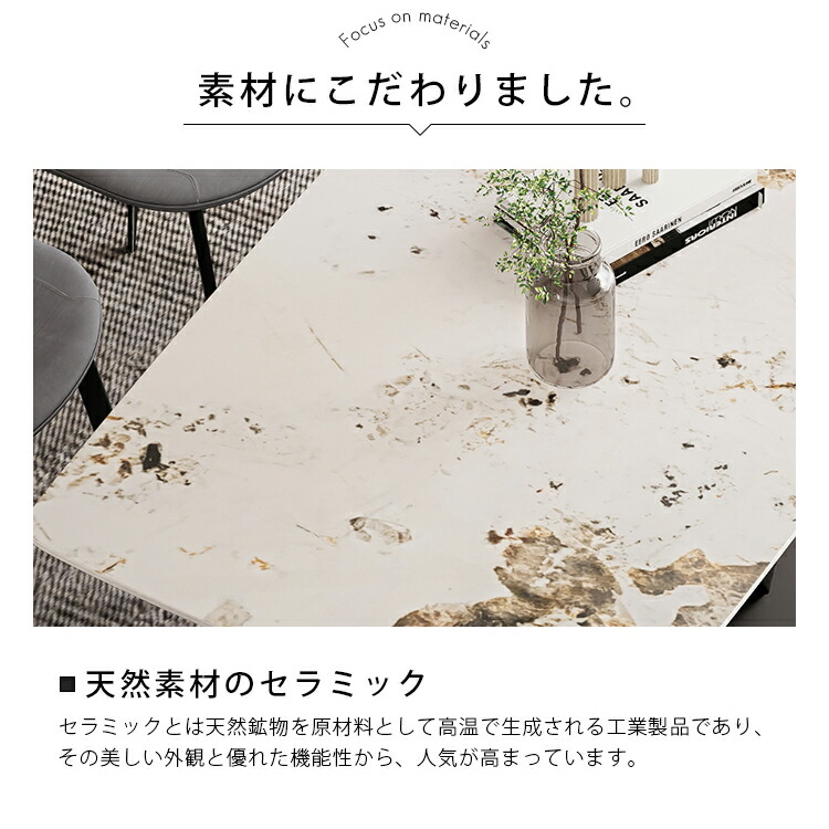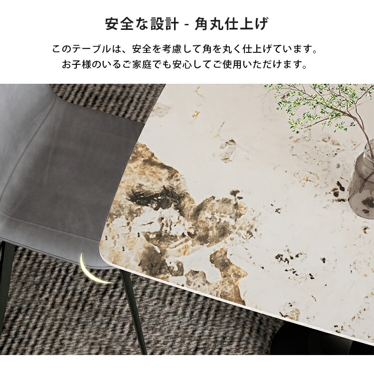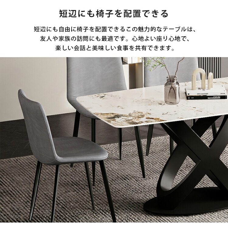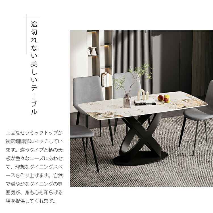 | おすすめのポイント | ■2つの異なるサイズと5つの色がご用意されており、お部屋の広さやテーブルの配置に合わせて最適な組み合わせをお選びいただけます。 ■モダンでスタイリッシュな脚はデザイン性があり、空間に特別なアクセントを加えます。 ■テーブルの角を丸くした安全に配慮した設計で、お子様のいるご家庭でも安心してご使用いただけます。 ■セラミック天板は高級感があり、耐久性も備えています。美しさと実用性を兼ね備えています。 ■長方形のテーブルは、多くの場所に適応する柔軟性があります。狭いスペースにも置くことができ、壁に沿って配置することも可能です。 ■短辺にも椅子を自由に配置できる魅力的なテーブル。友人や家族の訪問でも心配はありません 。 |