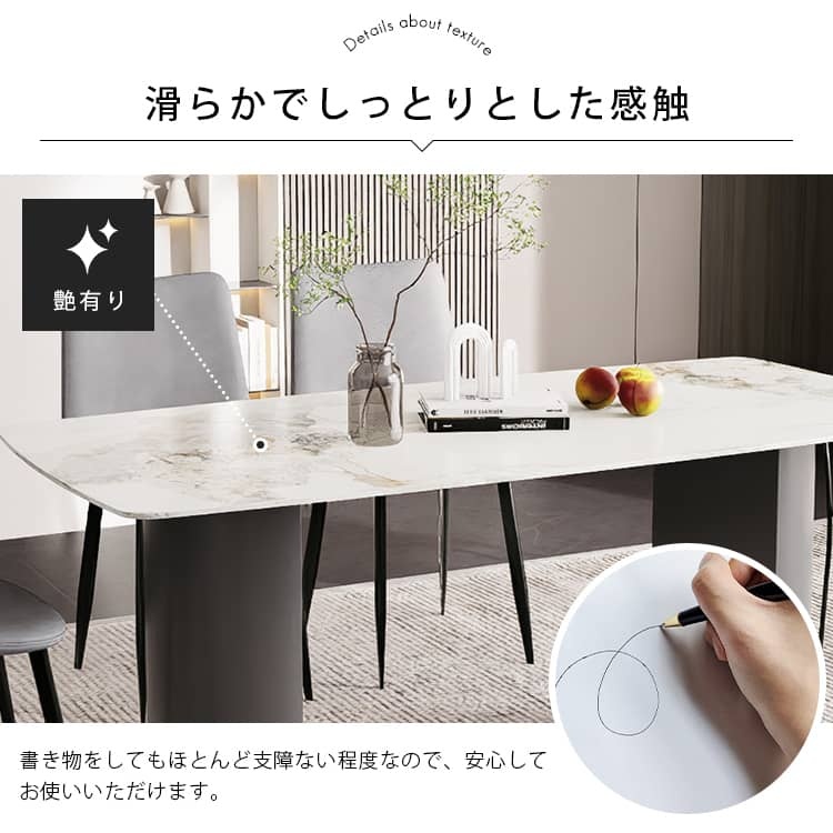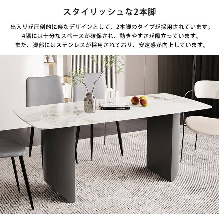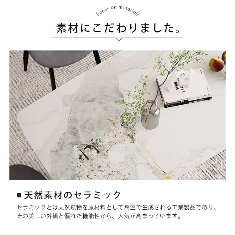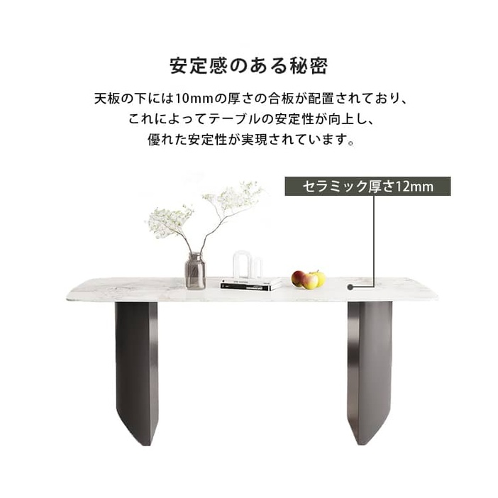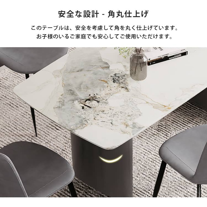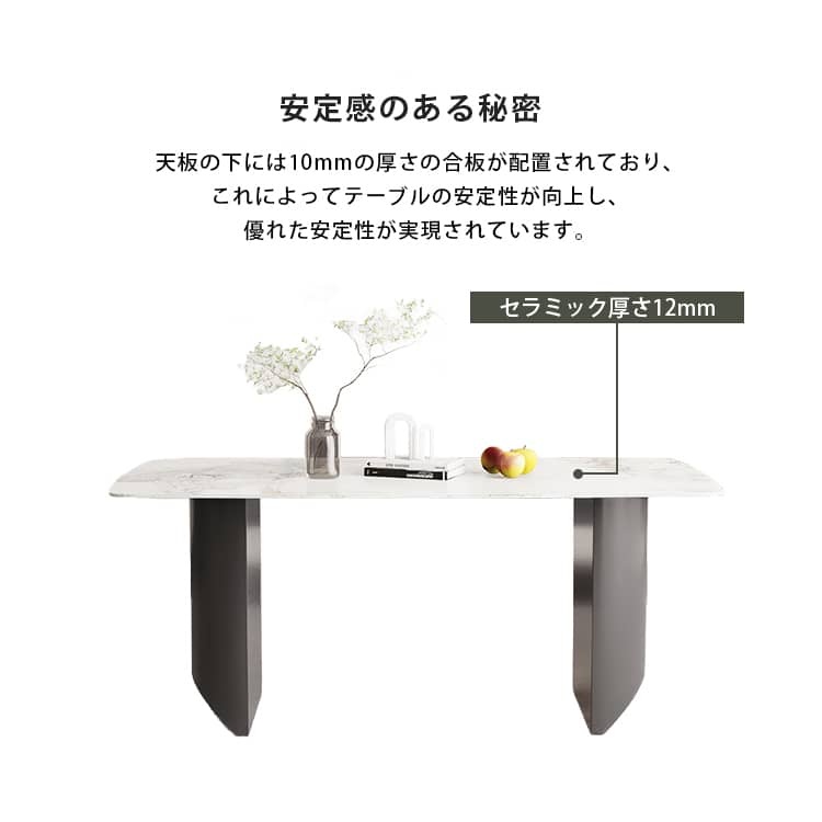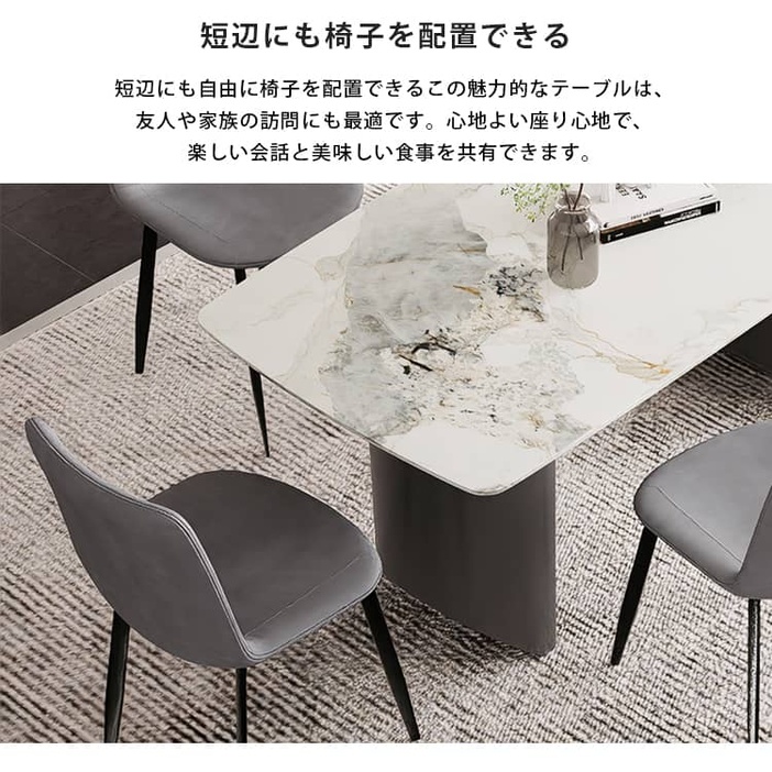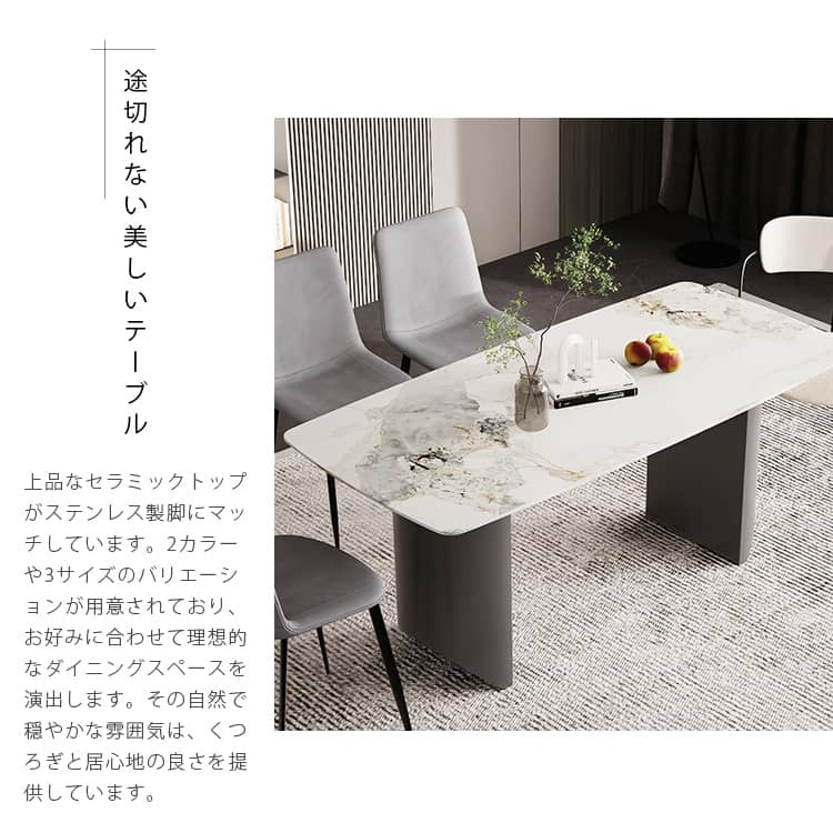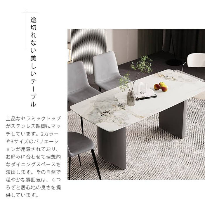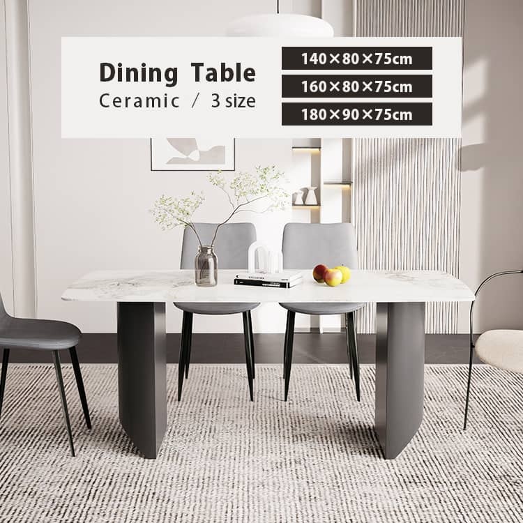 | おすすめのポイント | ■3つの異なるサイズと2つの色がご用意されており、お部屋の広さやテーブルの配置に合わせて最適な組み合わせをお選びいただけます。 ■モダンでスタイリッシュな脚はデザイン性があり、空間に特別なアクセントを加えます。 ■テーブルの角を丸くした安全に配慮した設計で、お子様のいるご家庭でも安心してご使用いただけます。 ■セラミック天板は高級感があり、耐久性も備えています。美しさと実用性を兼ね備えています。 ■長方形のテーブルは、多くの場所に適応する柔軟性があります。狭いスペースにも置くことができ、壁に沿って配置することも可能です。 ■短辺にも椅子を自由に配置できる魅力的なテーブル。友人や家族の訪問でも心配はありません 。 |