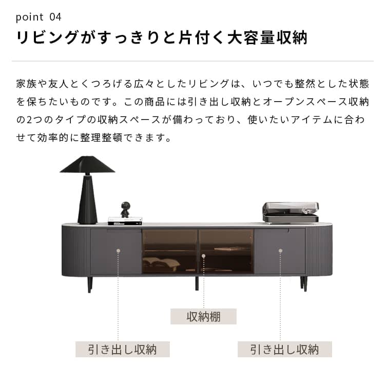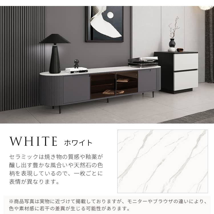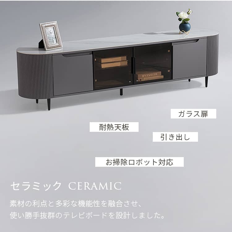 | おすすめのポイント | ■天板にはセラミックという素材を採用しており、耐久性が高く、長期間の使用に耐えることができます。 ■セラミックは汚れに強く、お手入れが簡単です。 ■収納スペースがたっぷりあり、綺麗にセパレートされた収納スペースには、雑誌や小物などをお気に入りのアイテムとして収納できます。 ■均等耐荷重は100kgあり、一人暮らし用の小型テレビからファミリー用の大型テレビまで、幅広いサイズのテレビを配置できます。 ■安全面にも配慮して、角丸や面取り加工を施しており、お子様がいるご家庭にもおすすめです。 ■また、テレビ台面から地面までの間隔を設けており、お掃除がしやすく、快適にご使用いただけます。 |