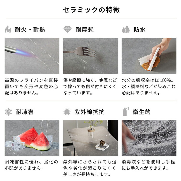 | 材質 | ■セラミック天板、炭素鋼脚、MDF、ガラス |