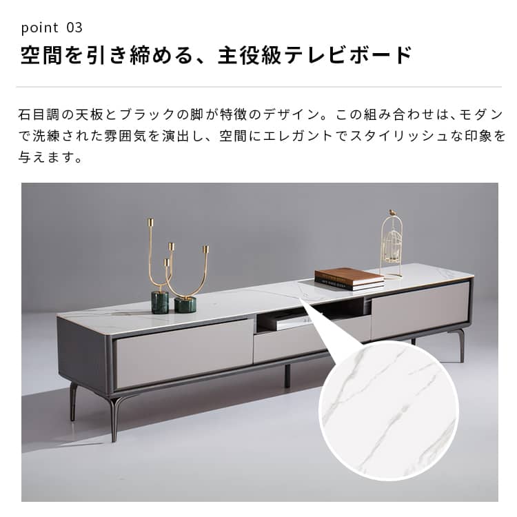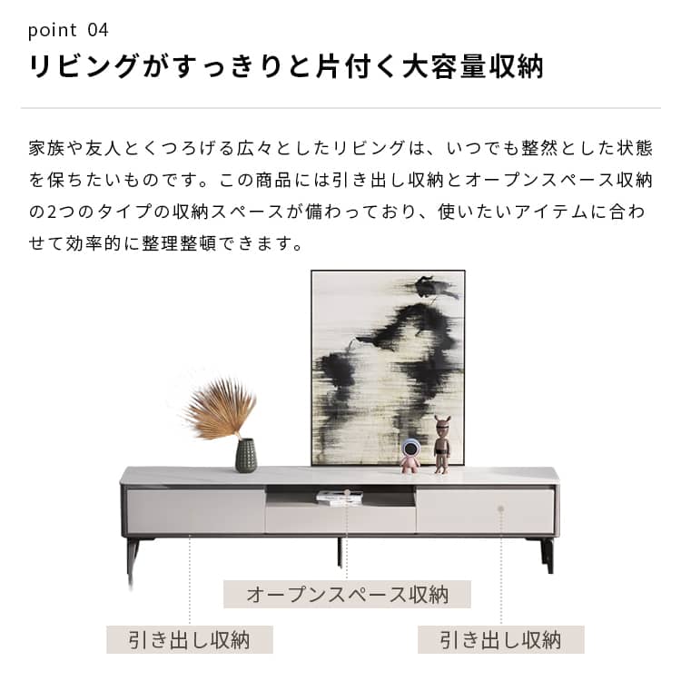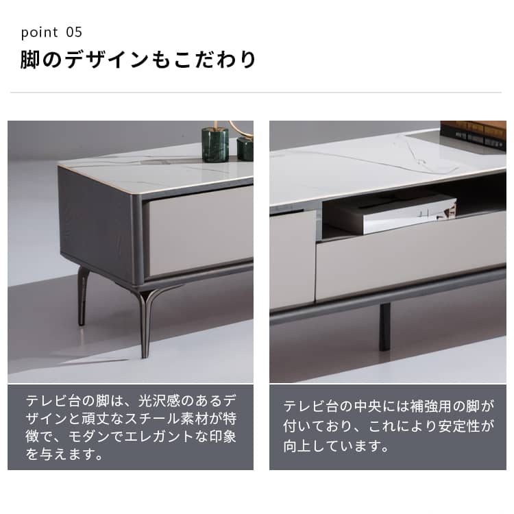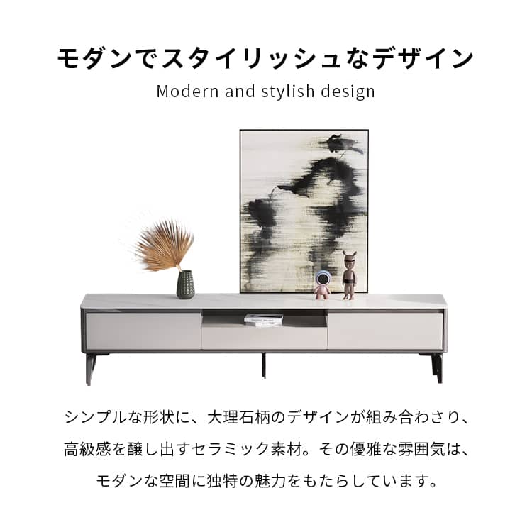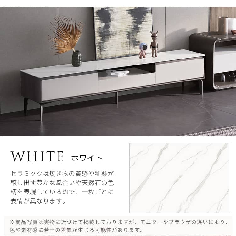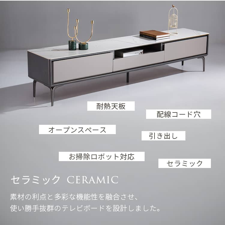 | おすすめのポイント | ■天板にはセラミックという素材を採用しており、耐久性が高く、長期間の使用に耐えることができます。 ■セラミックは汚れに強く、お手入れが簡単です。 ■収納スペースがたっぷりあり、綺麗にセパレートされた収納スペースには、雑誌や小物などをお気に入りのアイテムとして収納できます。 ■均等耐荷重は100kgあり、一人暮らし用の小型テレビからファミリー用の大型テレビまで、幅広いサイズのテレビを配置できます。 ■安全面にも配慮して、角丸や面取り加工を施しており、お子様がいるご家庭にもおすすめです。 ■また、テレビ台面から地面までの間隔を設けており、お掃除がしやすく、快適にご使用いただけます。 |