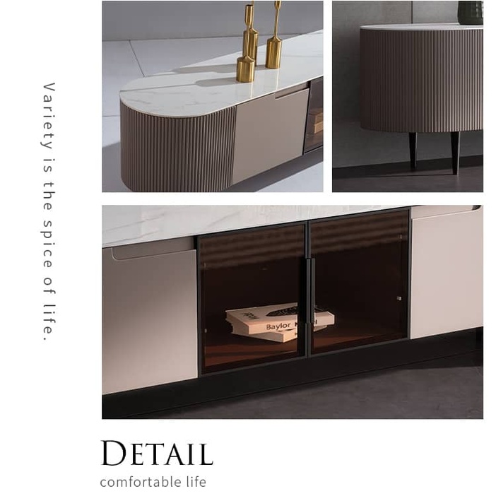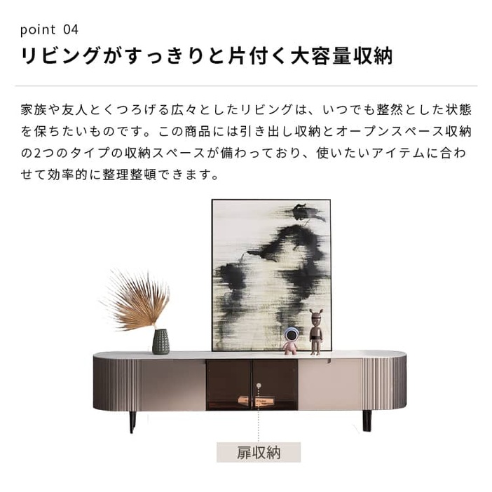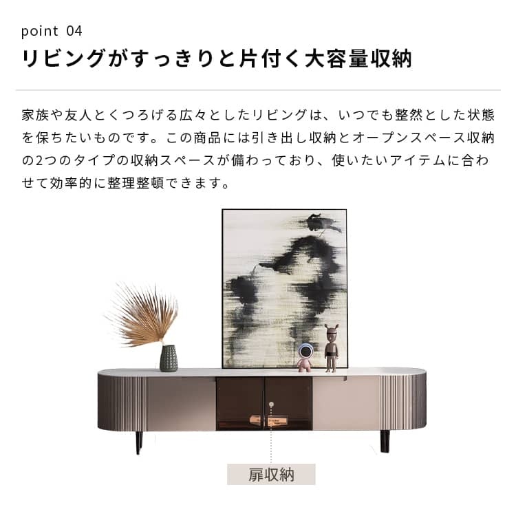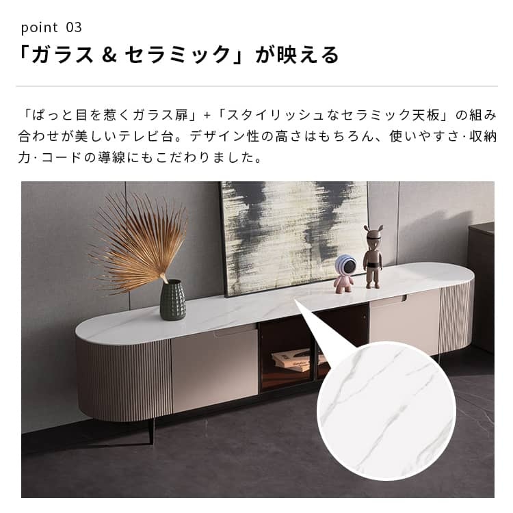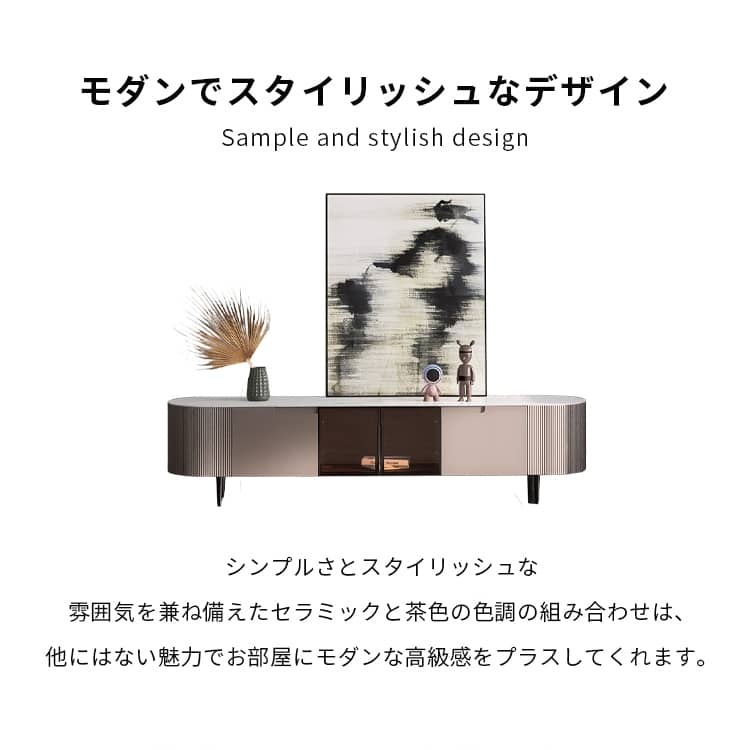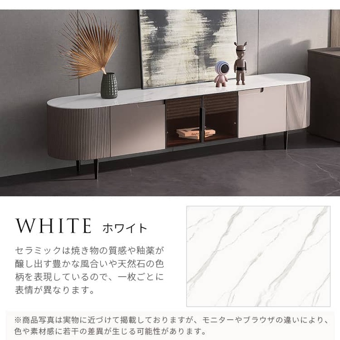 | おすすめのポイント | ■天板にはセラミックという素材を採用しており、耐久性が高く、長期間の使用に耐えることができます。 ■セラミックは汚れに強く、お手入れが簡単です。 ■収納スペースがたっぷりあり、綺麗にセパレートされた収納スペースには、雑誌や小物などをお気に入りのアイテムとして収納できます。 ■均等耐荷重は100kgあり、一人暮らし用の小型テレビからファミリー用の大型テレビまで、幅広いサイズのテレビを配置できます。 ■安全面にも配慮して、角丸や面取り加工を施しており、お子様がいるご家庭にもおすすめです。 ■また、テレビ台面から地面までの間隔を設けており、お掃除がしやすく、快適にご使用いただけます。 |