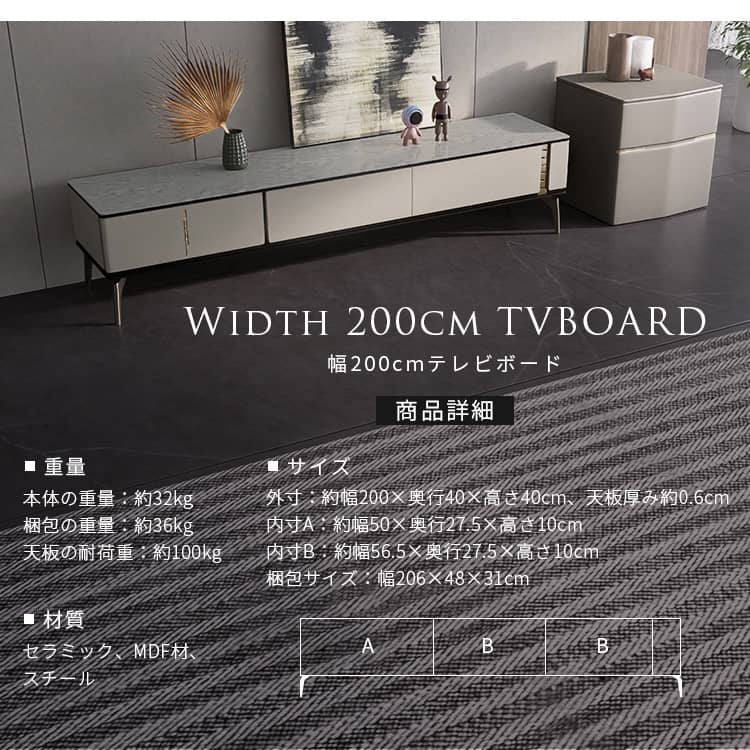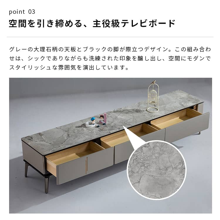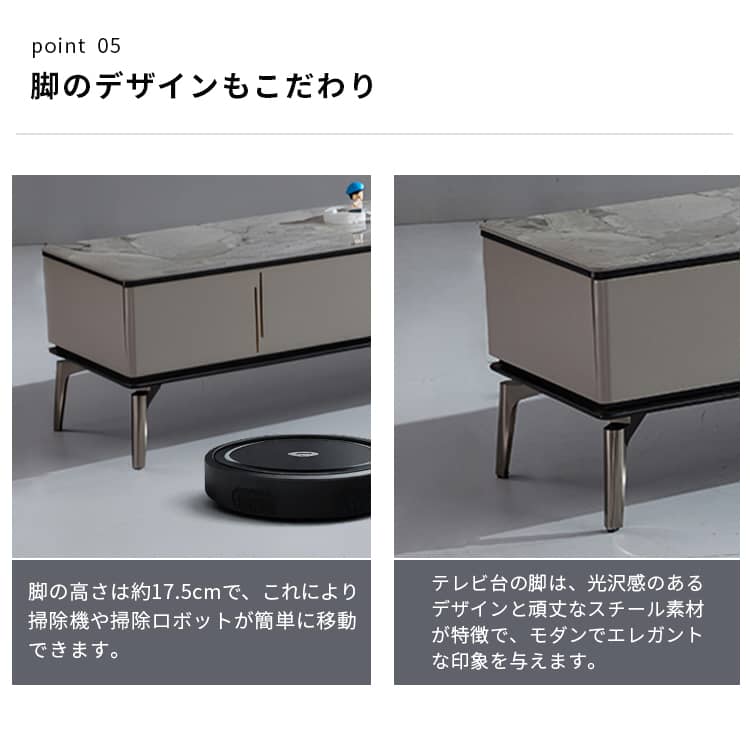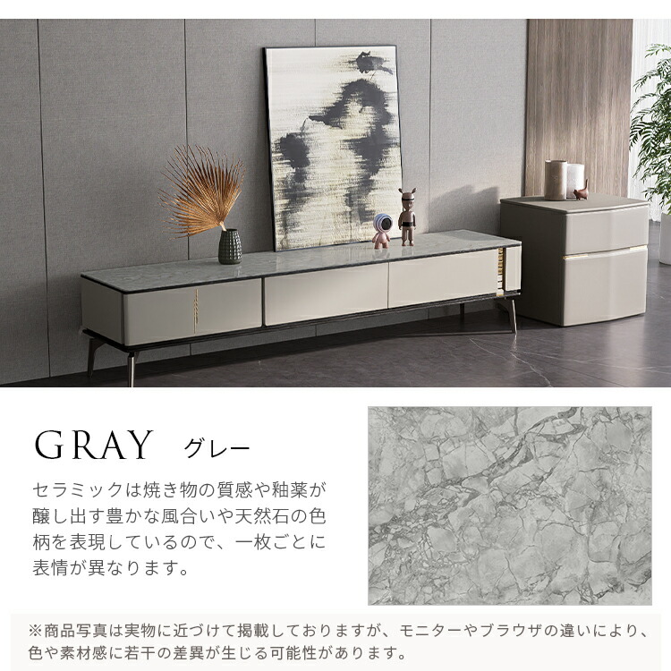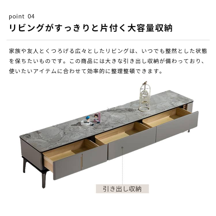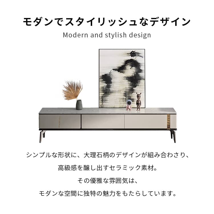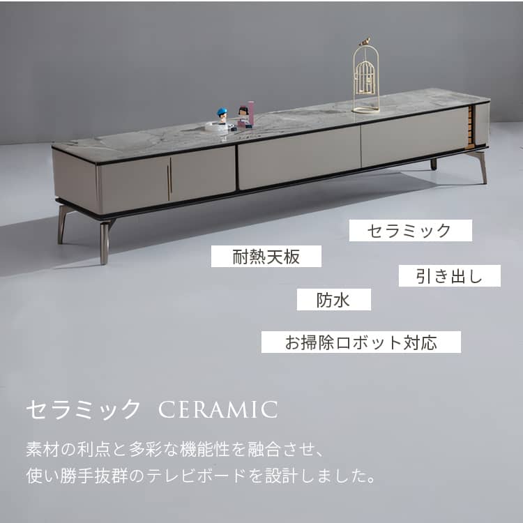 | おすすめのポイント | ■天板にはセラミックという素材を採用しており、耐久性が高く、長期間の使用に耐えることができます。 ■セラミックは汚れに強く、お手入れが簡単です。 ■収納スペースがたっぷりあり、綺麗にセパレートされた収納スペースには、雑誌や小物などをお気に入りのアイテムとして収納できます。 ■均等耐荷重は100kgあり、一人暮らし用の小型テレビからファミリー用の大型テレビまで、幅広いサイズのテレビを配置できます。 ■安全面にも配慮して、角丸や面取り加工を施しており、お子様がいるご家庭にもおすすめです。 ■また、テレビ台面から地面までの間隔を設けており、お掃除がしやすく、快適にご使用いただけます。 |