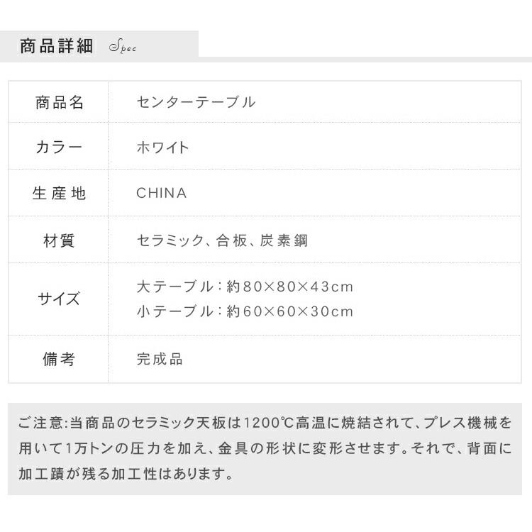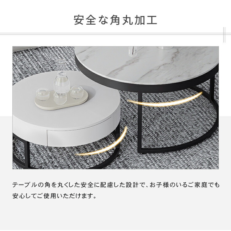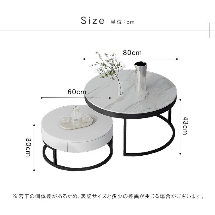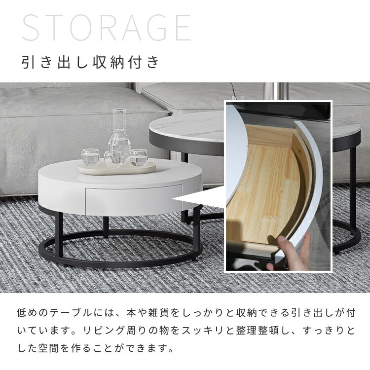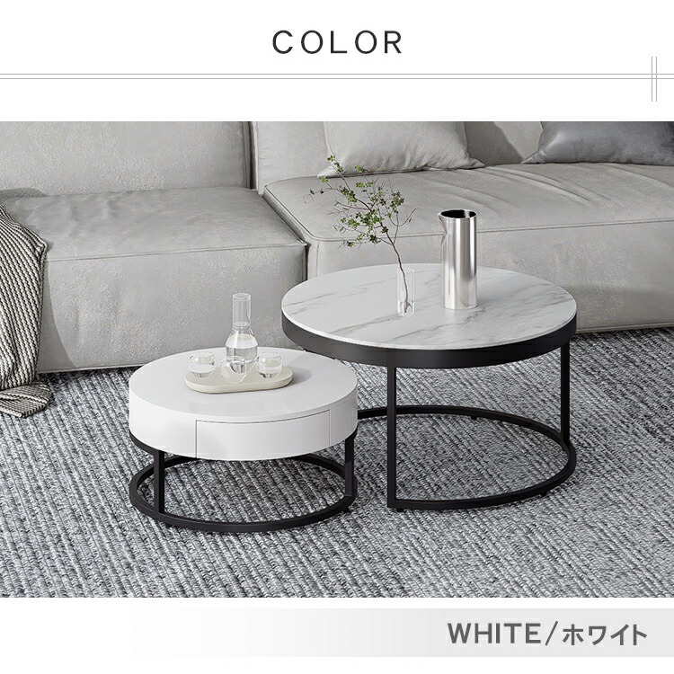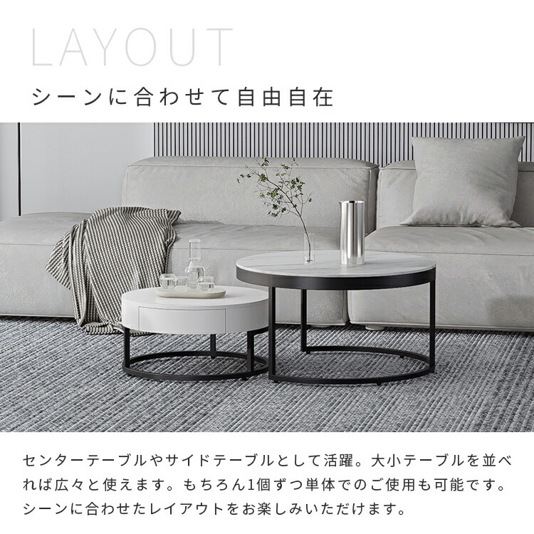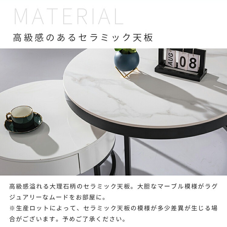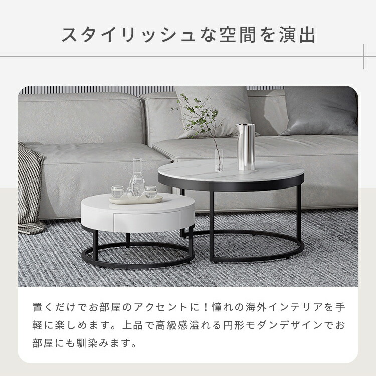 | おすすめのポイント | ■憧れの海外風インテリアのような、大理石柄の天板と細いスチール脚を組み合わせたネストテーブル。シンプルで洗練されたデザインが、インテリアのアクセントとなり理想のお部屋へと導いてくれます。 ■人気の大理石テーブルシリーズに、すっきりとした円形タイプが登場。四角形タイプ同様、モダンテイストをお部屋に演出しつつも、丸ならではの優しく親しみやすい雰囲気をプラスします。 ■四角形のテーブルに比べて、少しコンパクトに設計されているこの円形テーブル。さらに角がない分コンパクトなサイズになったことで、置く場所に視覚的なゆとりももたらします。 ■小テーブルを少し重ねて広めに使えば、あらゆる物をたっぷり置けるワイドサイズに。幅を調整できるので来客時など、様々なシーンで活躍します。 ■重ねて使うのはもちろん、同じお部屋や違うお部屋にバラバラに置いて使えるのも特徴です。 ■全体をスマートに引き締める、細めのブラック脚。圧迫感がなく、スタイリッシュな空間を演出します。 |