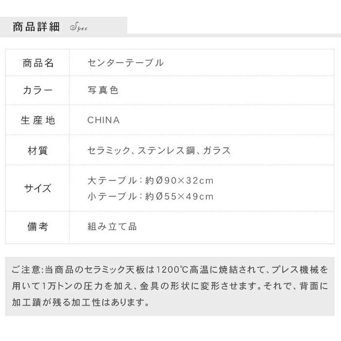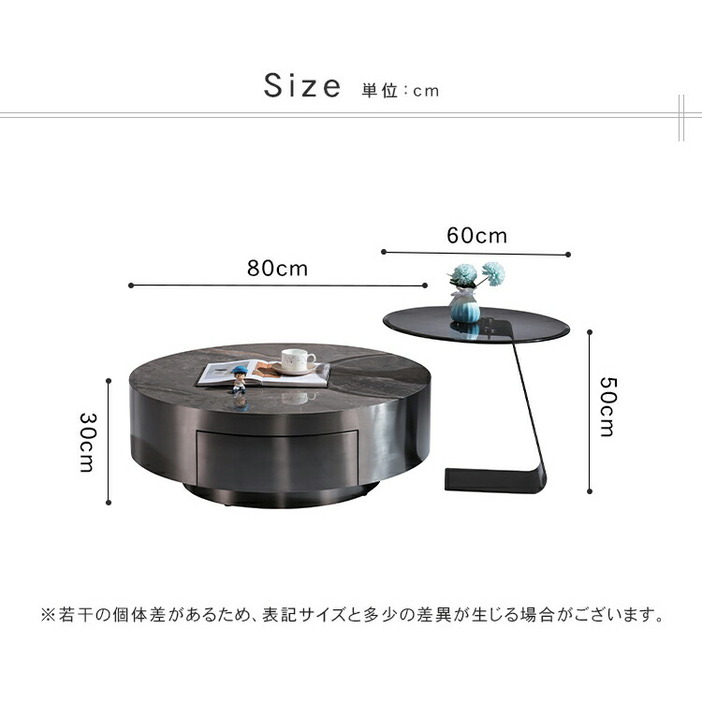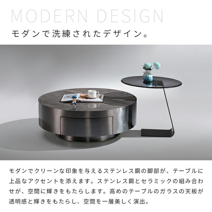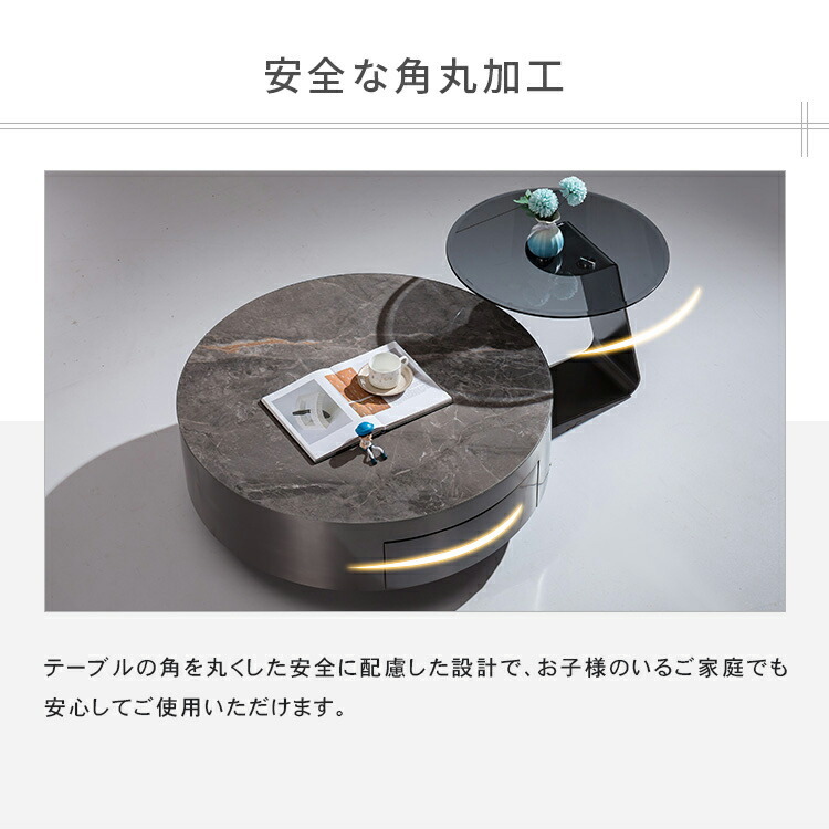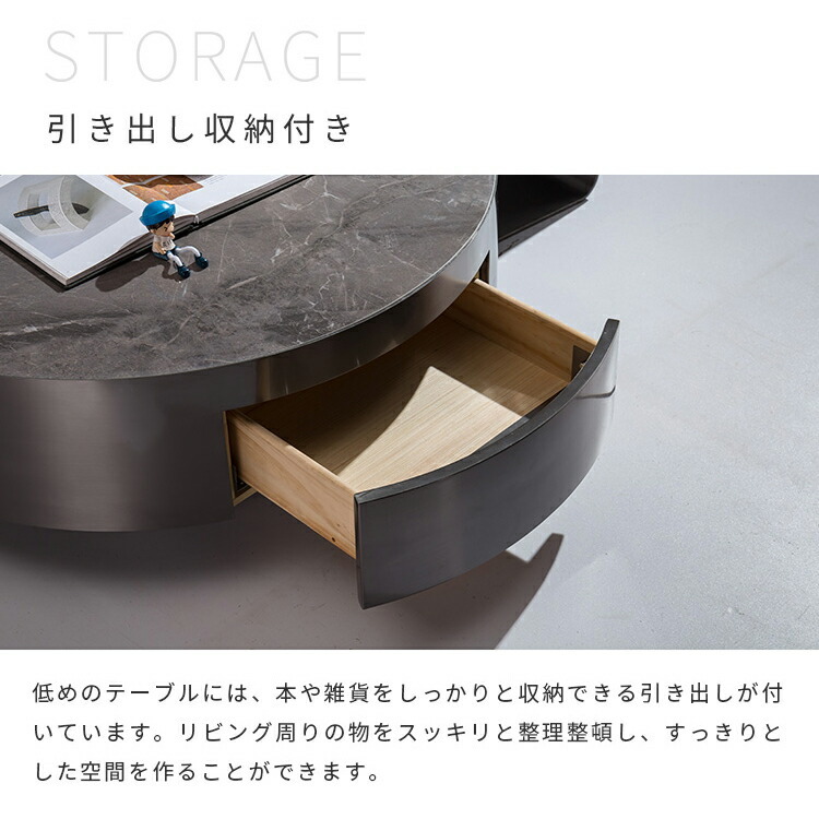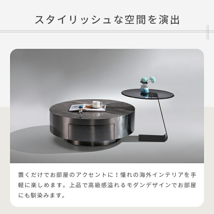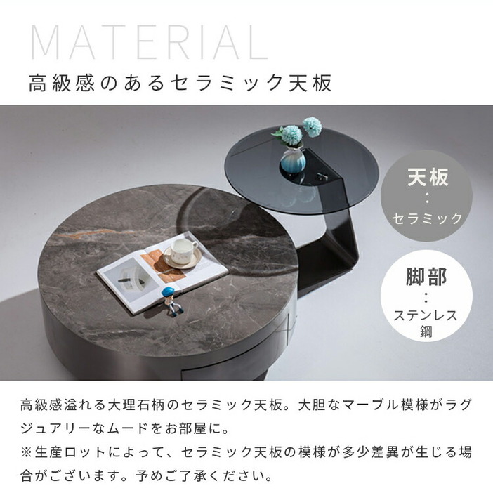 | おすすめのポイント | ■角を丸くした安全に配慮した設計で、お子様のいるご家庭でも安心してご使用いただけます。 ■置くだけでお部屋のアクセントに!憧れの海外インテリアを手軽に楽しめます。上品で高級感溢れる円形モダンデザインでお部屋にも馴染みます。 ■グレーの色調がどんなインテリアにも調和し、空間を一層明るく演出します。 ■高級感溢れる大理石柄のセラミック天板。大胆なマーブル模様がラグジュアリーなムードをお部屋に。 ■本や雑貨をしっかりと収納できる引き出しが付いています。リビング周りの物をスッキリと整理整頓し、すっきりとした空間を作ることができます。 ■センターテーブルやサイドテーブルとして活躍。大小テーブルを並べれば広々と使えます。もちろん1個ずつ単体でのご使用も可能です。シーンに合わせたレイアウトをお楽しみいただけます。 |