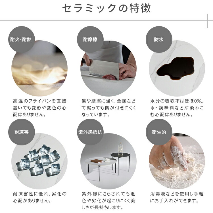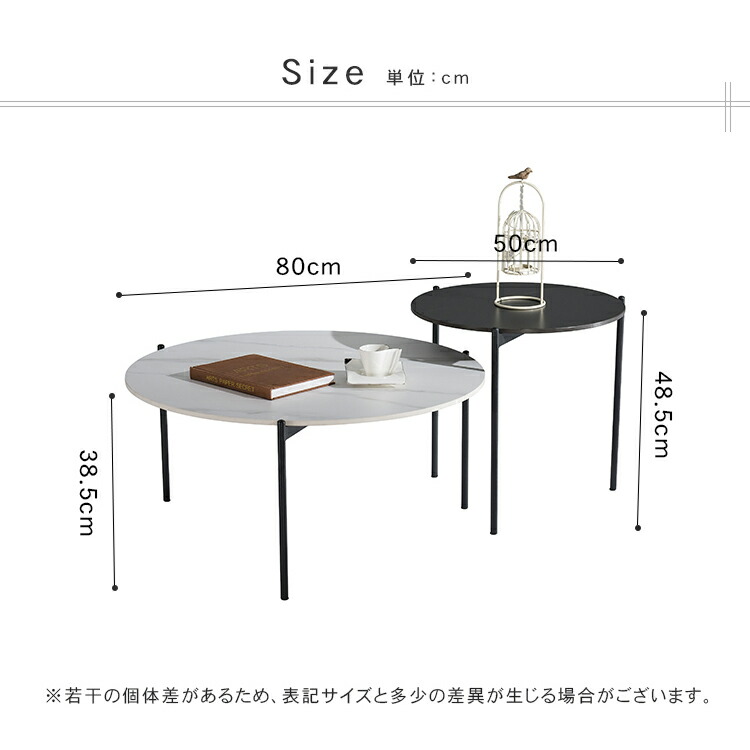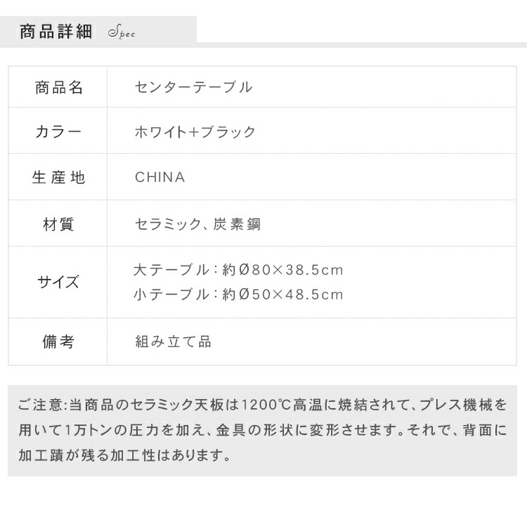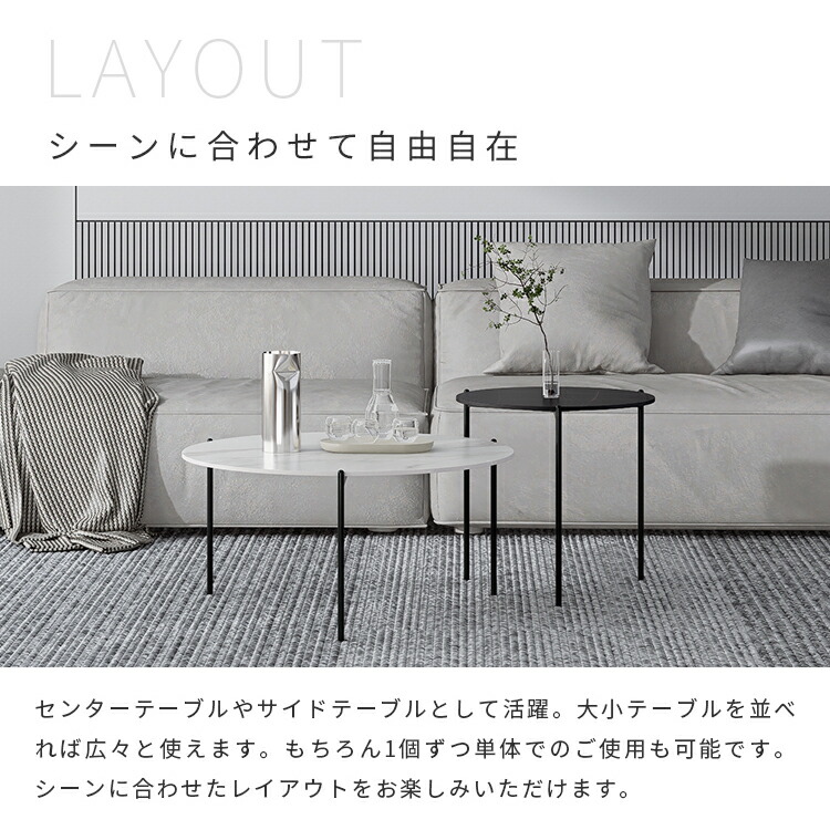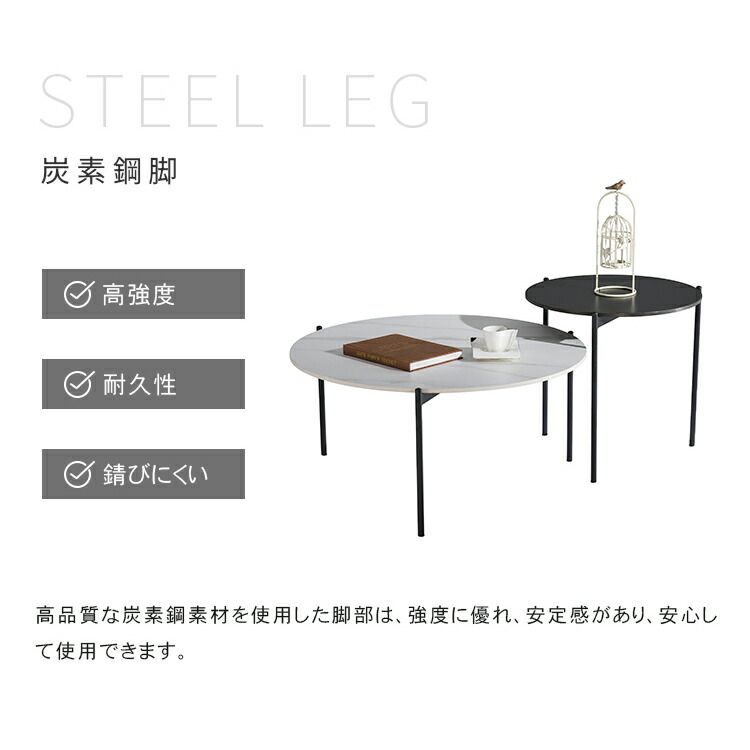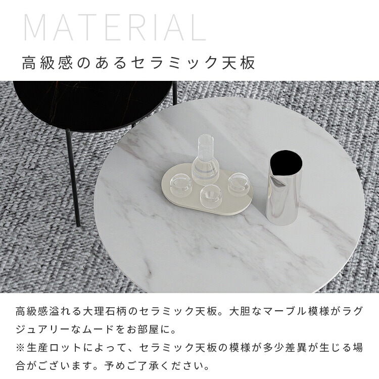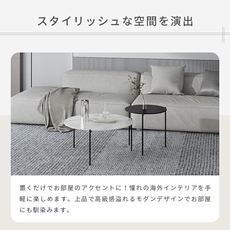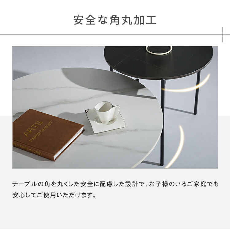 | おすすめのポイント | ■角丸設計:角を丸くした安全に配慮した設計で、お子様のいるご家庭でも安心してご使用いただけます。 ■高品質なセラミック天板:耐久性があり、傷つきにくく、お手入れが簡単。美しいデザインでお部屋に上品な雰囲気をもたらします。 ■頑丈な炭素鋼脚:安定感のある構造で、長く安心してご利用いただけます。シンプルでモダンなデザインが特徴です。 ■力学的に安定した構造:3本の足は力学的に安定した構造で、テーブル全体がしっかりと安定しています。 ■センターテーブルやサイドテーブルとして活躍:大小テーブルを並べれば広々と使えます。もちろん1個ずつ単体でのご使用も可能です。シーンに合わせたレイアウトをお楽しみいただけます。 |