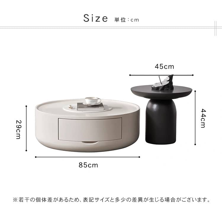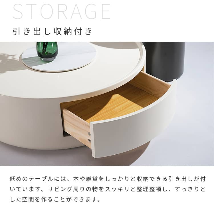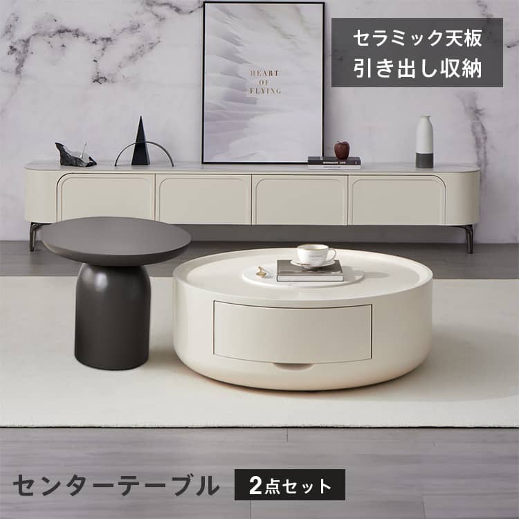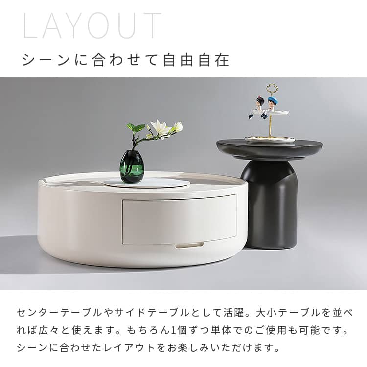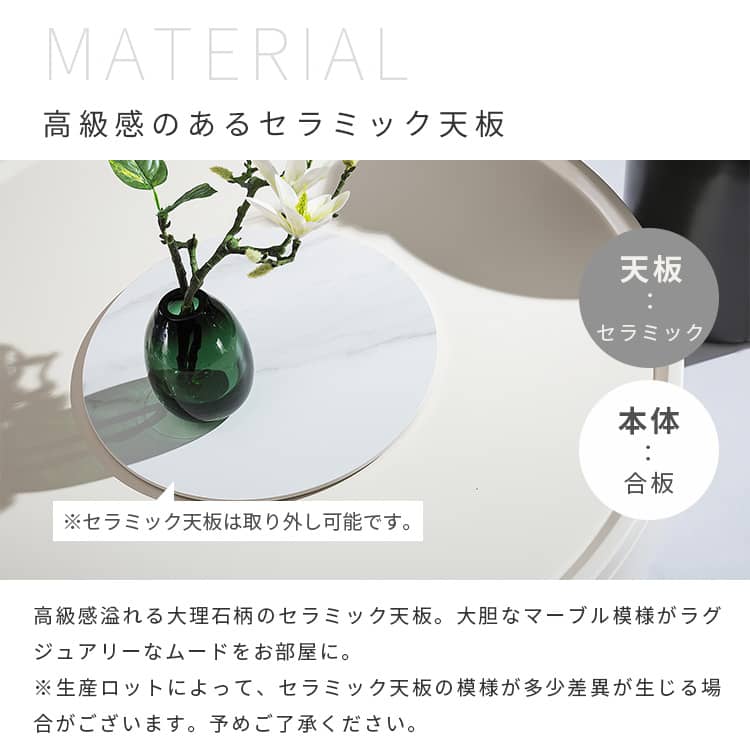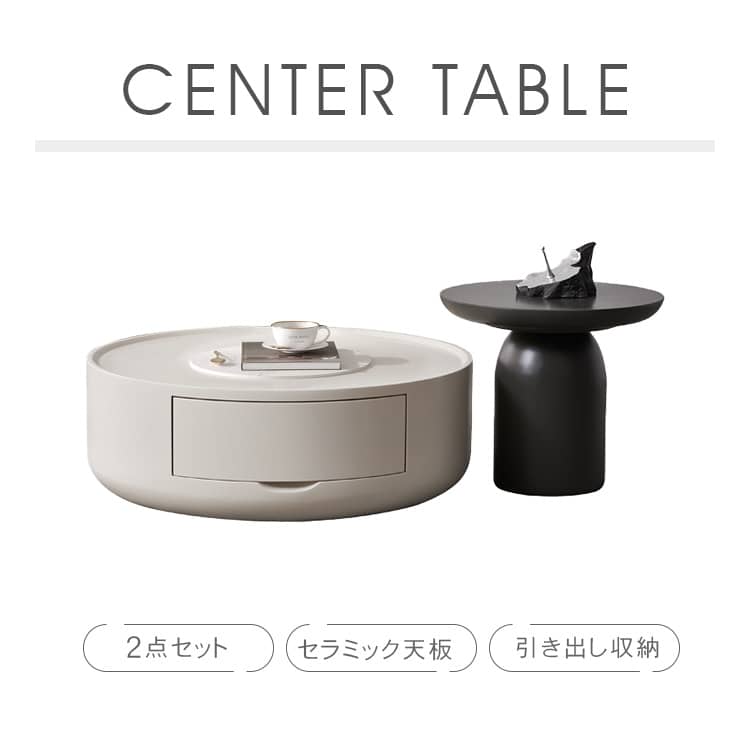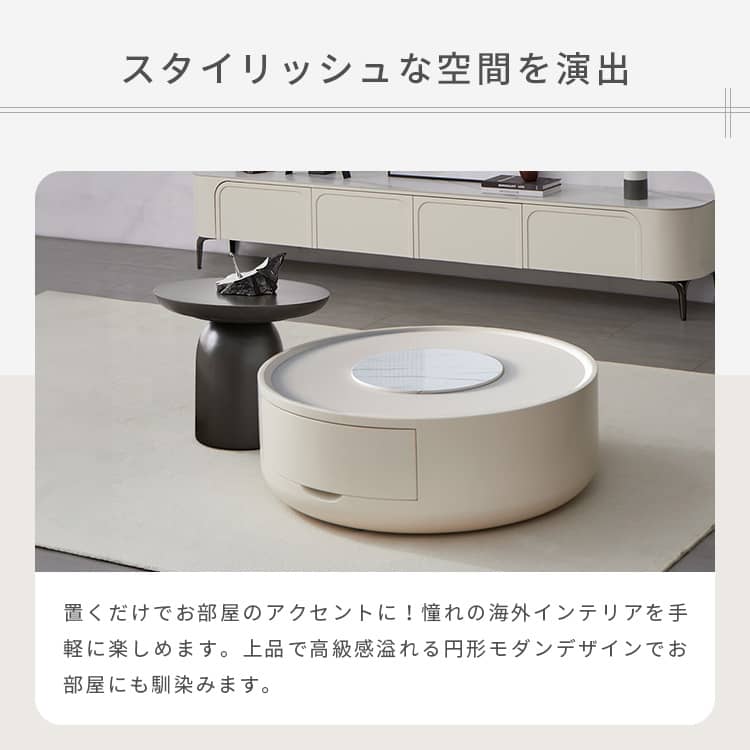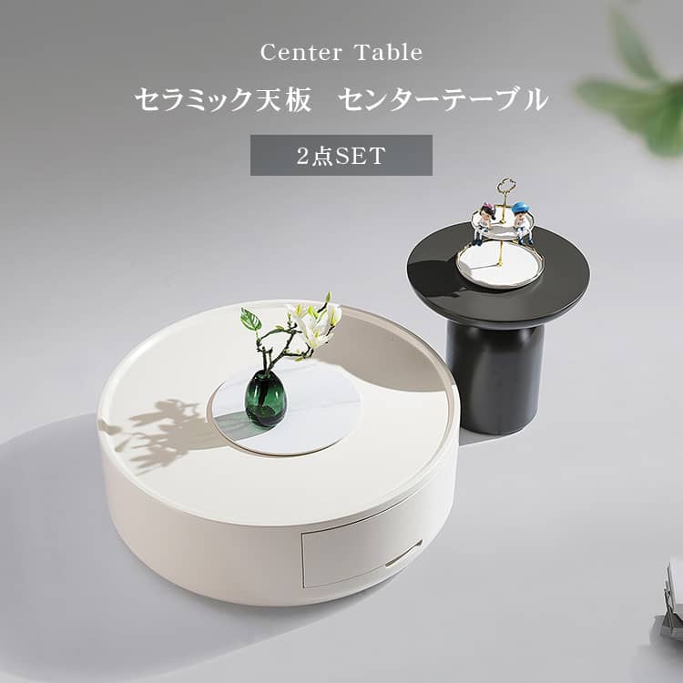 | おすすめのポイント | ■角を丸くした安全に配慮した設計で、お子様のいるご家庭でも安心してご使用いただけます。 ■置くだけでお部屋のアクセントに!憧れの海外インテリアを手軽に楽しめます。上品で高級感溢れる円形モダンデザインでお部屋にも馴染みます。 ■ホワイトとブラックの色調がどんなインテリアにも調和し、空間を一層明るく演出します。 ■高級感溢れる大理石柄のセラミック天板。大胆なマーブル模様がラグジュアリーなムードをお部屋に。 ■本や雑貨をしっかりと収納できる引き出しが付いています。リビング周りの物をスッキリと整理整頓し、すっきりとした空間を作ることができます。 ■センターテーブルやサイドテーブルとして活躍。大小テーブルを並べれば広々と使えます。もちろん1個ずつ単体でのご使用も可能です。シーンに合わせたレイアウトをお楽しみいただけます。 |