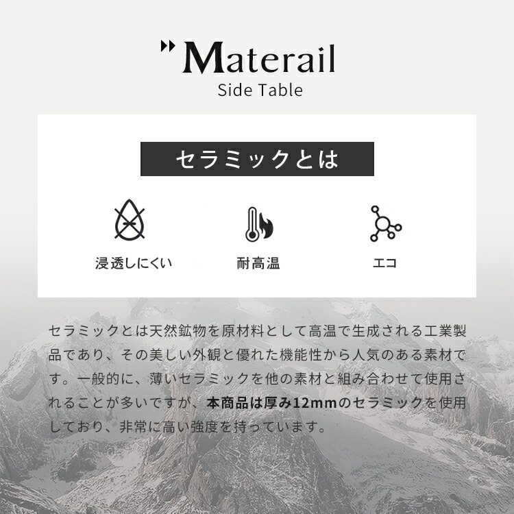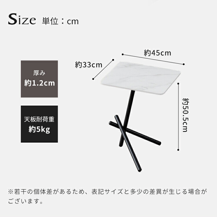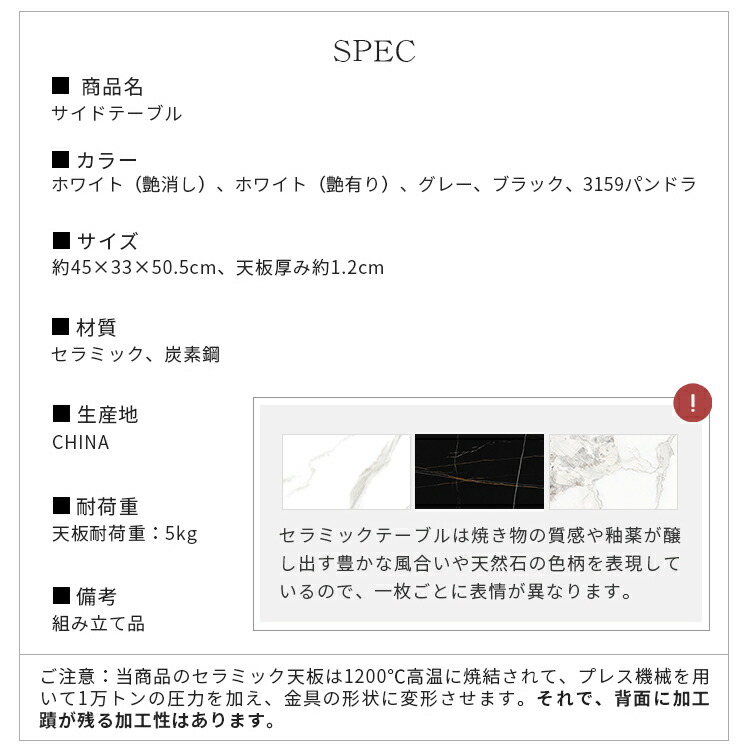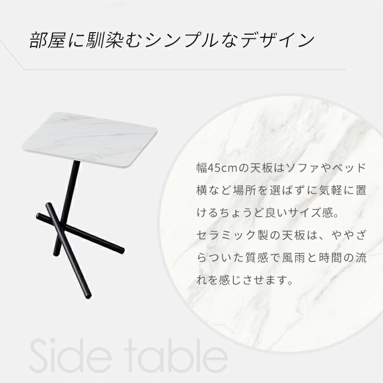 | おすすめのポイント | ■角を丸くした安全に配慮した設計で、お子様のいるご家庭でも安心してご使用いただけます。 ■置くだけでお部屋のアクセントに!憧れの海外インテリアを手軽に楽しめます。上品で高級感溢れるモダンデザインでお部屋にも馴染みます。 ■お好みやお部屋の雰囲気に合わせて選べる5つのカラーオプション。おしゃれなデザインと調和させてください。 ■高級感溢れる大理石柄のセラミック天板。大胆なマーブル模様がラグジュアリーなムードをお部屋に。 ■天板は、幅45cmの少し大きめの使いやすいサイズ感に仕上げました。 |