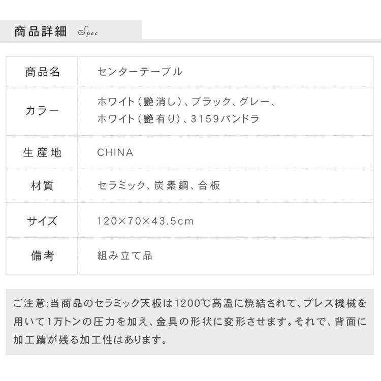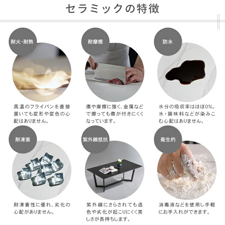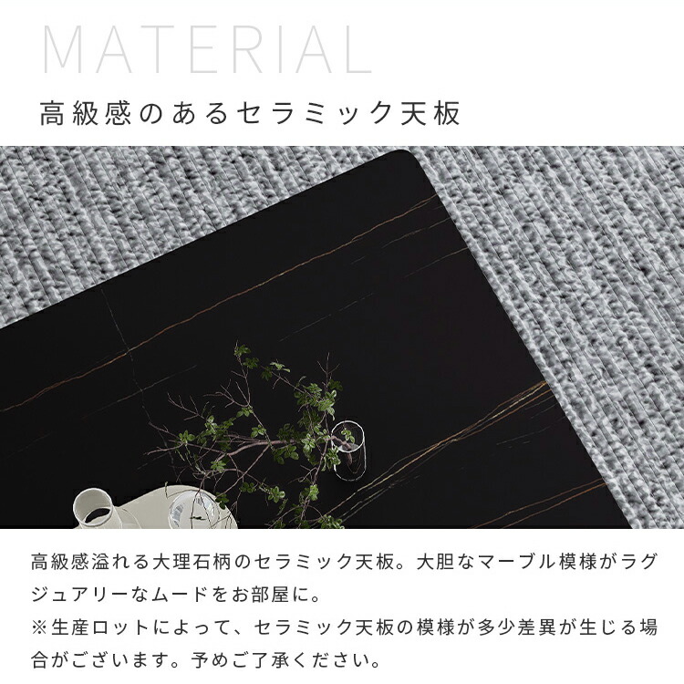 | おすすめのポイント | ■角丸設計:角を丸くした安全に配慮した設計で、お子様のいるご家庭でも安心してご使用いただけます。 ■5つのカラーバリエーション:お好みやお部屋の雰囲気に合わせて選べる5つのカラーオプション。おしゃれなデザインと調和させてください。 ■高品質なセラミック天板:耐久性があり、傷つきにくく、お手入れが簡単。美しいデザインでお部屋に上品な雰囲気をもたらします。 ■高級感溢れる大理石柄のセラミック天板。大胆なマーブル模様がラグジュアリーなムードをお部屋に。 ■頑丈な炭素鋼脚:安定感のある構造で、長く安心してご利用いただけます。シンプルでモダンなデザインが特徴です。 ■使いやすい120cmの幅:コンパクトながらも広めの天板で、お部屋に置きやすく、様々なインテリアにマッチします。 |