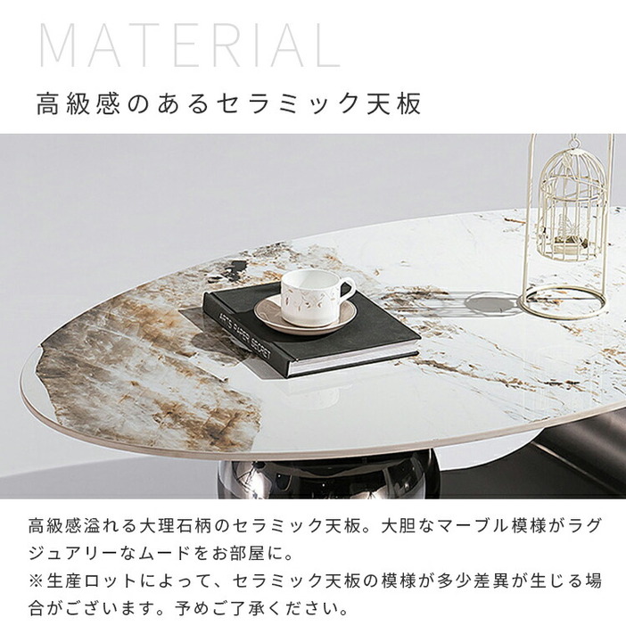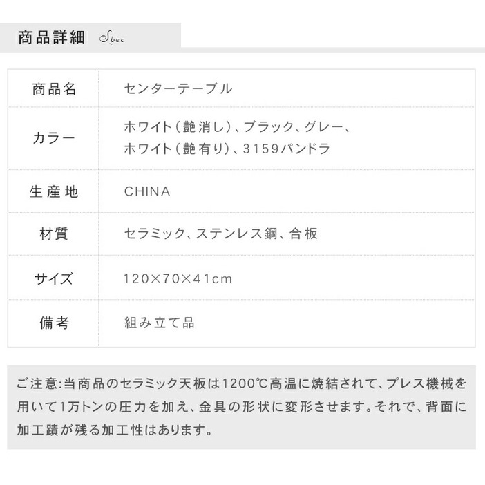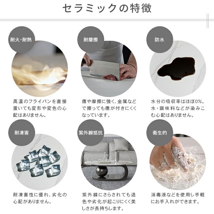| おすすめのポイント | ■角丸設計:角を丸くした安全に配慮した設計で、お子様のいるご家庭でも安心してご使用いただけます。 ■5つのカラーバリエーション:お好みやお部屋の雰囲気に合わせて選べる5つのカラーオプション。おしゃれなデザインと調和させてください。 ■高品質なセラミック天板:耐久性があり、傷つきにくく、お手入れが簡単。美しいデザインでお部屋に上品な雰囲気をもたらします。 ■頑丈なステンレス脚:安定感のある構造で、長く安心してご利用いただけます。シンプルでモダンなデザインが特徴です。 ■使いやすい120cmの幅:コンパクトながらも広めの天板で、お部屋に置きやすく、様々なインテリアにマッチします。 |