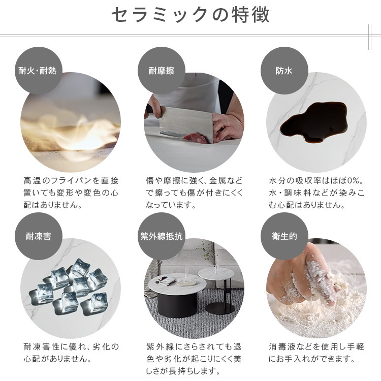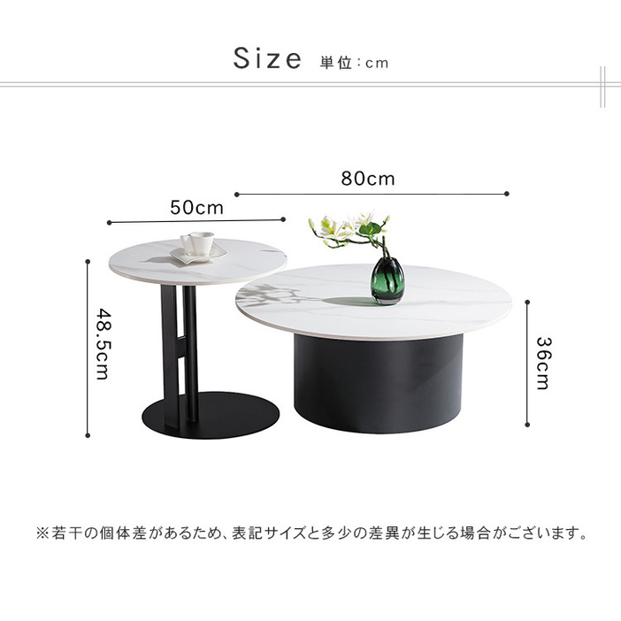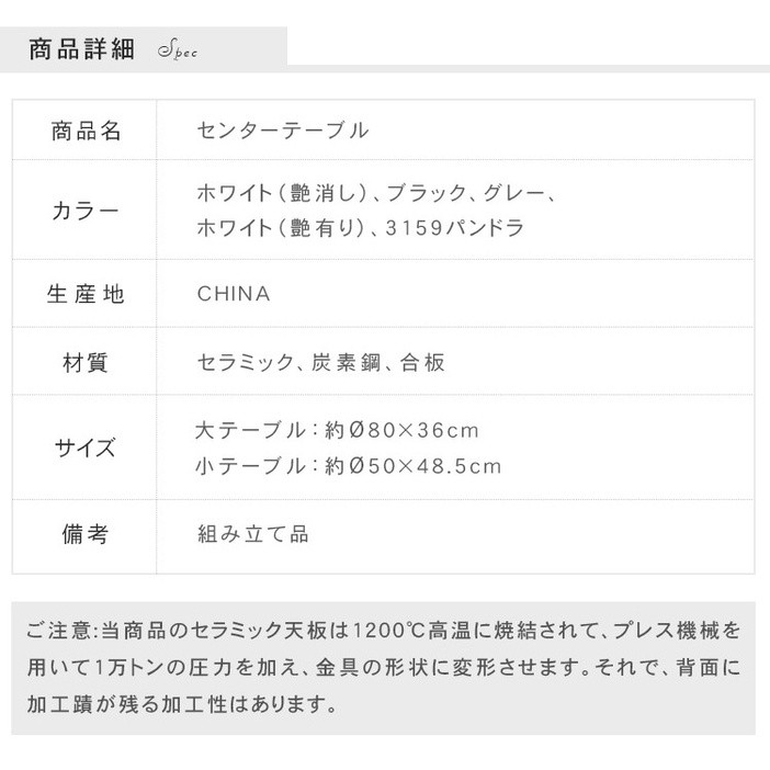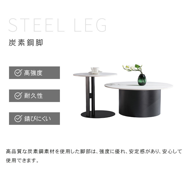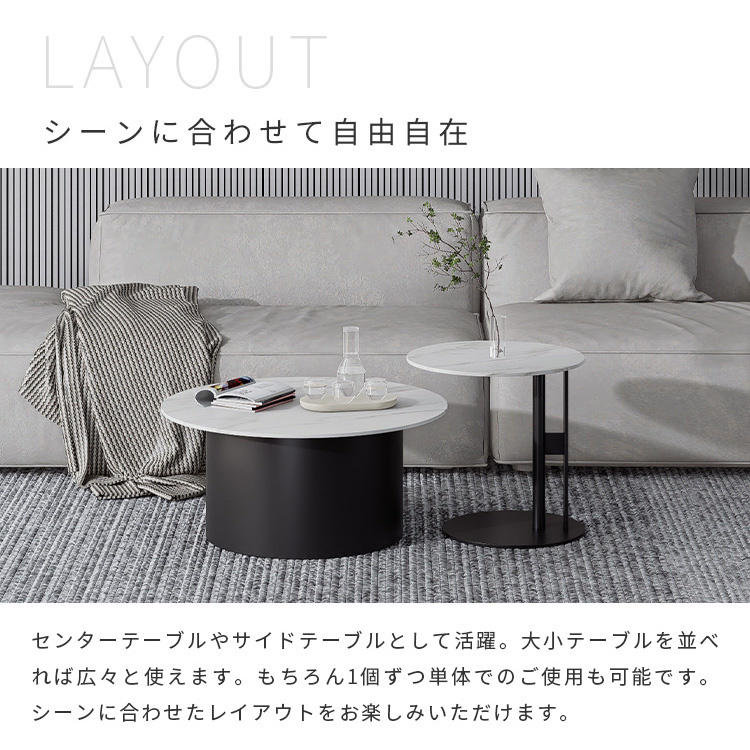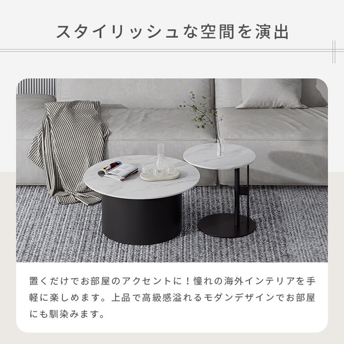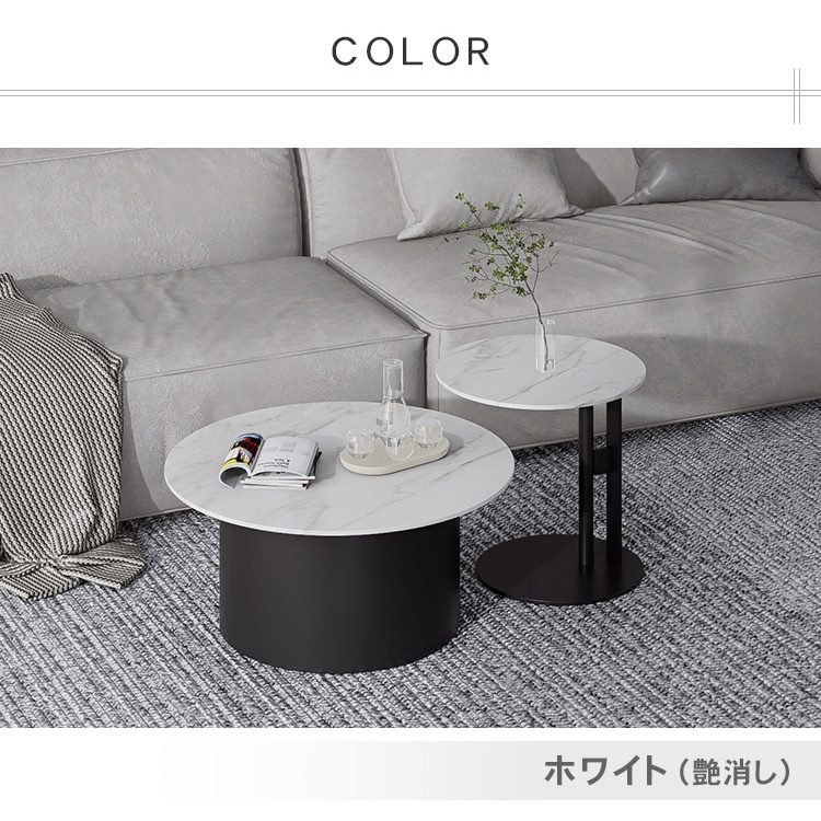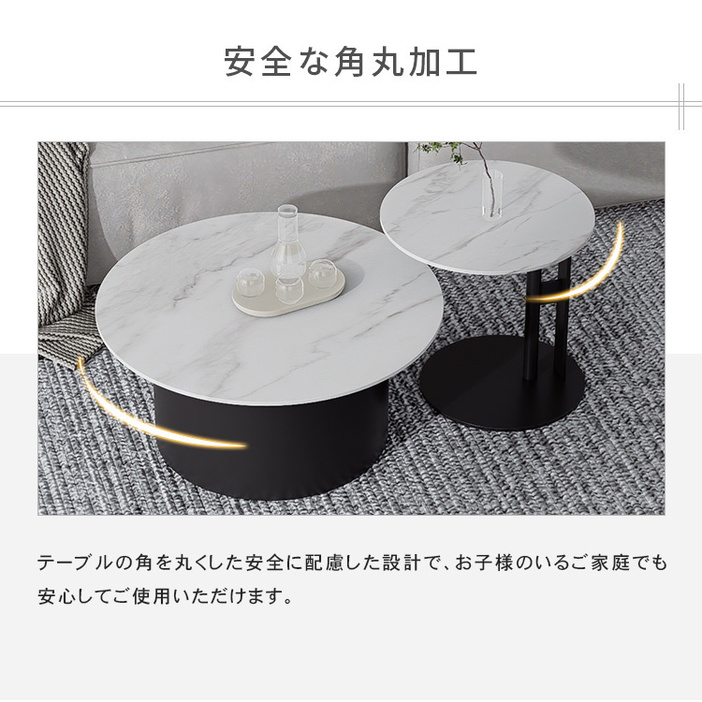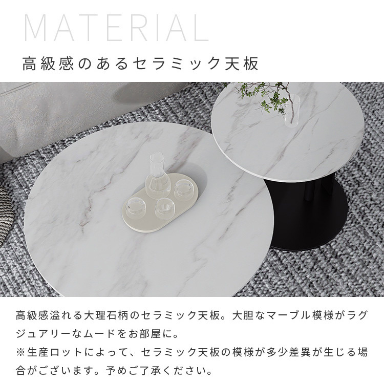 | おすすめのポイント | ■角丸設計:角を丸くした安全に配慮した設計で、お子様のいるご家庭でも安心してご使用いただけます。 ■5つのカラーバリエーション:お好みやお部屋の雰囲気に合わせて選べる5つのカラーオプション。おしゃれなデザインと調和させてください。 ■高品質なセラミック天板:耐久性があり、傷つきにくく、お手入れが簡単。美しいデザインでお部屋に上品な雰囲気をもたらします。 ■頑丈なステンレス脚:安定感のある構造で、長く安心してご利用いただけます。シンプルでモダンなデザインが特徴です。 ■センターテーブルやサイドテーブルとして活躍:大小テーブルを並べれば広々と使えます。もちろん1個ずつ単体でのご使用も可能です。シーンに合わせたレイアウトをお楽しみいただけます。 |