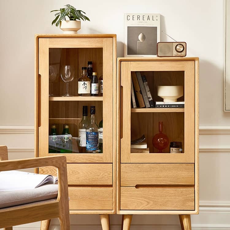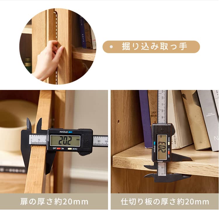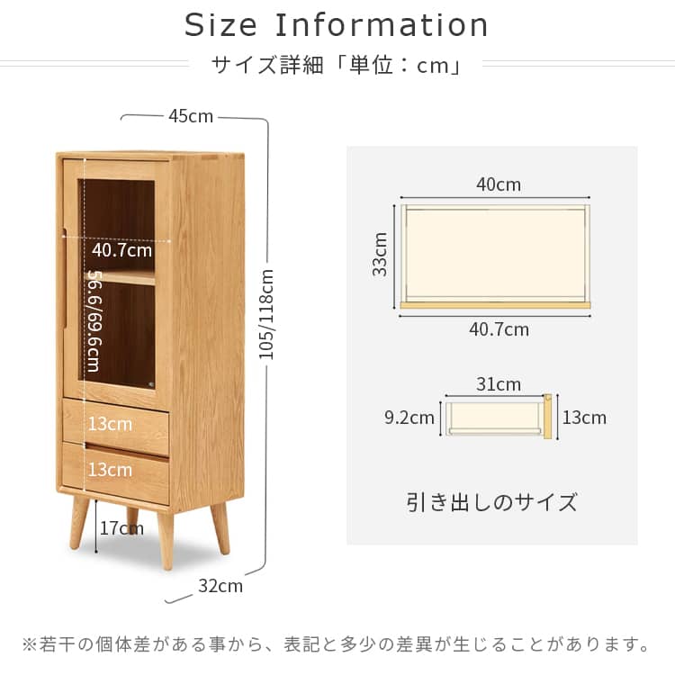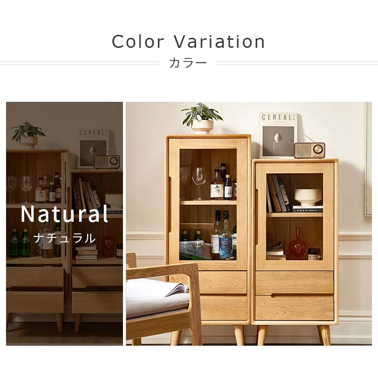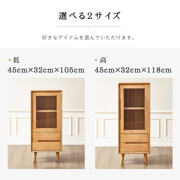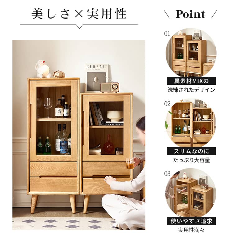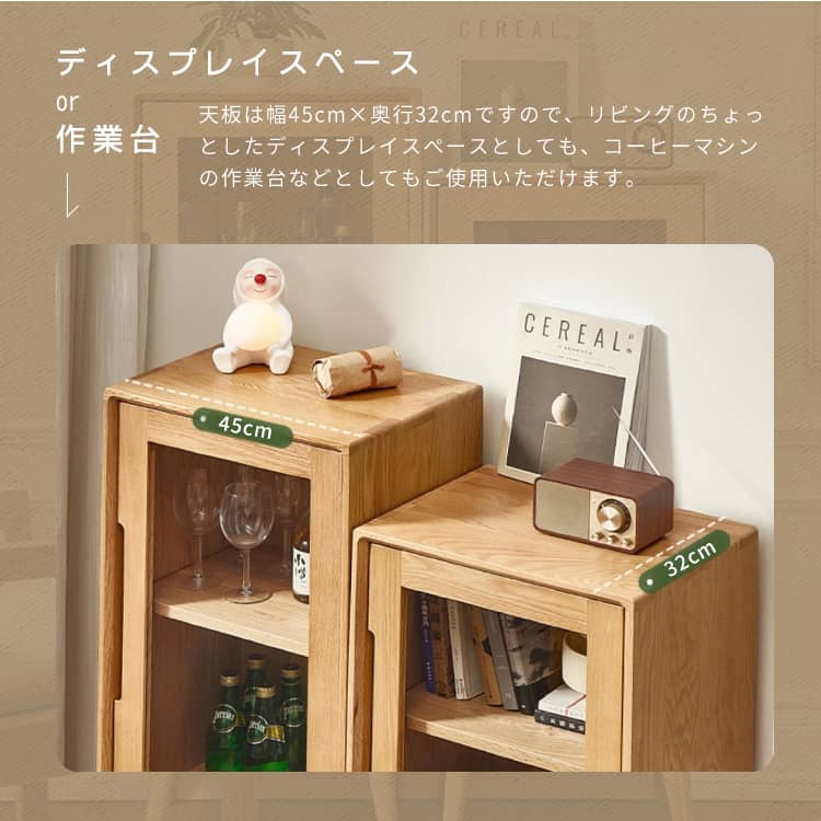 | おすすめのポイント | ■無垢材を採用し、安全、頑丈で安定感があり、何十年でも愛用されます。 ■透明感あるガラス扉で、埃を防ぐだけでなく、中身を全体的に確認でき、整理し、取り出しやすいのが特徴。br> ■天板は幅45cm×奥行32cmですので、リビングのちょっとしたディスプレイスペースとしても、コーヒーマシンの作業台などとしてもご使用いただけます。 ■開け閉めやすく中の物を取り出しやすいガラス扉が付いています。 ■仕切り板の高さは調整できますので、ニーズに合わせて、お好みの収納スペースが作られます。 |