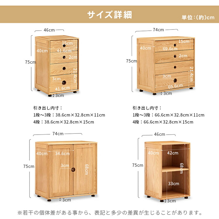 | 商品サイズ | ■タンス(小):約46×40×75cm ■タンス(大):約74×40×75cm ■オープンラック:約46×40×75cm ■扉収納:約74×40×75cm |