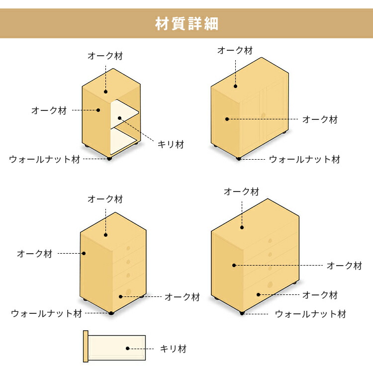 | 材質 | オーク材、キリ材(引き出し、棚)、ウォールナット材(脚部) |