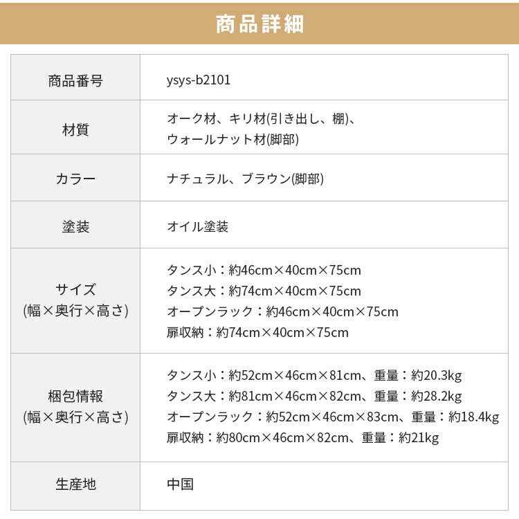 | 梱包情報 | ■タンス(小):約52×46×81cm、重量:約20.3kg ■タンス(大):約81×46×82cm、重量:約28.2kg ■オープンラック:約52×46×83m、重量:約18.4kg ■扉収納:約74×40×75cm、重量:約21kg |