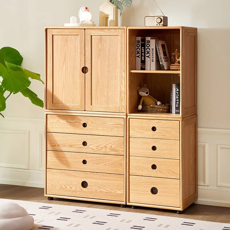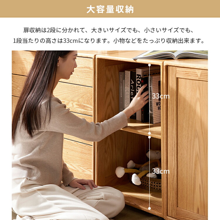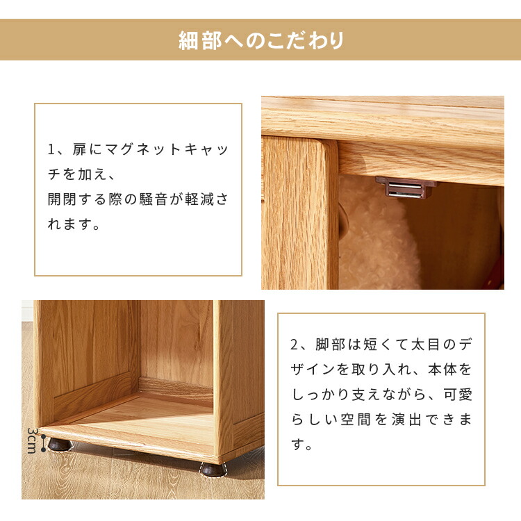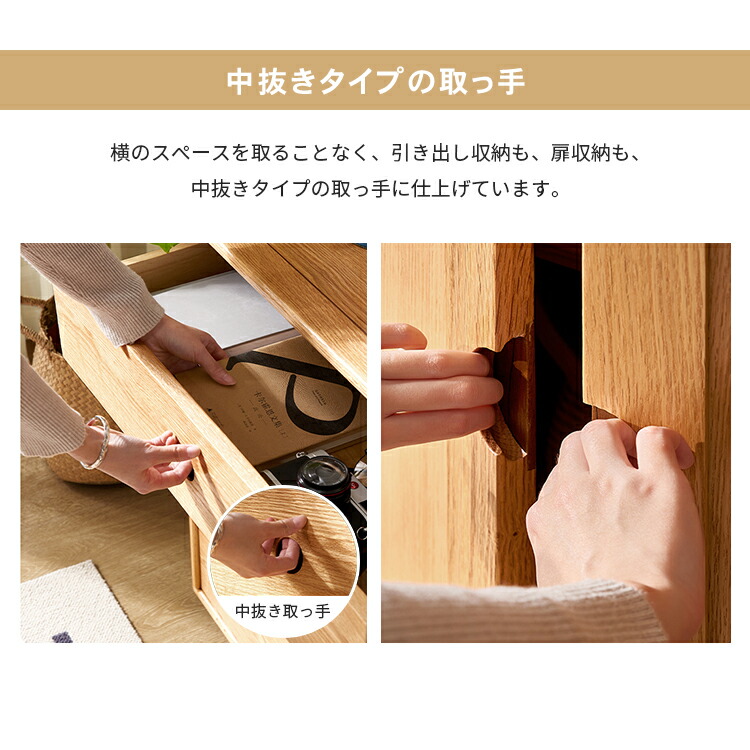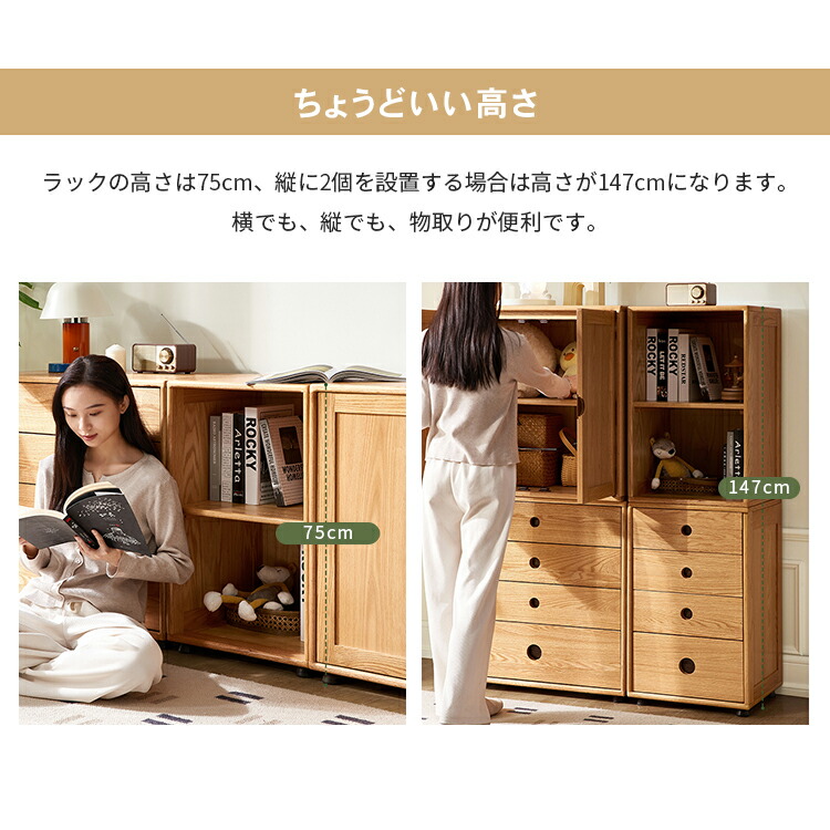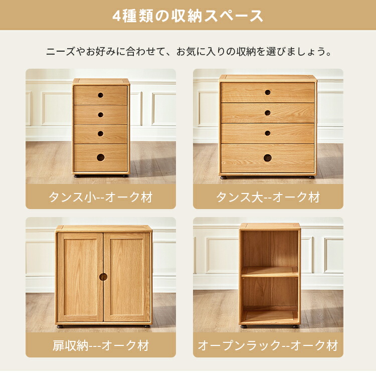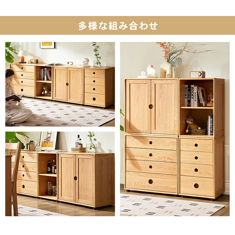 | おすすめのポイント | ■無垢材を採用し、安全、頑丈で安定感があり、何十年でも愛用されます。 ■部屋のレイアウトや収納スペースに合わせて、自由に組み合わせましょう。 ■ニーズやお好みに合わせて、お気に入りの収納を選びましょう。 ■横のスペースを取ることなく、引き出し収納も、扉収納も、中抜きタイプの取っ手に仕上げています。 ■細部にまでこだわった設計だから、安心して長く使えます。 |