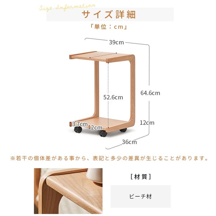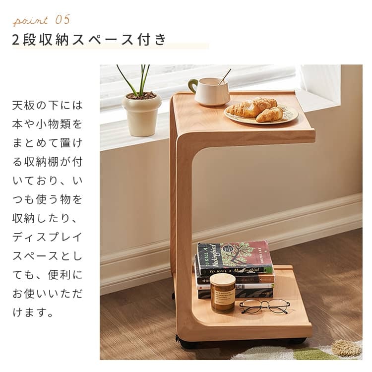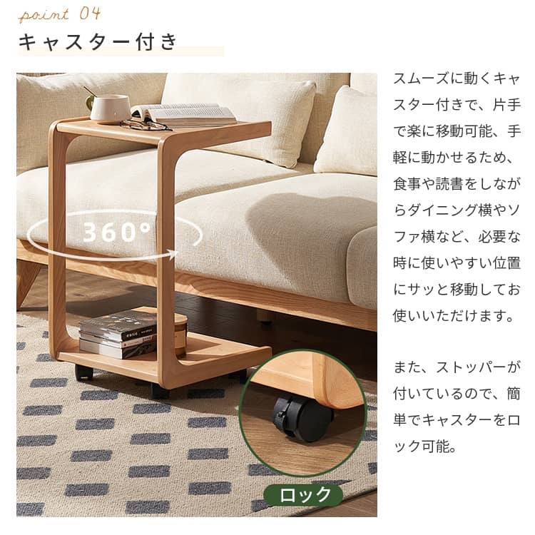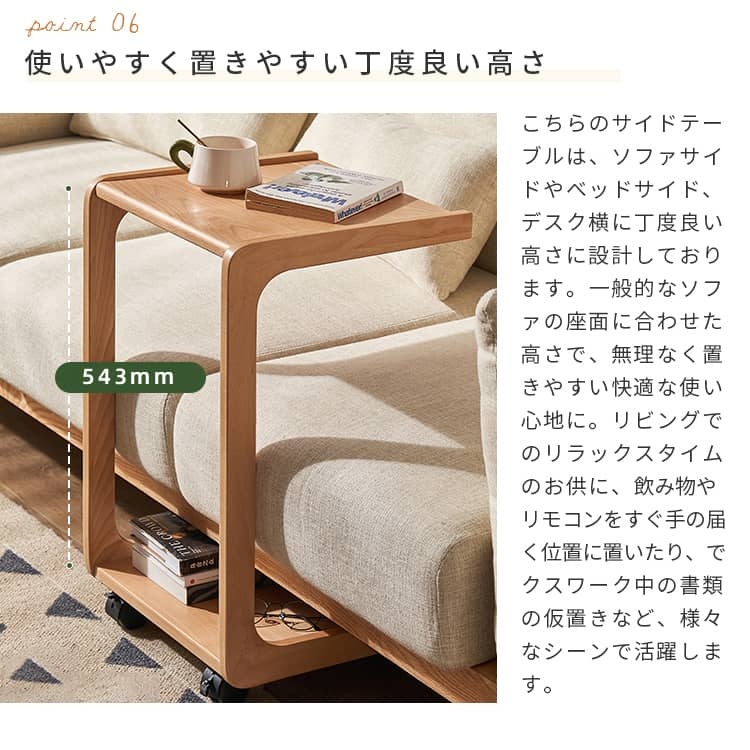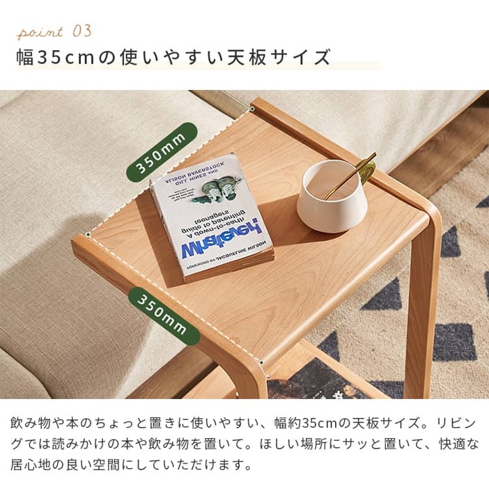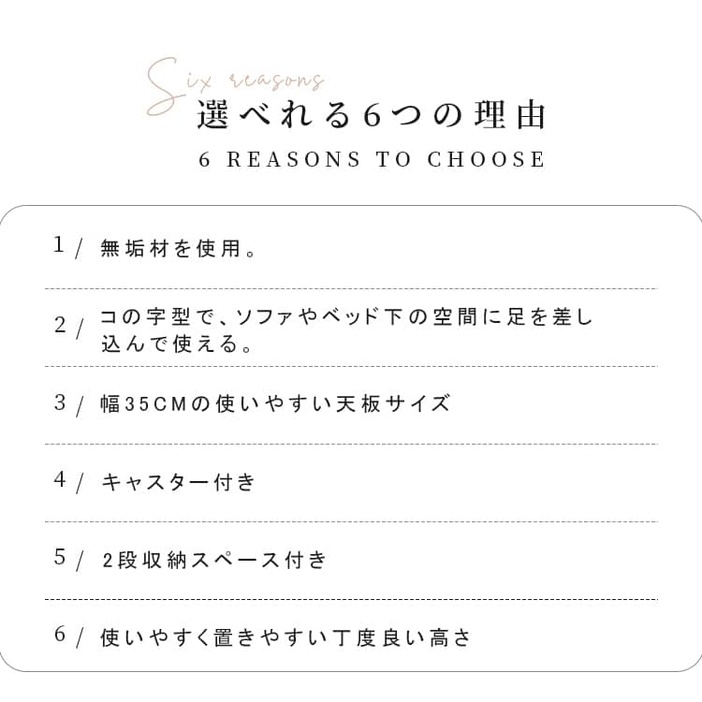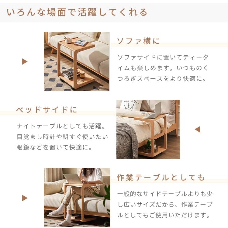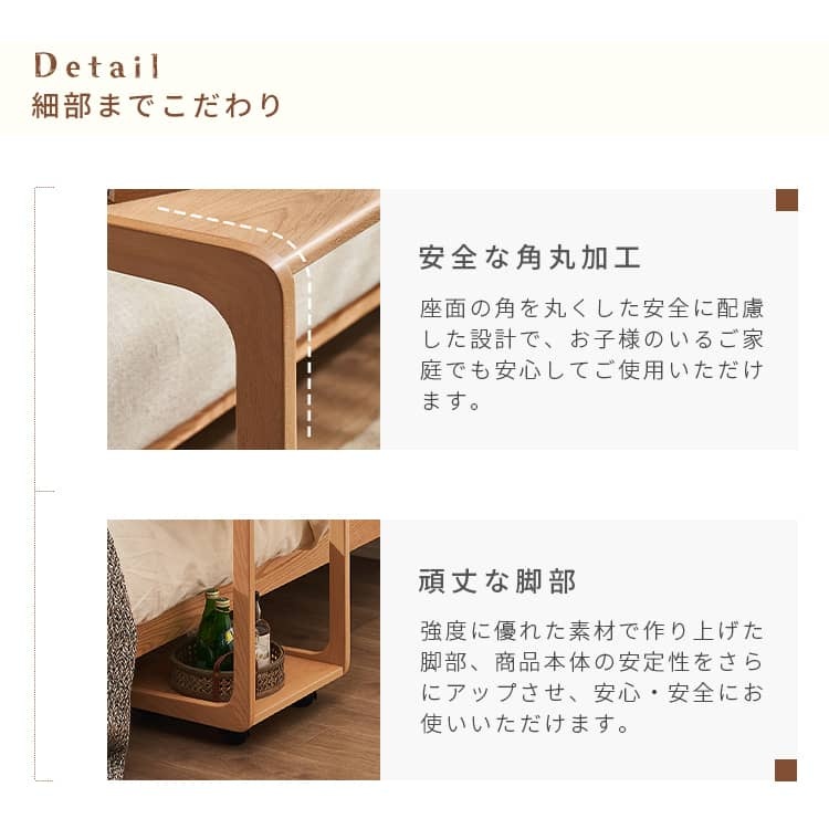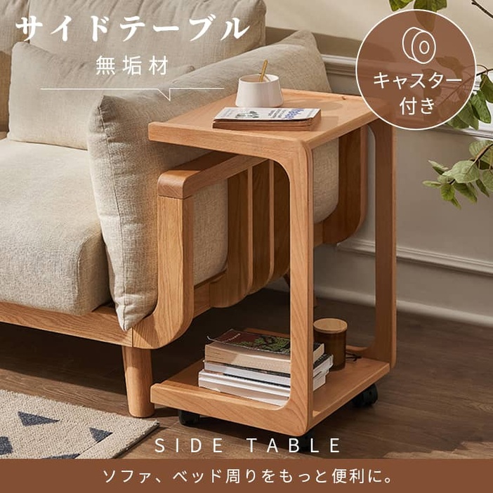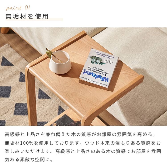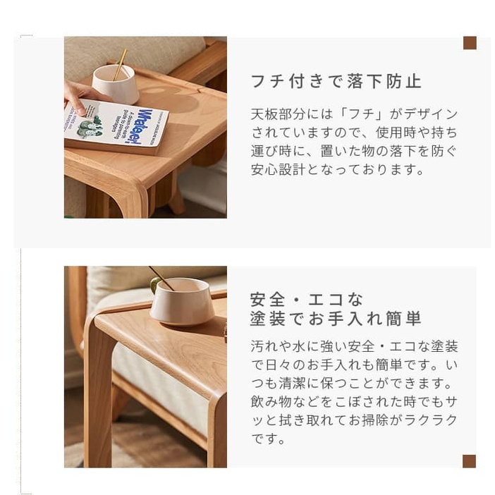 | おすすめのポイント | ■角を丸くした安全に配慮した設計で、お子様のいるご家庭でも安心してご使用いただけます。 ■高級感と上品さを兼ね備えた木の質感がお部屋の雰囲気を高める。 ■コの字型で、ソファやベッド下の空間に足を差し込んで、テーブルが手元近くで使えて便利です。 ■コンパクトな形で、場所をとらない省スペース・軽量なので、最大限に空間を利用できます。 ■飲み物や本のちょっと置きに使いやすい、幅約35cmの天板サイズ。 |