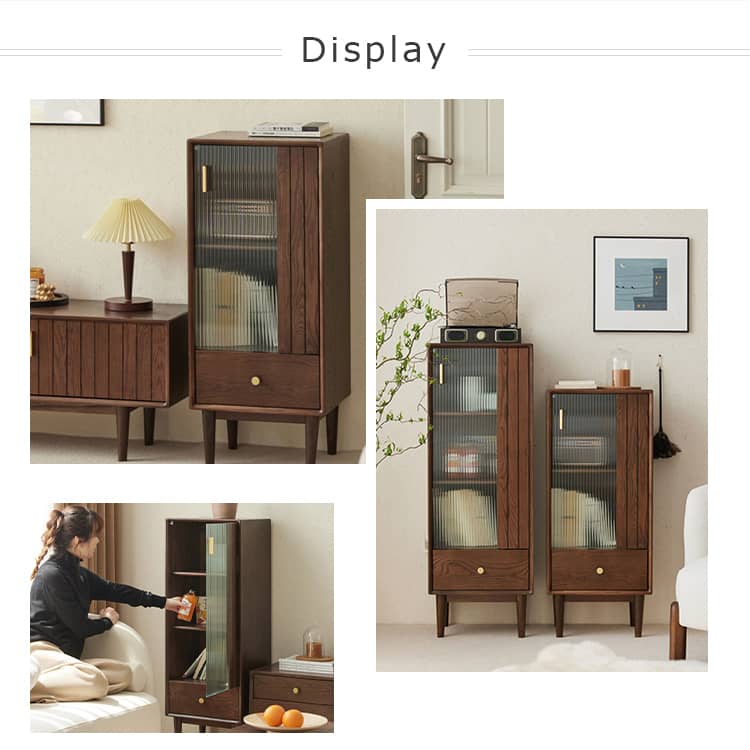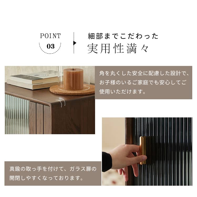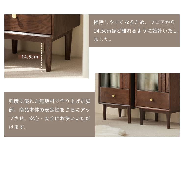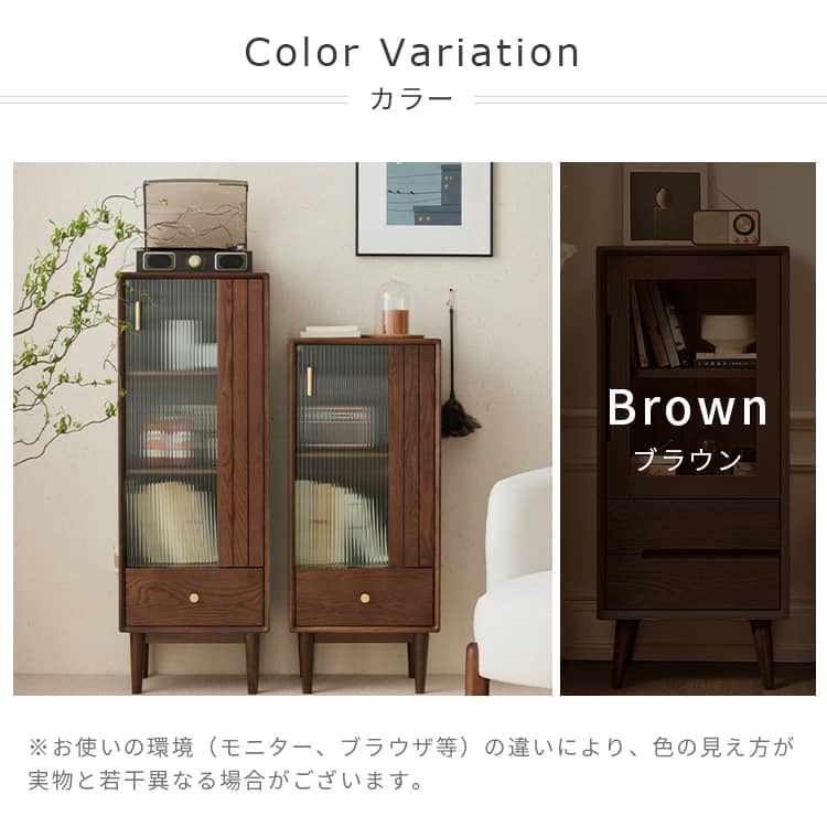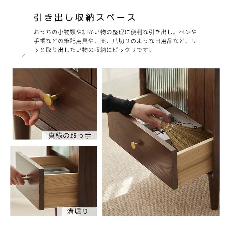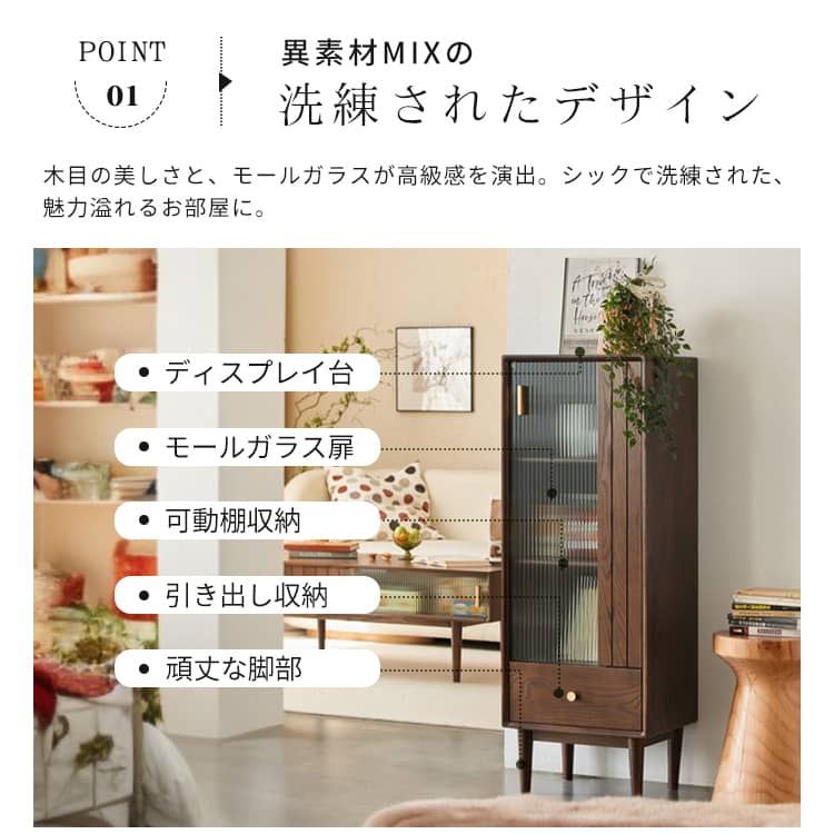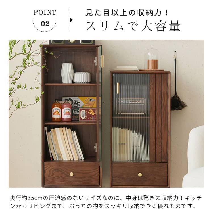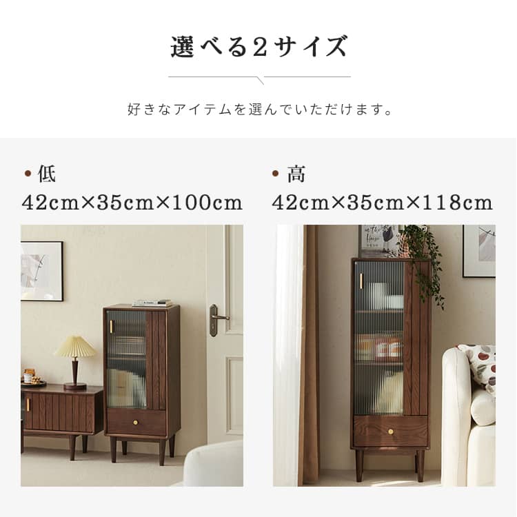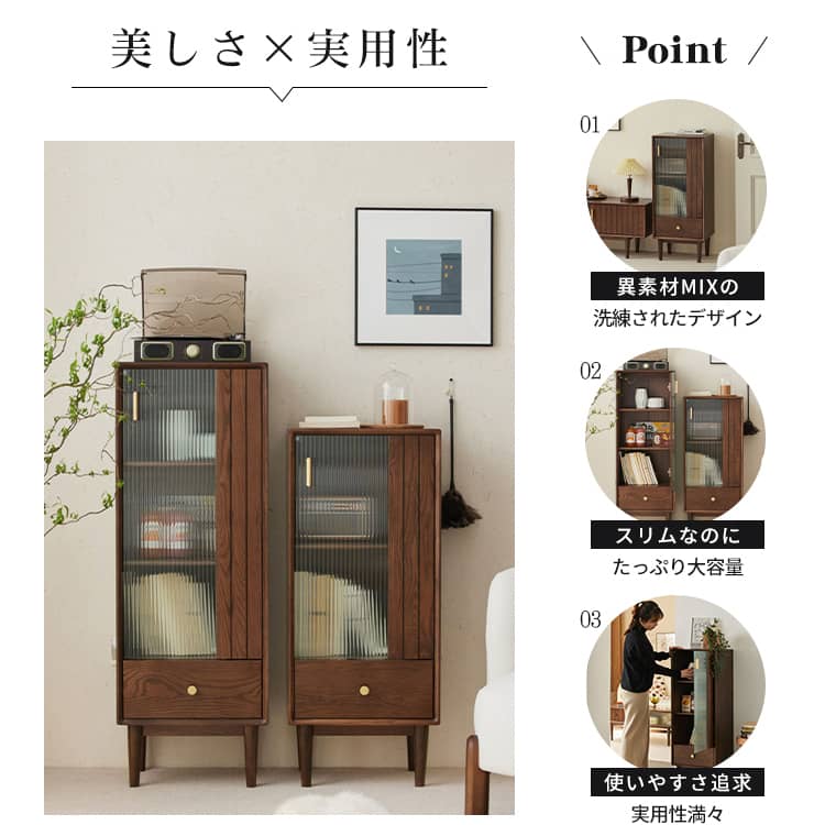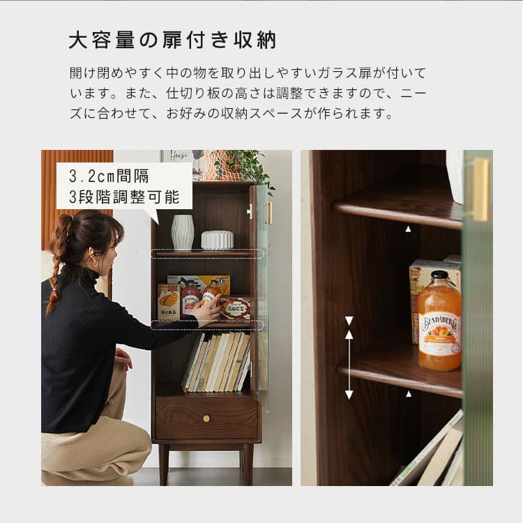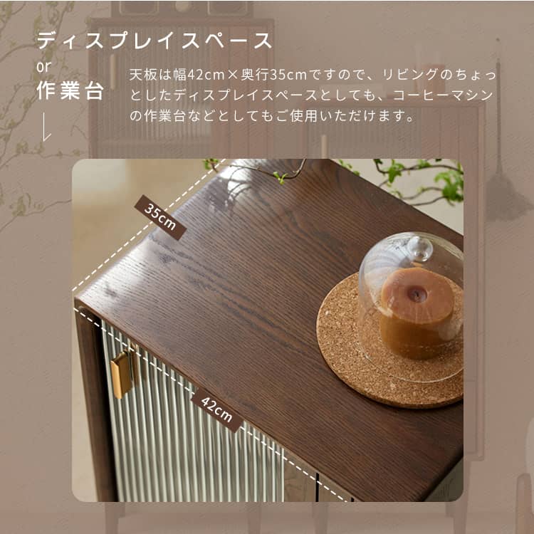 | おすすめのポイント | ■無垢材を採用し、安全、頑丈で安定感があり、何十年でも愛用されます。 ■透明感あるガラス扉で、埃を防ぐだけでなく、中身を全体的に確認でき、整理し、取り出しやすいのが特徴。br> ■天板は幅42cm×奥行35cmですので、リビングのちょっとしたディスプレイスペースとしても、コーヒーマシンの作業台などとしてもご使用いただけます。 ■開け閉めやすく中の物を取り出しやすいガラス扉が付いています。 ■仕切り板の高さは調整できますので、ニーズに合わせて、お好みの収納スペースが作られます。 |