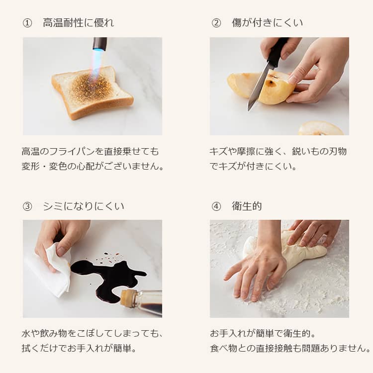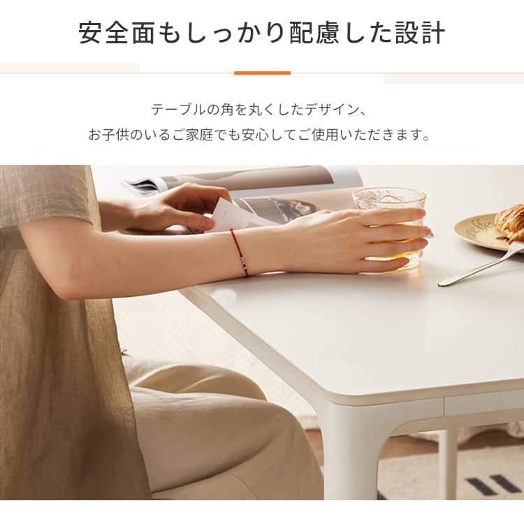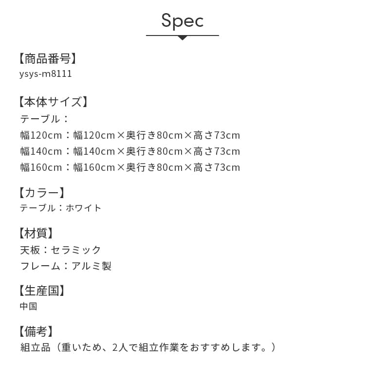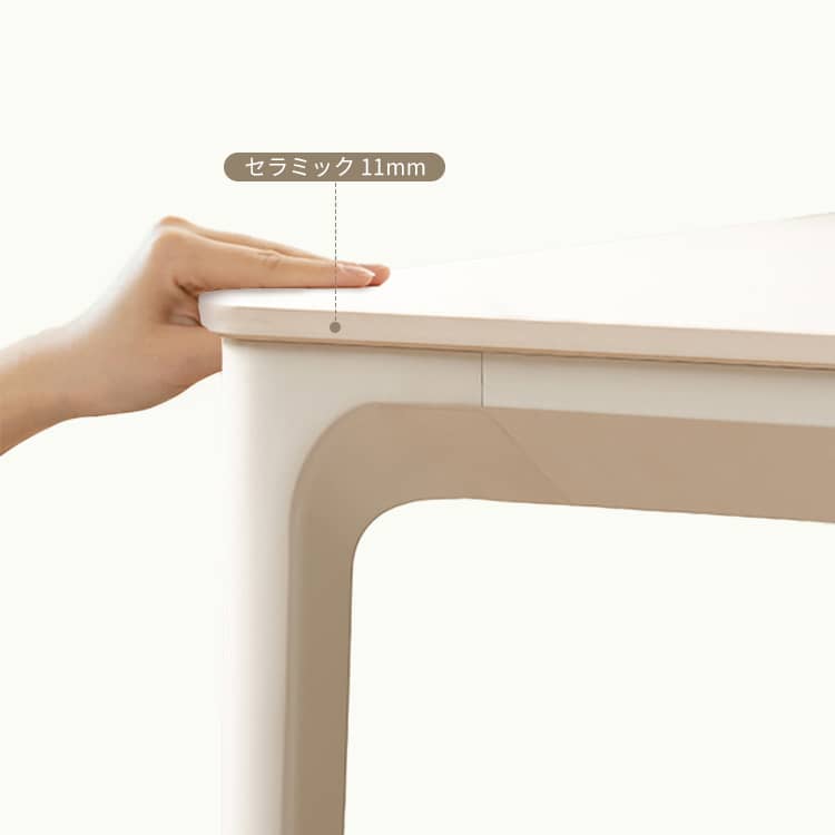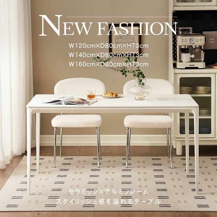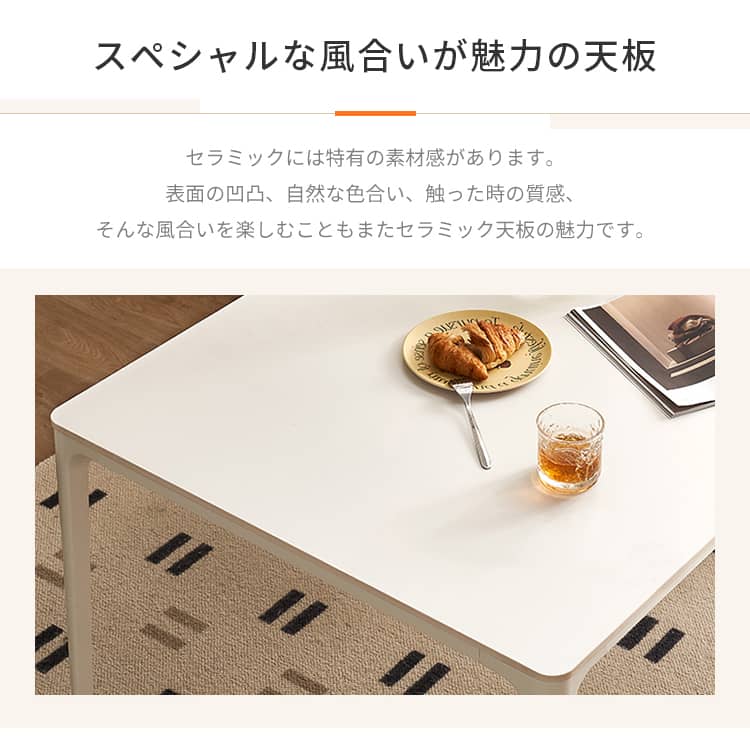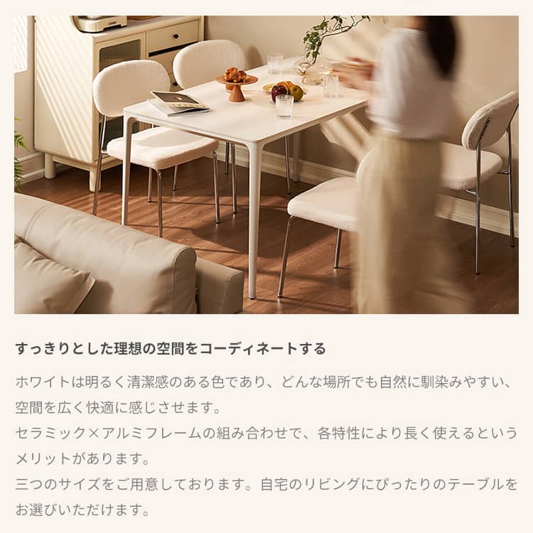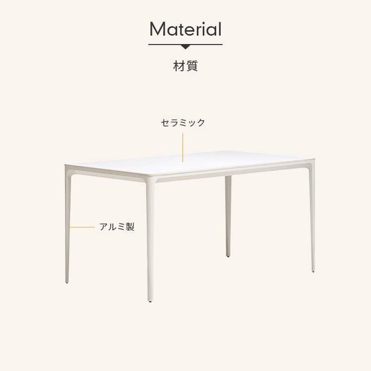 | おすすめのポイント | ■角を丸くした安全に配慮した設計で、お子様のいるご家庭でも安心してご使用いただけます。 ■ホワイトの色調がどんなインテリアにも調和し、空間を一層明るく演出します。 ■セラミック×アルミフレームの組み合わせて、各特性により長く使えるというメリットがあります。 ■セラミック天板は耐熱性、耐摩耗性、耐汚性に優れた素材です。 ■傷や錆に強いアルミ製フレーム、耐久性が高いので長くお使い頂けます。 |