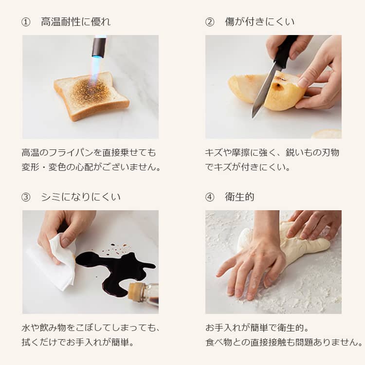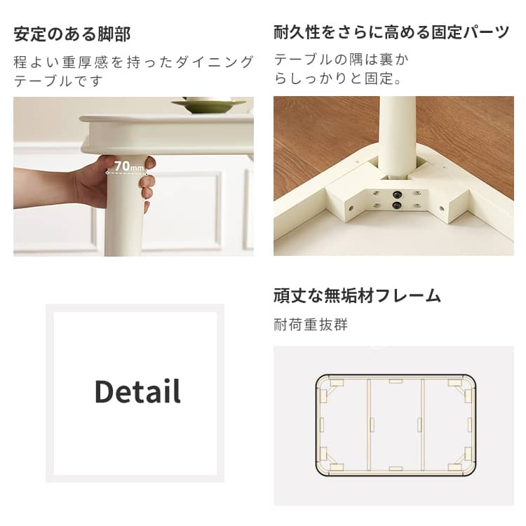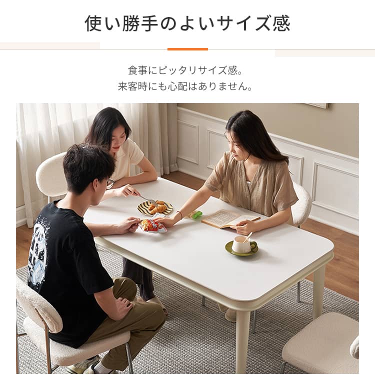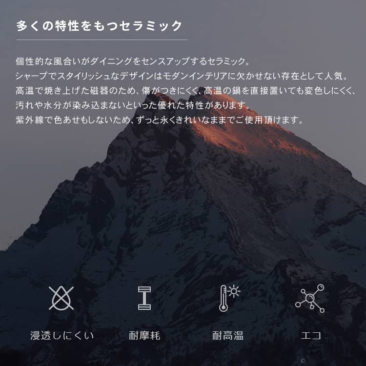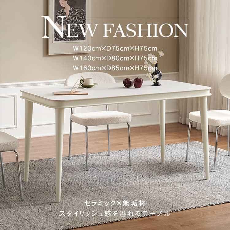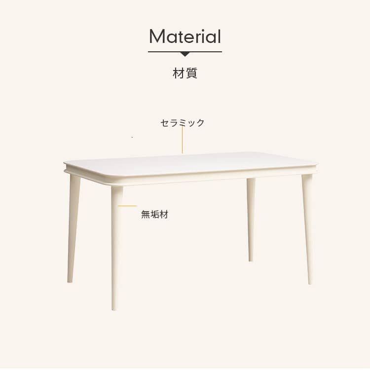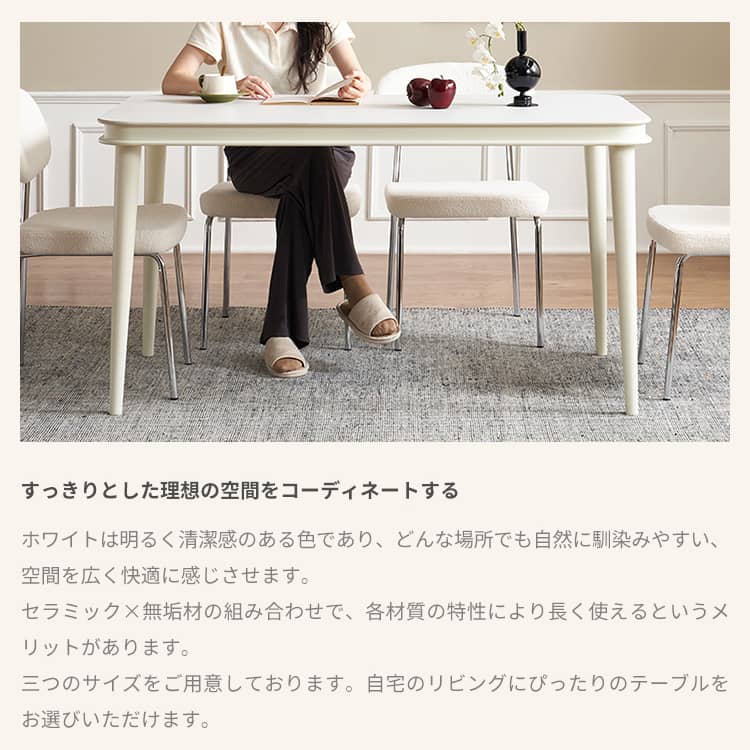 | おすすめのポイント | ■角を丸くした安全に配慮した設計で、お子様のいるご家庭でも安心してご使用いただけます。 ■ホワイトの色調がどんなインテリアにも調和し、空間を一層明るく演出します。 ■セラミック×無垢材フレームの組み合わせて、各特性により長く使えるというメリットがあります。 ■セラミック天板は耐熱性、耐摩耗性、耐汚性に優れた素材です。 ■傷や錆に強いアルミ製フレーム、耐久性が高いので長くお使い頂けます。 |