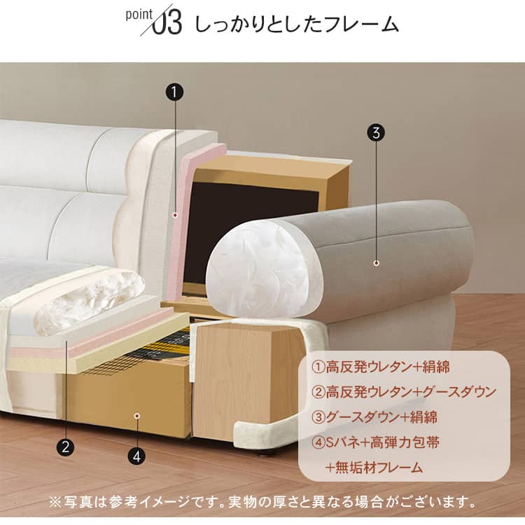 | 素材 | 本体フレーム:天然木(ラバーウッド) 張地:ファブリック 充填物:グースダウン、絹綿 |