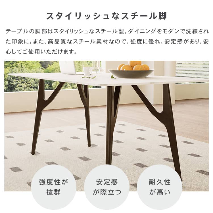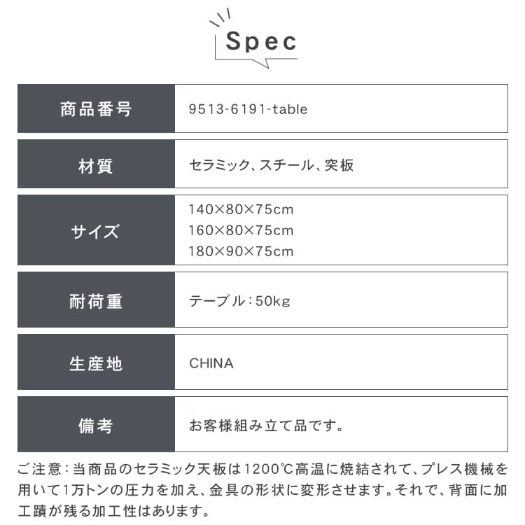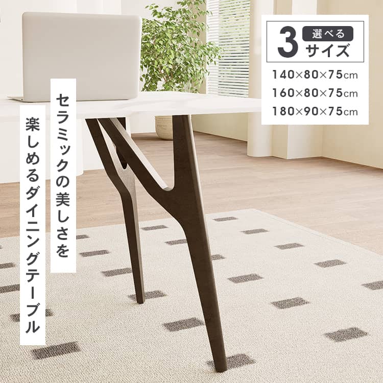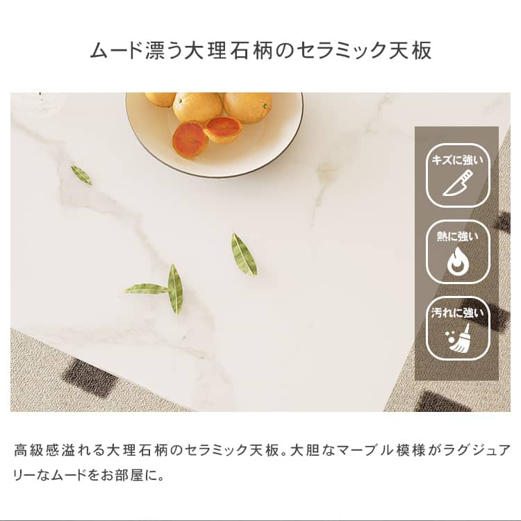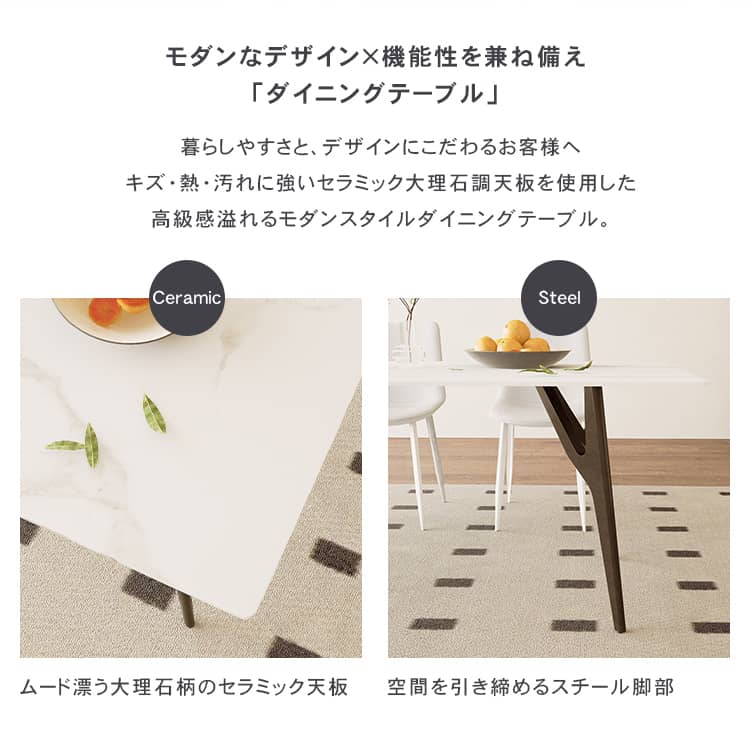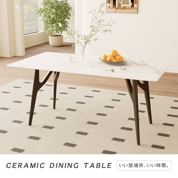 | おすすめのポイント | ■高級感のあるセラミック天板。 ■傷や摩擦に強く、金属などで擦っても傷が付きにくくなっています。 ■脚部はテーパード形状で、上部が太く下部に向かって細くなっています。軽快でスタイリッシュな印象を与えます。 ■テーブルの角を丸くした安全に配慮した設計で、お子様のいるご家庭でも安心してご使用いただけます。 ■独特な脚部デザインでスタイリッシュな雰囲気を醸しだします。。 ■長方形のテーブルは、多くの場所に適応する柔軟性があります。狭いスペースにも置くことができ、壁に沿って配置することも可能です。 ■豊富なバリエーション |