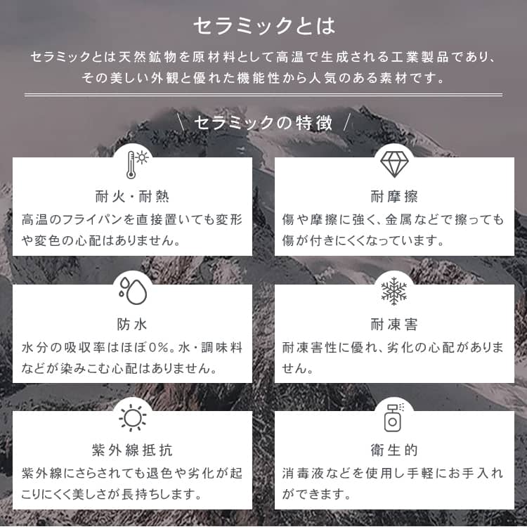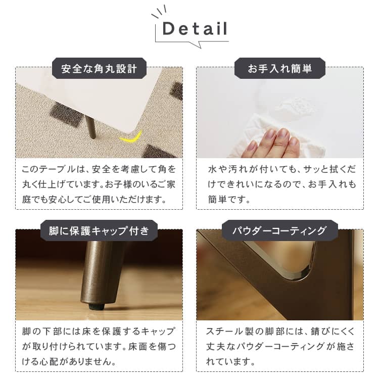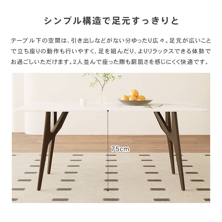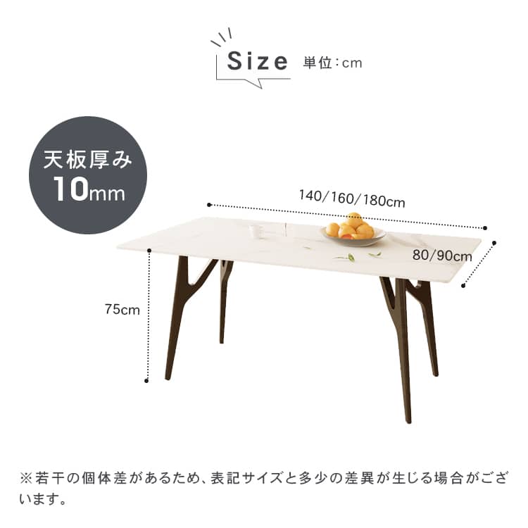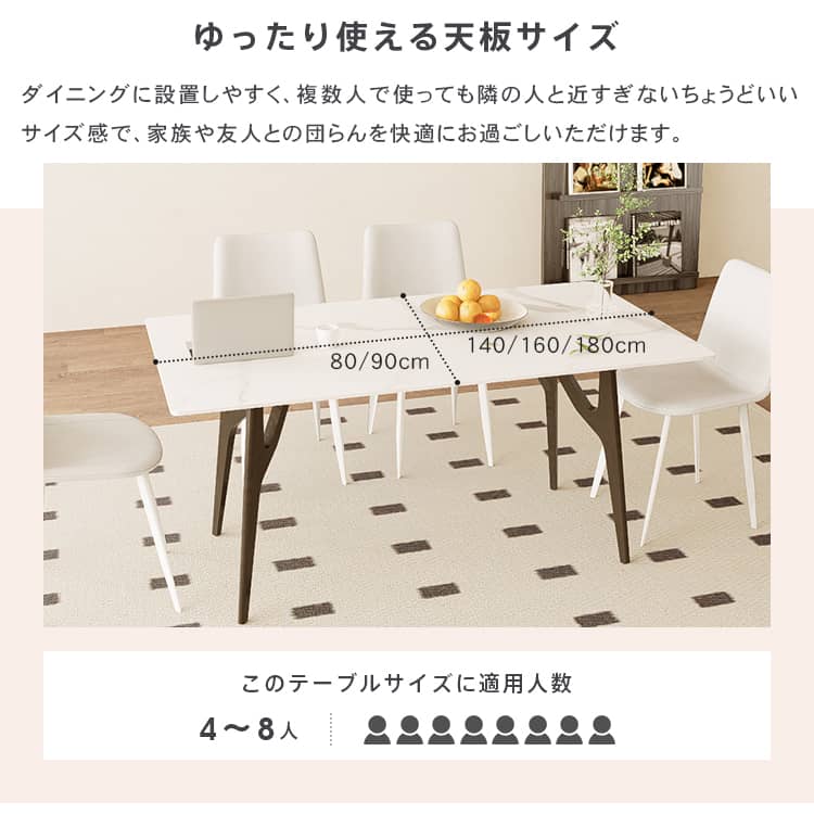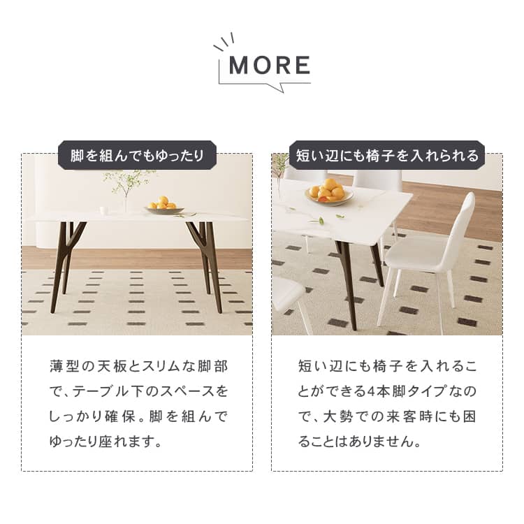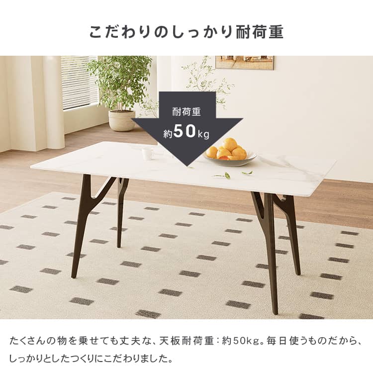 | おすすめのポイント | ■高級感のあるセラミック天板。 ■傷や摩擦に強く、金属などで擦っても傷が付きにくくなっています。 ■脚部はテーパード形状で、上部が太く下部に向かって細くなっています。軽快でスタイリッシュな印象を与えます。 ■テーブルの角を丸くした安全に配慮した設計で、お子様のいるご家庭でも安心してご使用いただけます。 ■独特な脚部デザインでスタイリッシュな雰囲気を醸しだします。。 ■長方形のテーブルは、多くの場所に適応する柔軟性があります。狭いスペースにも置くことができ、壁に沿って配置することも可能です。 ■豊富なバリエーション |