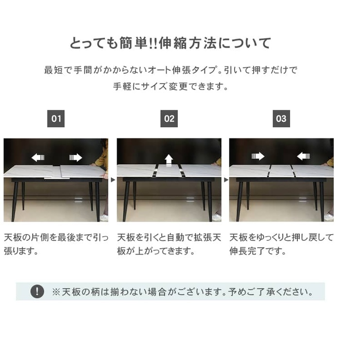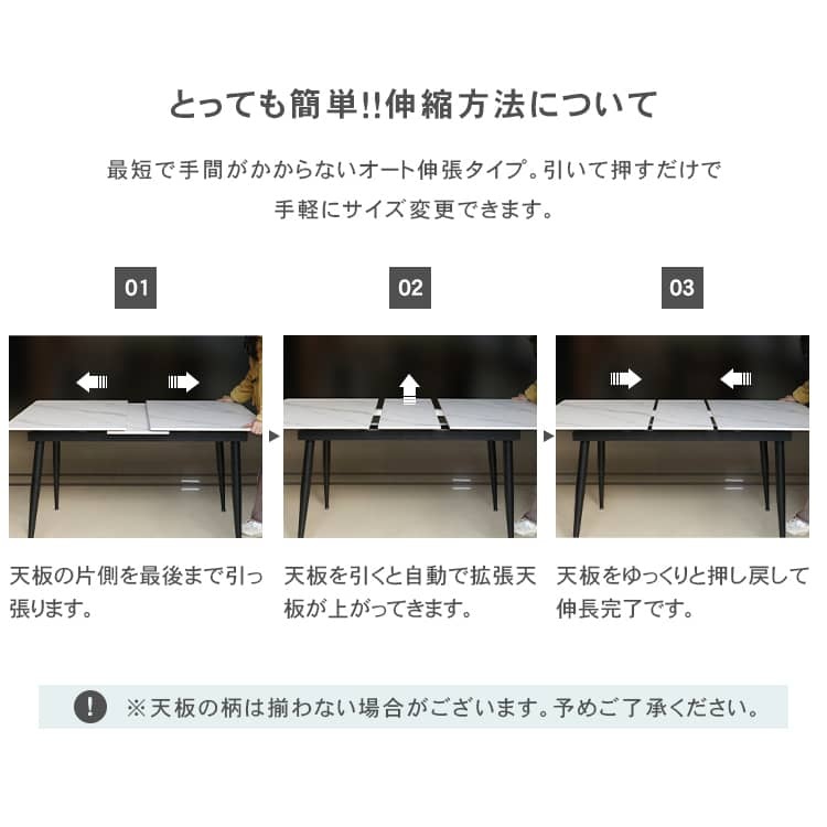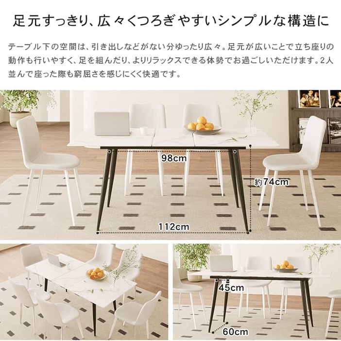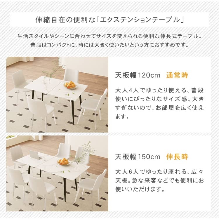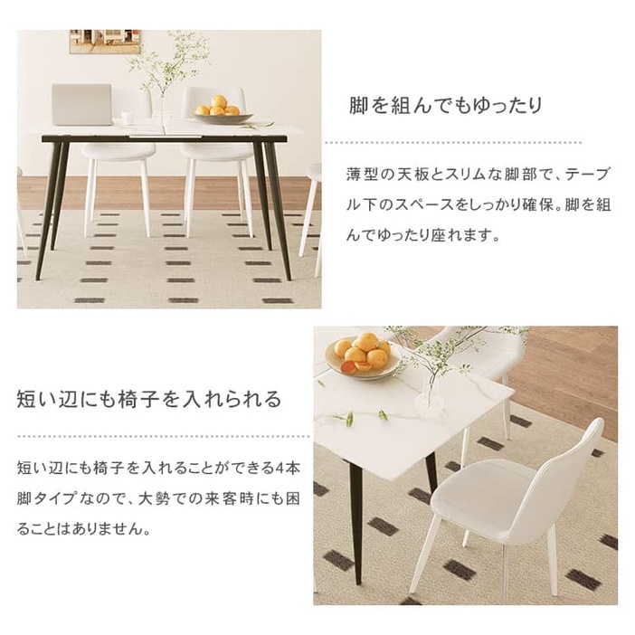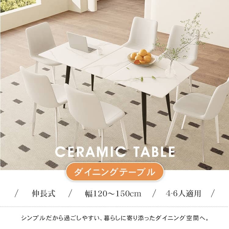 | おすすめのポイント | ■高級感のあるセラミック天板。 ■傷や摩擦に強く、金属などで擦っても傷が付きにくくなっています。 ■短辺にも椅子を自由に配置できる魅力的なテーブル。友人や家族の訪問でも心配はありません 。 ■脚部はテーパード形状で、上部が太く下部に向かって細くなっています。軽快でスタイリッシュな印象を与えます。 ■テーブルの角を丸くした安全に配慮した設計で、お子様のいるご家庭でも安心してご使用いただけます。 ■下部にゆとりがあり、足元に広々とした空間があるため、快適なダイニング空間を実現し、リラックスした時間を過ごせます。 ■長方形のテーブルは、多くの場所に適応する柔軟性があります。狭いスペースにも置くことができ、壁に沿って配置することも可能です。 ■豊富なバリエーション |