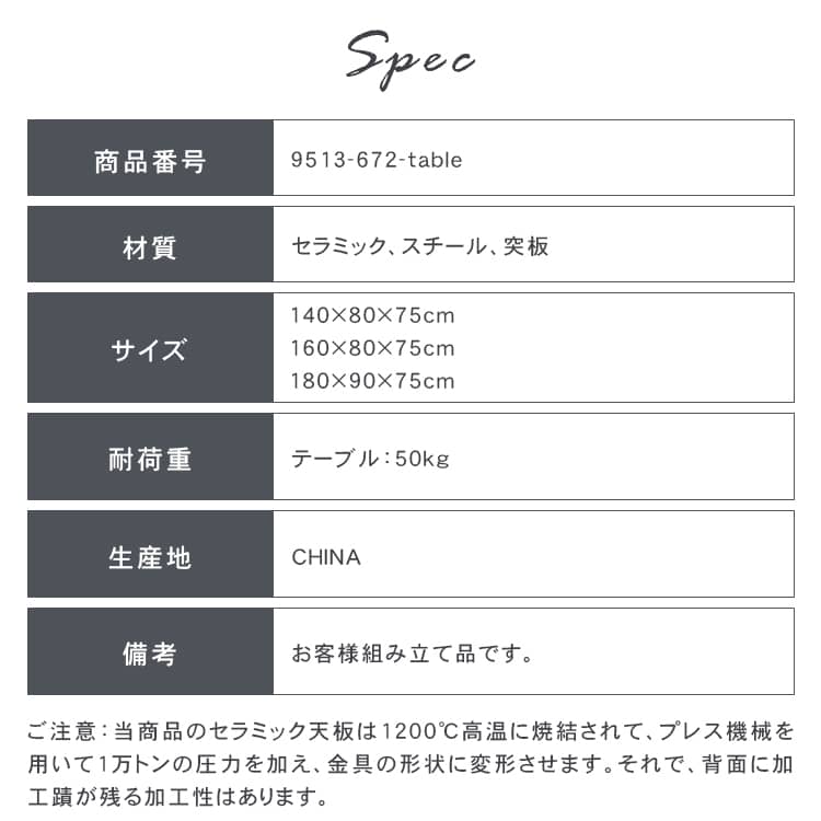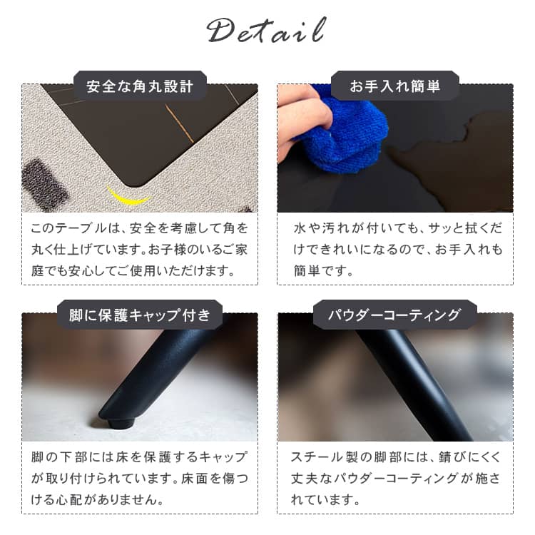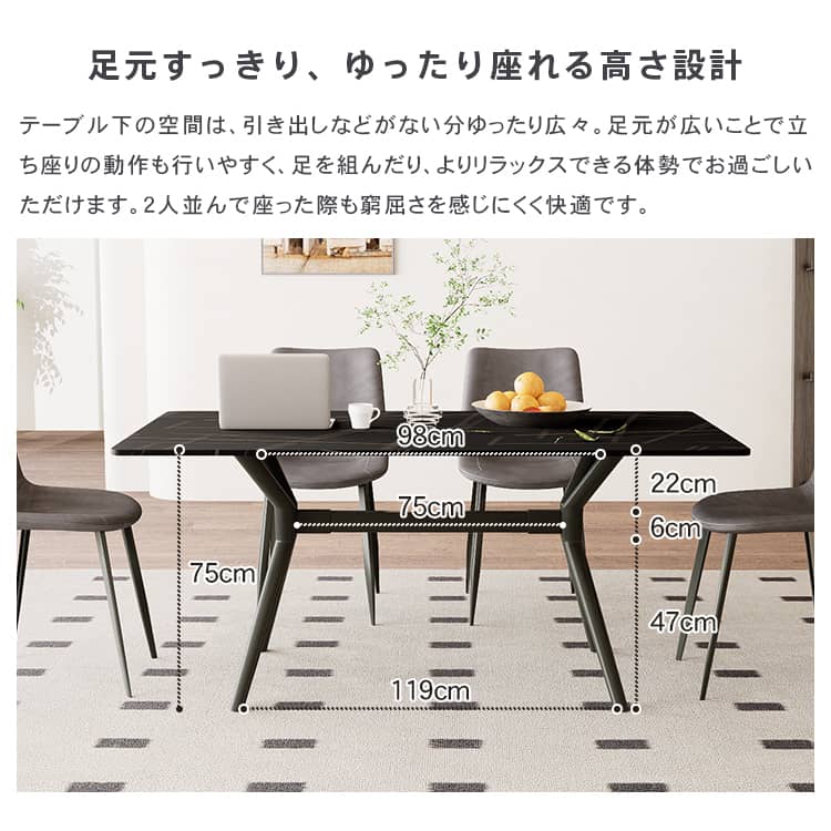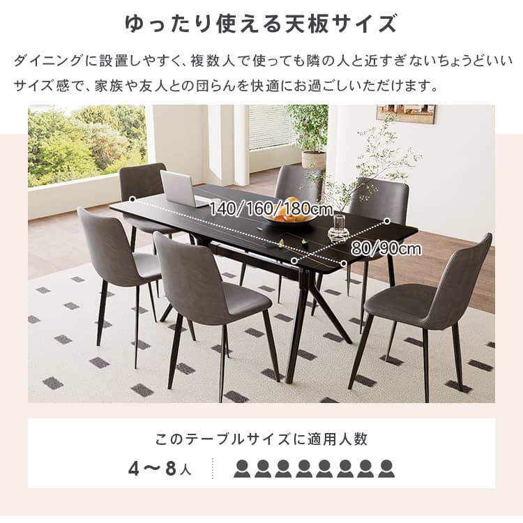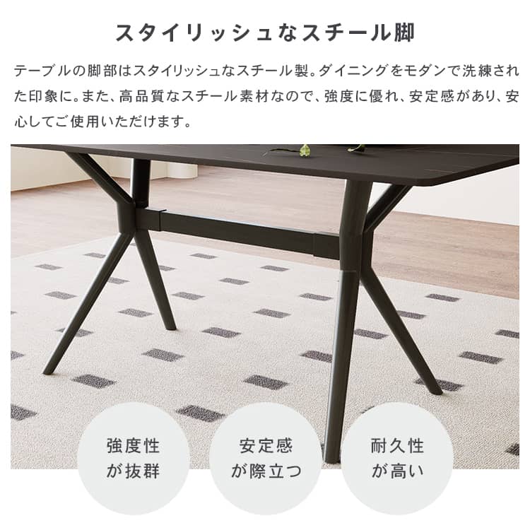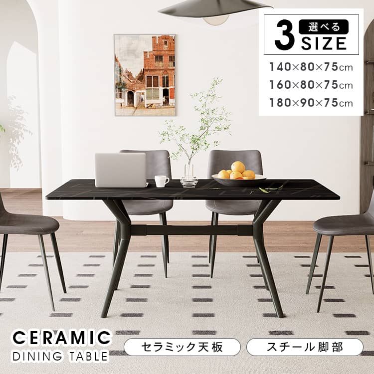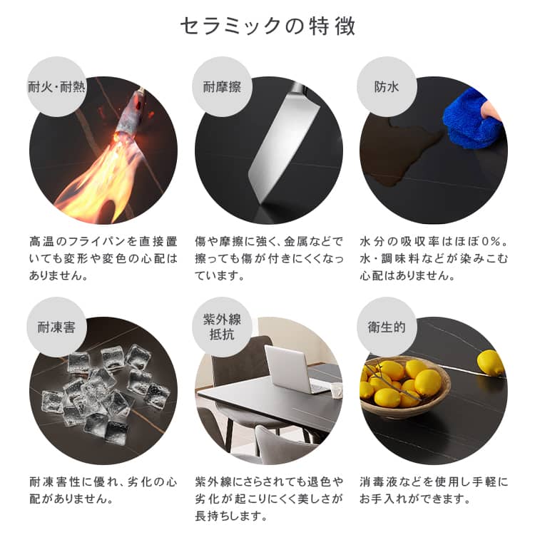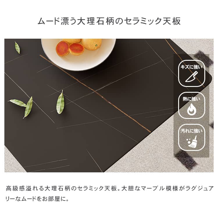 | おすすめのポイント | ■高級感のあるセラミック天板。 ■傷や摩擦に強く、金属などで擦っても傷が付きにくくなっています。 ■短辺にも椅子を自由に配置できる魅力的なテーブル。友人や家族の訪問でも心配はありません 。 ■テーブルの角を丸くした安全に配慮した設計で、お子様のいるご家庭でも安心してご使用いただけます。 ■長方形のテーブルは、多くの場所に適応する柔軟性があります。狭いスペースにも置くことができ、壁に沿って配置することも可能です。 |