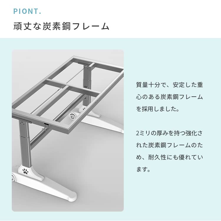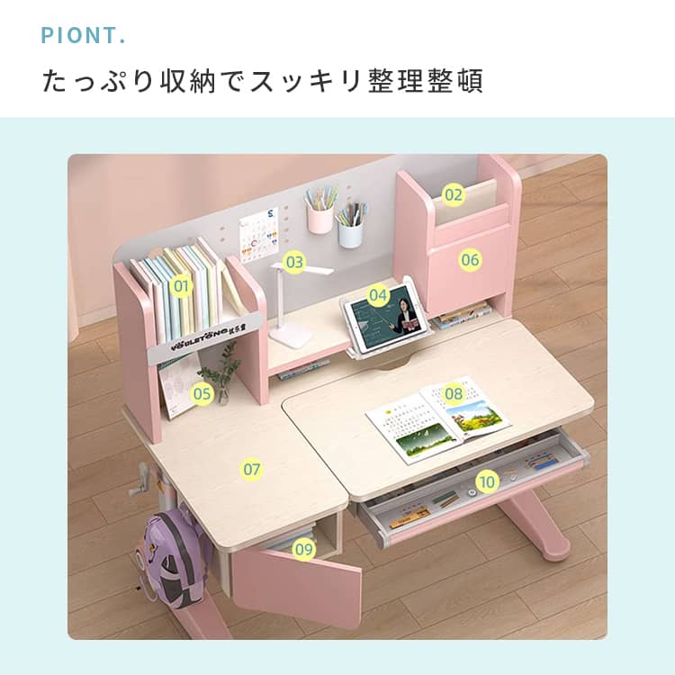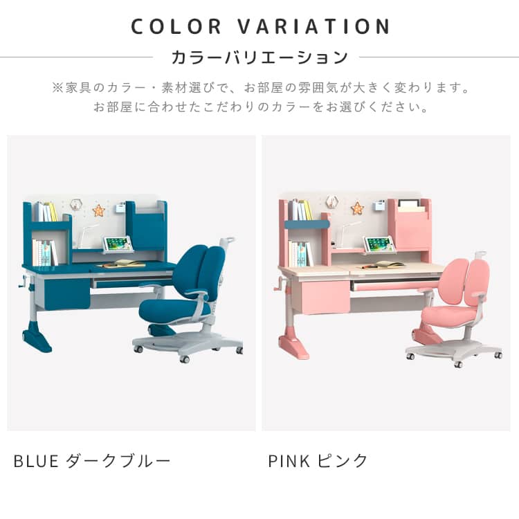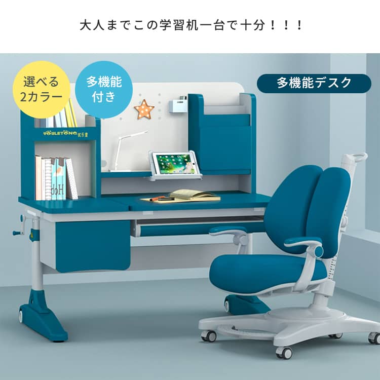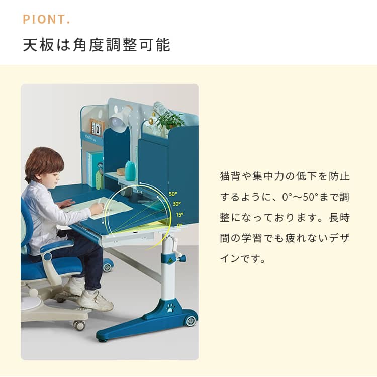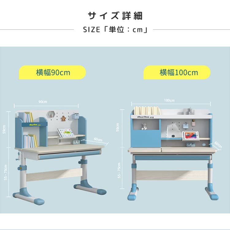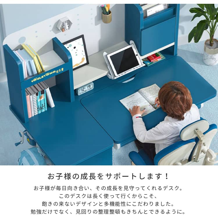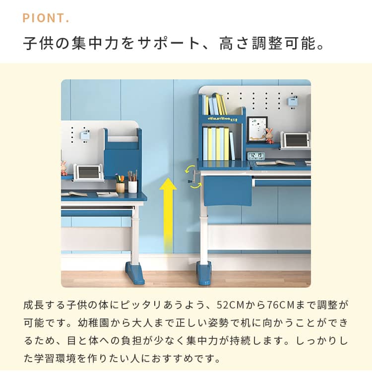 | おすすめのポイント | ■大人までこの学習机一台で、長持ち使用できます。 ■成長する子供の体にピッタリあうよう、52CMから76CMまで調整が可能です。幼稚園から大人まで正しい姿勢で机に向かうことができるため、目と体への負担が少なく集中力が持続します。しっかりした学習環境を作りたい人におすすめです。 ■質量十分で、安定した重心のある炭素鋼フレームを採用しました。2ミリの厚みを持つ強化された炭素鋼フレームのため、耐久性にも優れています。 ■天板は角度調整可能。猫背や集中力の低下を防止するように、0°~50°まで調整になっております。長時間の学習でも疲れないデザインです。 ■引出し収納と机上ラック付きで、文房具や学習資料などたっぷり収納出来ます。また、よく使う物がすぐ取り出せて、とても便利です。 ■テーブルの側にドライバーが付いています。また、テーブルの高さを簡単に整することが出来ます。 |
