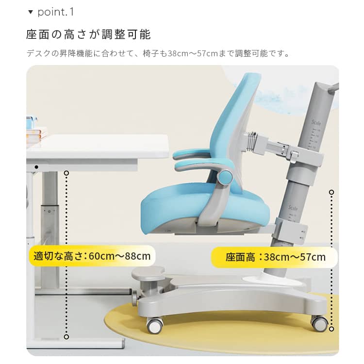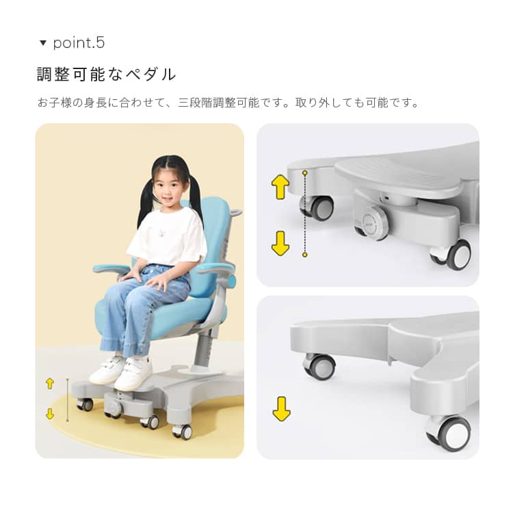 | おすすめのポイント | ■デスクの昇降機能に合わせて、椅子も38cm~57cmまで調整可能です。 ■90°回転できるコンパクトなデザインをお届けします。 ■キャスターが付いており、移動便利です。座ると自動的にロックされて、立ち上がるとロックが解除されます。 ■調整可能なペダルお子様の身長に合わせて、三段階調整可能です。取り外しても可能です。 ■オールシーズン快適のファブリックを採用されています。 |