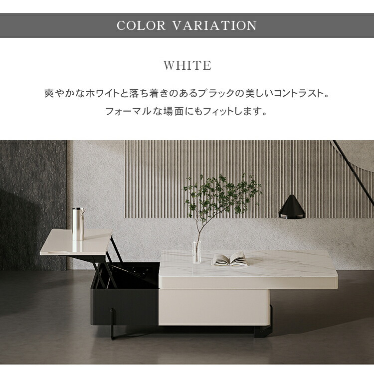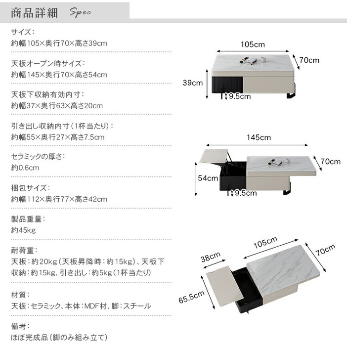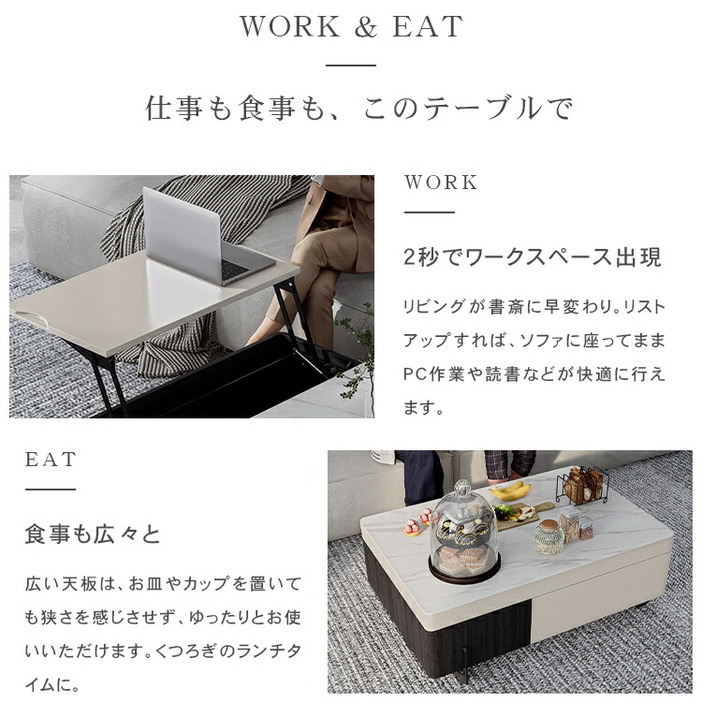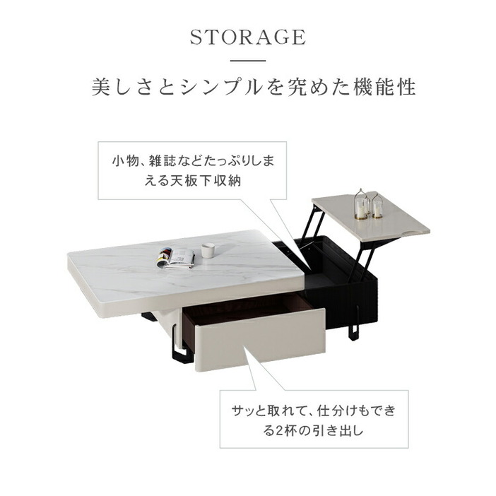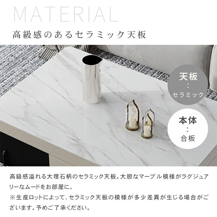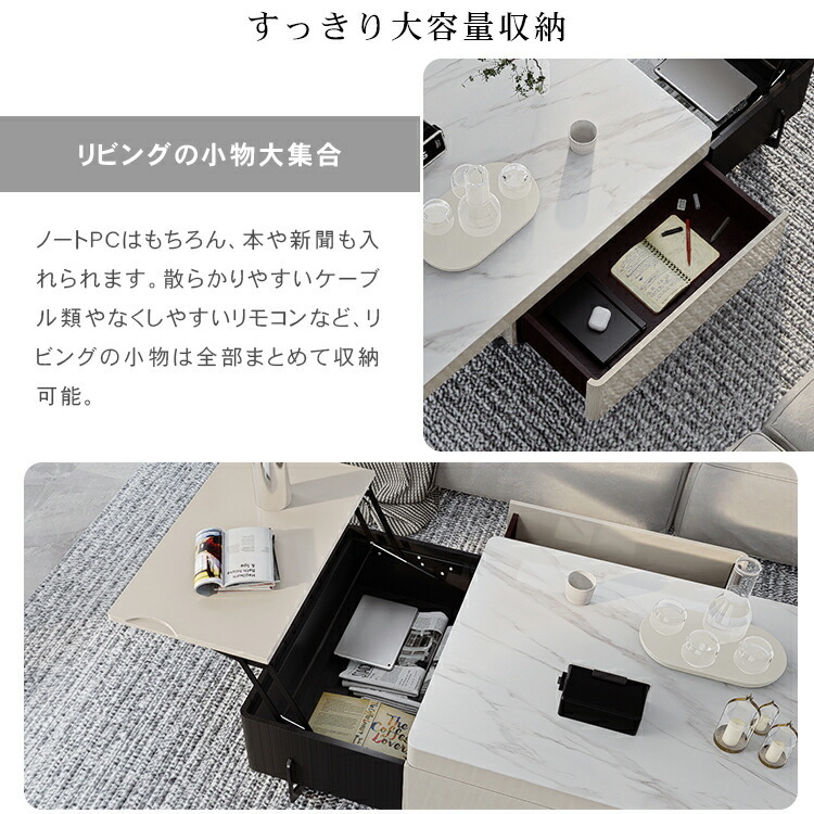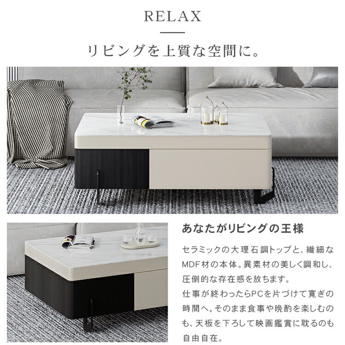 | おすすめのポイント | ■便利な昇降式で、増えつづけるテレワーク。一人暮らしのお部屋の悩みがこれ一台で。 ■天板下には、ノートPCやリピング周りの小物を収納できるスペースを用意しました。 ■丸みを帯びたデザインで子供のいるご家庭でも安心してご利用いただけます。 ■高級感溢れる大理石柄のセラミック天板。大胆なマーブル模様がラグジュアリーなムードをお部屋に。 ■本や雑貨をしっかりと収納できる引き出しが付いています。リビング周りの物をスッキリと整理整頓し、すっきりとした空間を作ることができます。 |