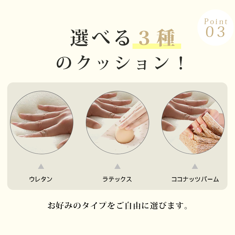 無垢材、多層板、金属、炭素鋼、ウレタン、エアレザー、ラテックス、ココナッツパーム |