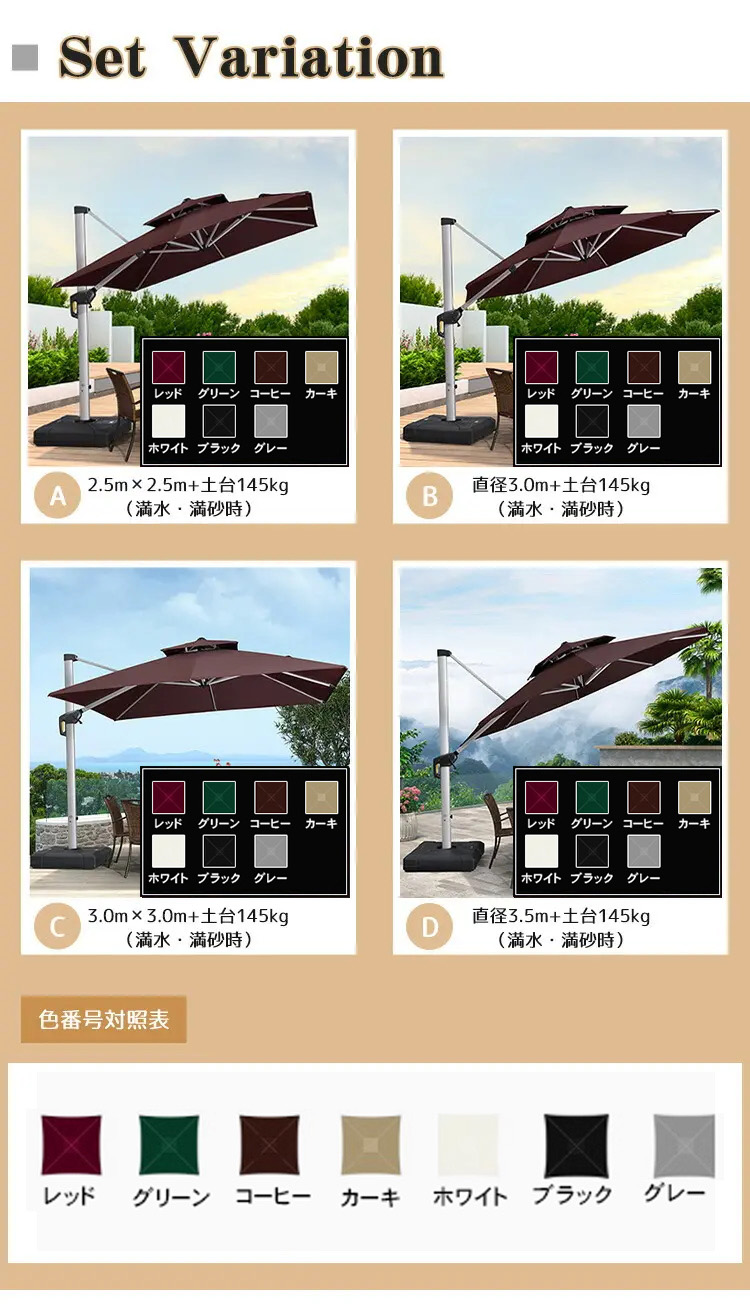| サイズ | A:幅250cm(方)土台145kg B:直径300cm(丸)土台145kg C:幅300cm(方)土台145kg D:直径350cm(丸)土台145kg ※145kgは水と砂を入れた時の重量です。 | ||