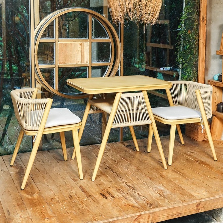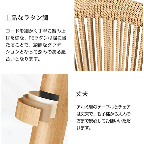 | 材質 | テーブル:強化ガラス+アルミニウム合金 チェア:人工ラタン(ポリプロピレン)+アルミニウム合金 | ||