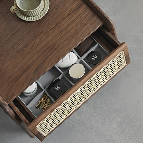 | POINT | ●無垢材 よりエコな木材を使用することで、家族の健康をより良く守ります。 ●北米産ウォールナット 落ち着いた色調と美しい木目を持ち、すぐれた性質を兼ね備えています。 ●通気性の良い籐編み引き出し 手編みの籐製ナイトテーブルは通気性が良く、湿気もためにくいです。どこに置いても違和感なくインテリアに馴染んでくれます。 ●天然木ならではの温もり 天然木ならではの質感を残しつつ、機能性と耐久性も兼ね備えています。 |