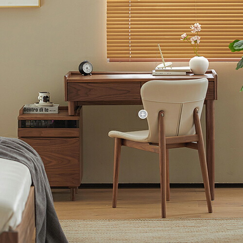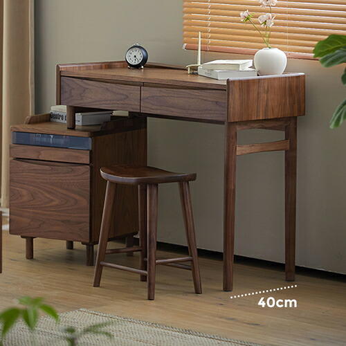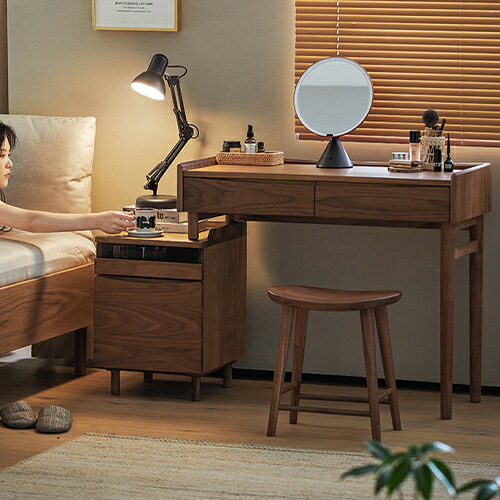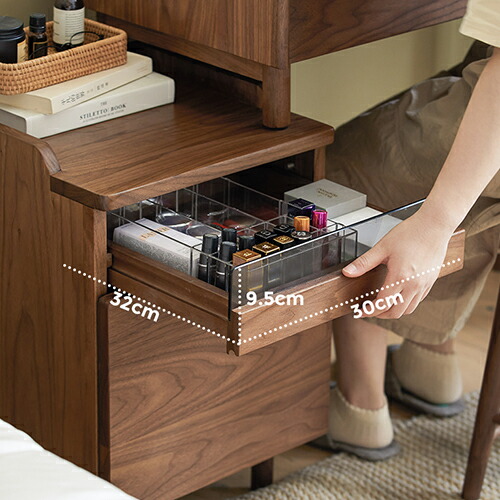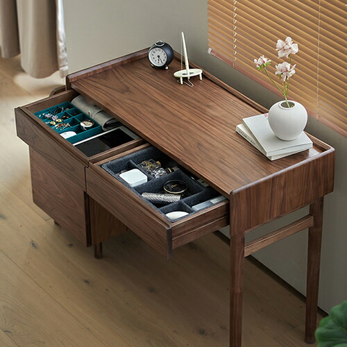| POINT | ●便利な伸縮機能 スぺースに合わせてお好みの長さをご調節することができます。 ●たっぷり収納スペース 化粧道具などの小物を分類し、まとめて収納できます。 ●ウォールナット材 落ち着いた色調と美しい木目を持ち、すぐれた性質を兼ね備えています。 ●シーンに合わせて活用 化粧台として…作業台として…様々なシーンで大活躍! |