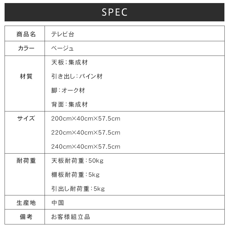 | サイズ | 200cm×40cm×57.5cm 220cm×40cm×57.5cm 240cm×40cm×57.5cm | ||