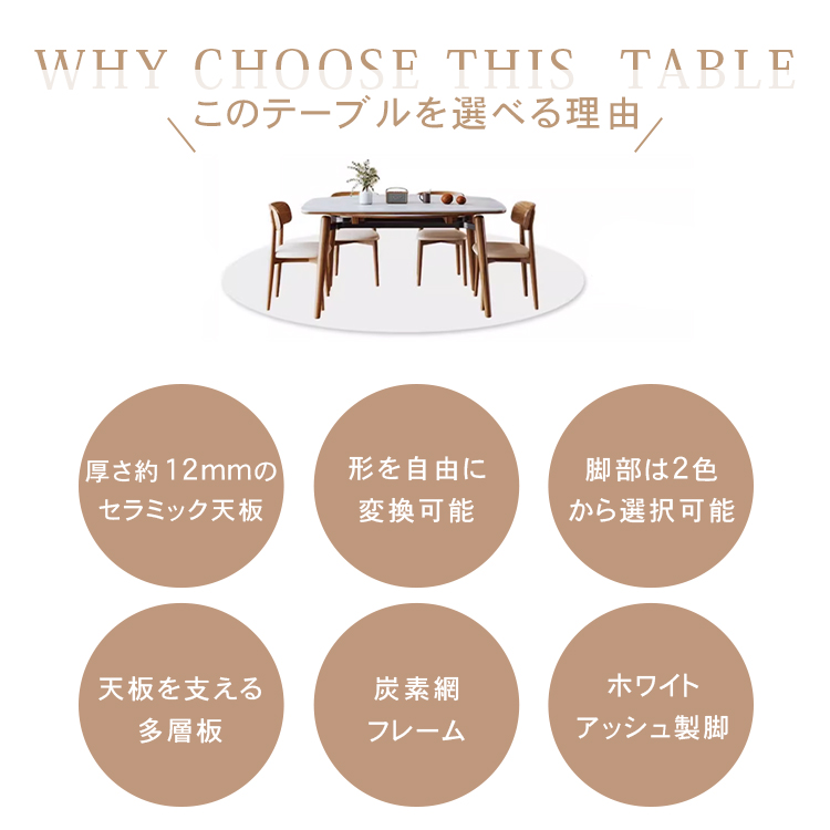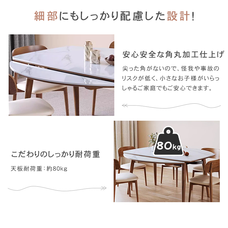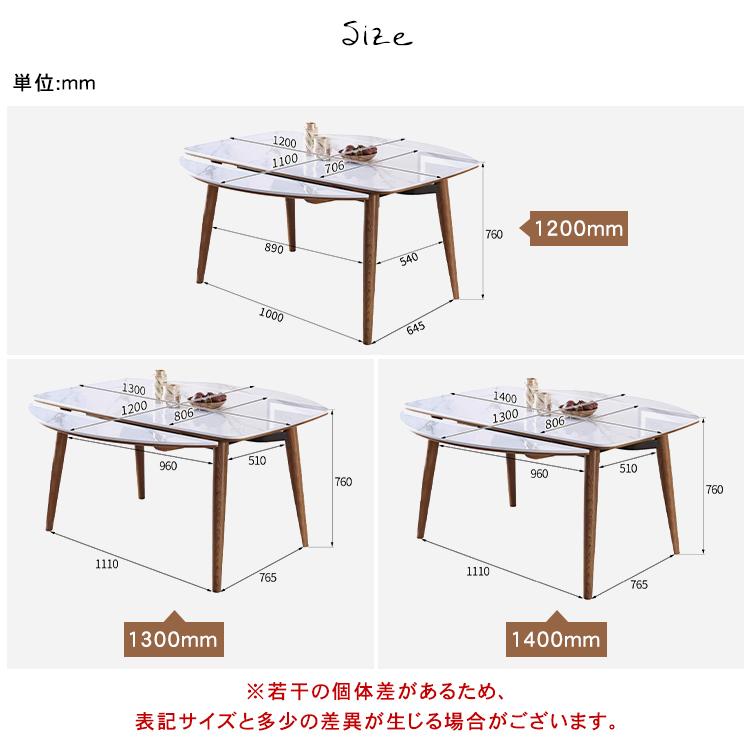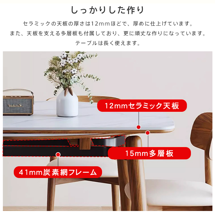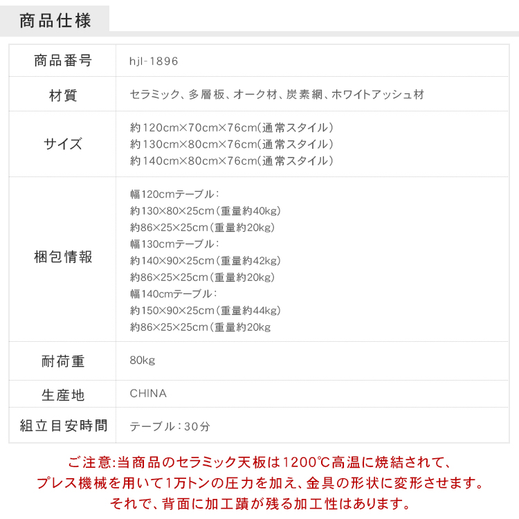 | 梱包 | 幅120cmテーブル: 約130×80×25cm(重量約40kg) 約86×25×25cm(重量約20kg) 幅130cmテーブル: 約140×90×25cm(重量約42kg) 約86×25×25cm(重量約20kg) 幅140cmテーブル: 約150×90×25cm(重量約44kg) 約86×25×25cm(重量約20kg) | ||