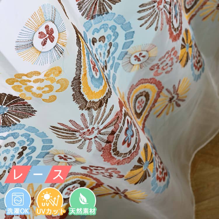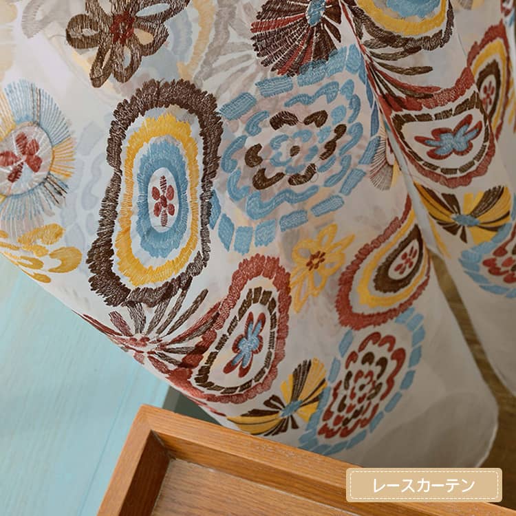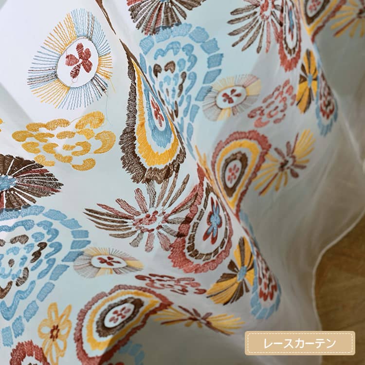 ベージュ味が入るナチュラル風合いの生地に鮮やかな花模様を刺繍され、