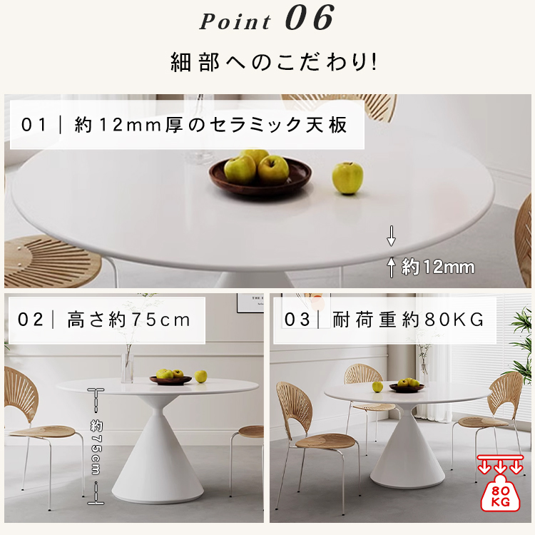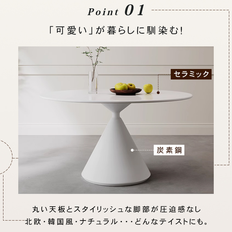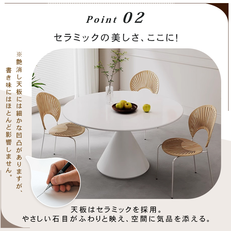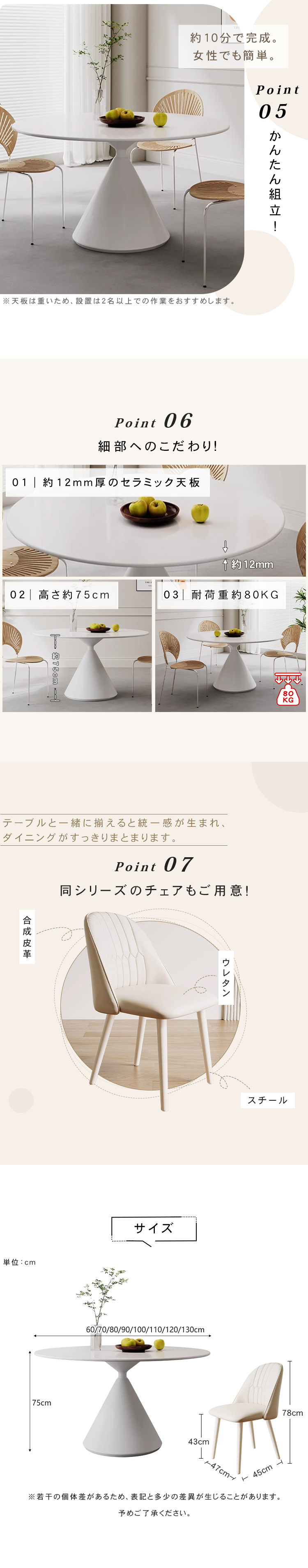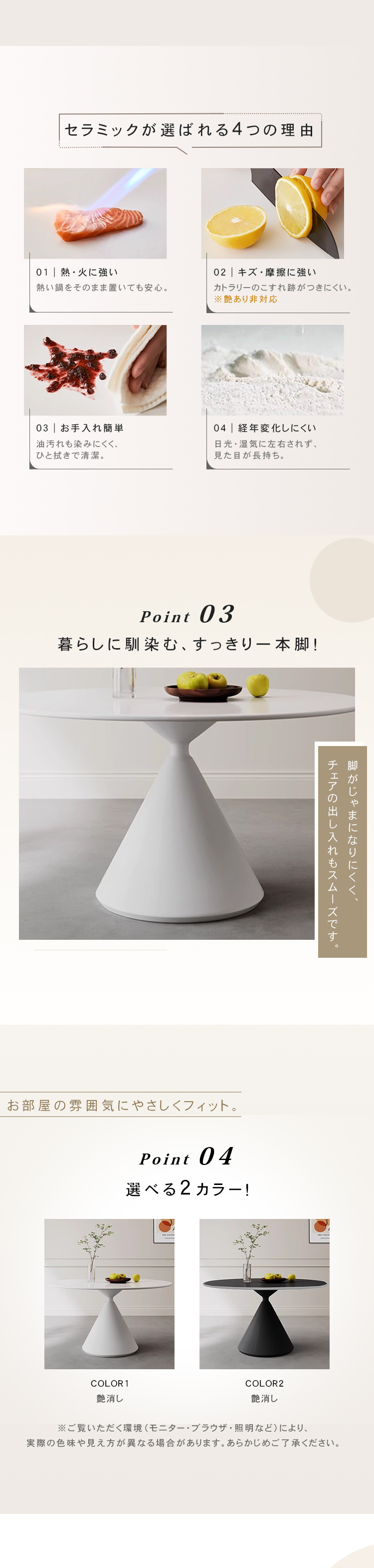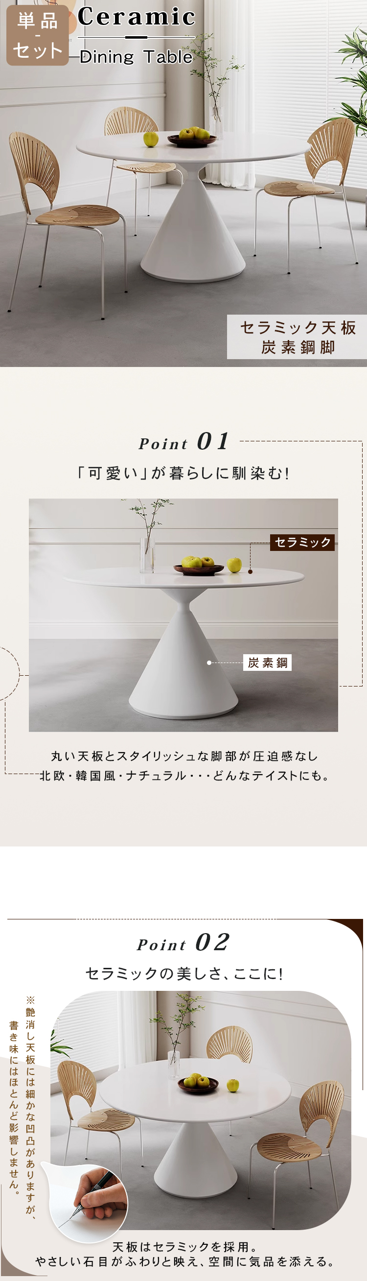 | 材質 | テーブル:セラミック、炭素鋼 椅子:合成皮革、ウレタン、炭素鋼 | ||