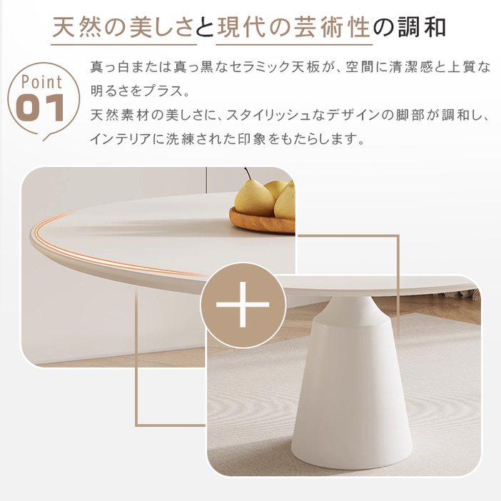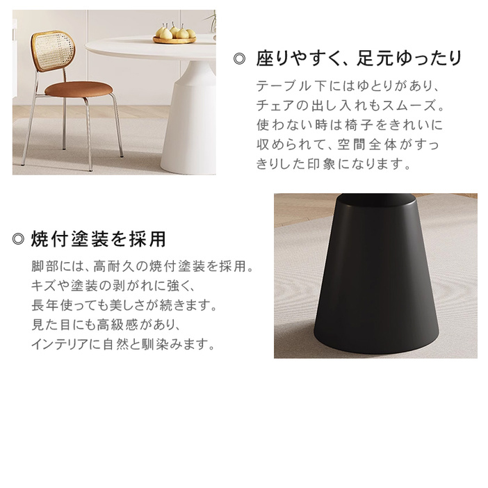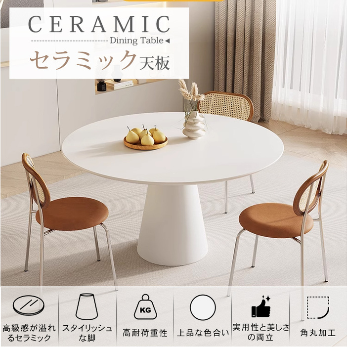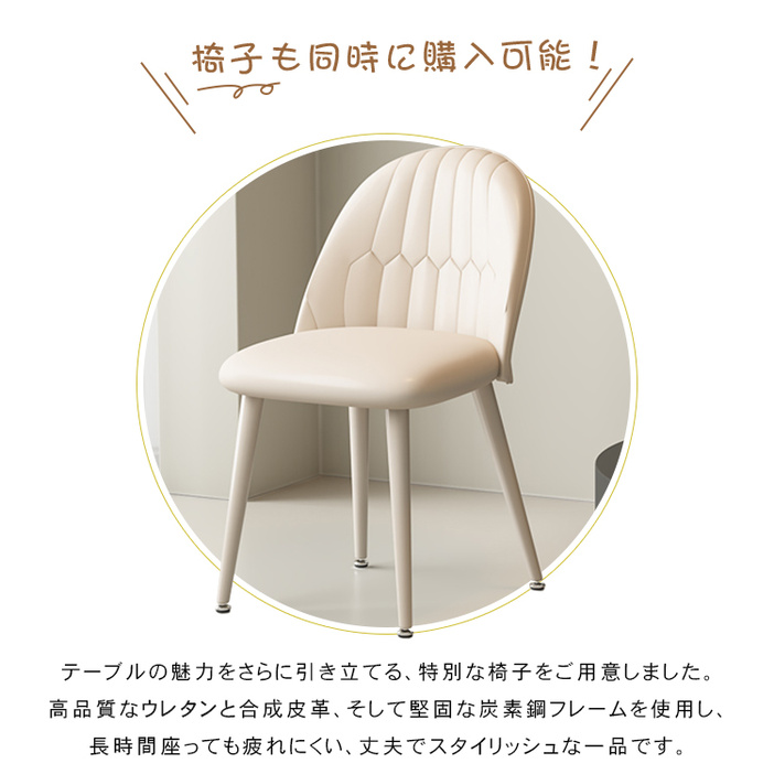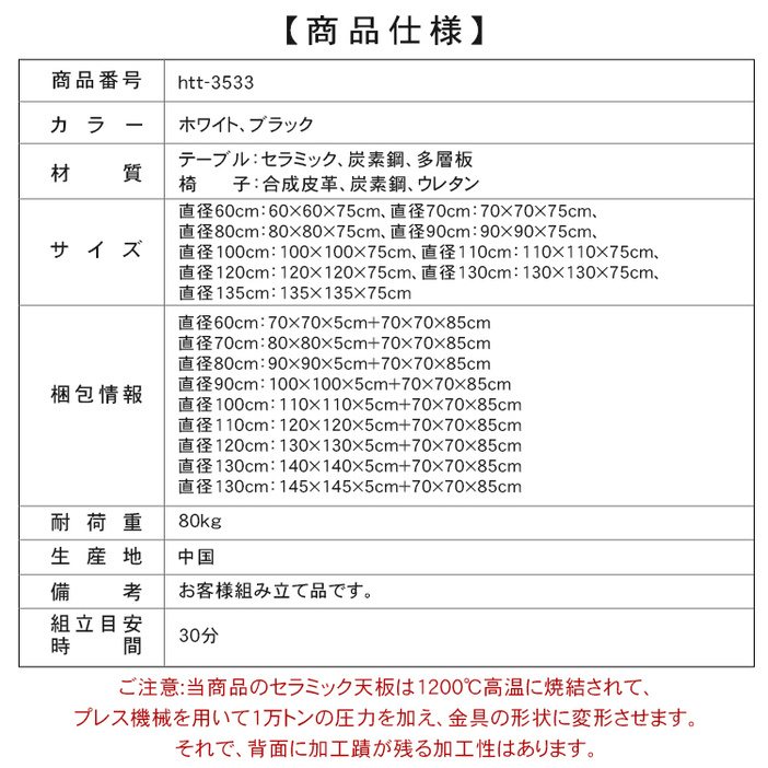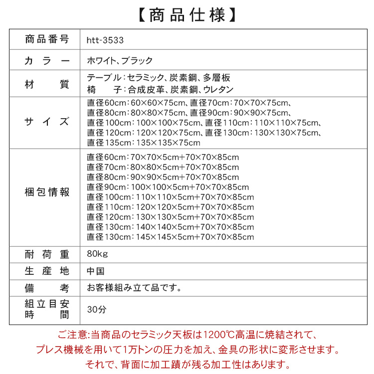 | 材質 | テーブル:セラミック、炭素鋼、多層板 椅子:合成皮革、ウレタン、炭素鋼 | ||