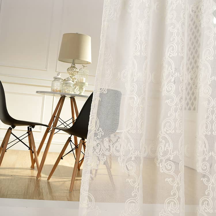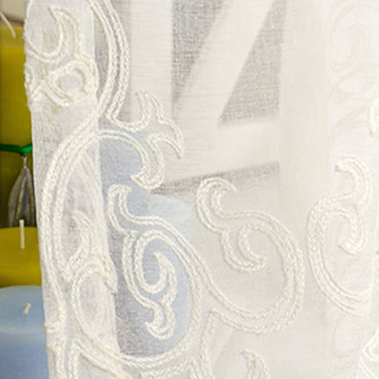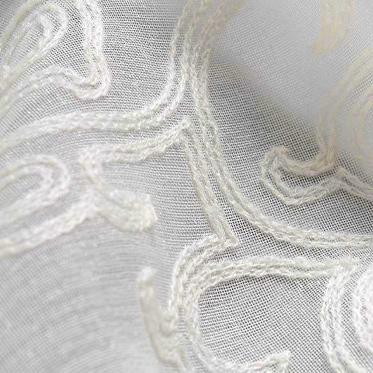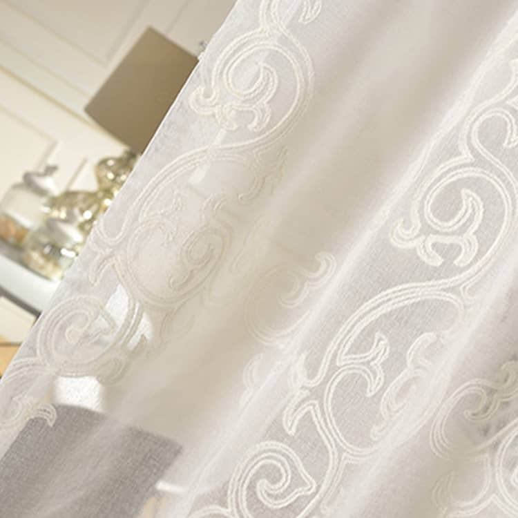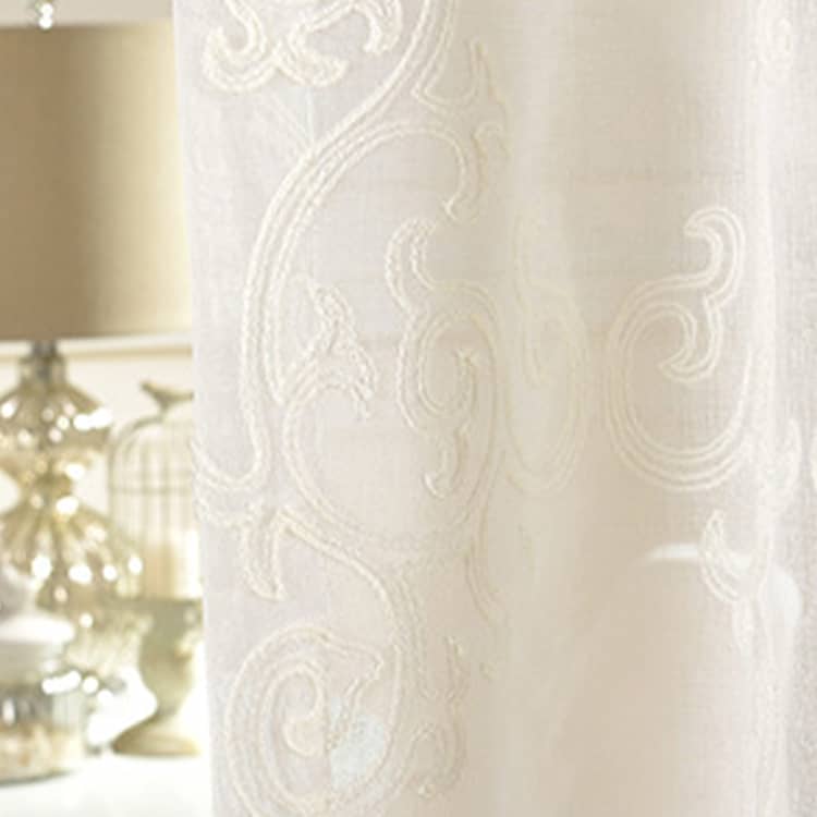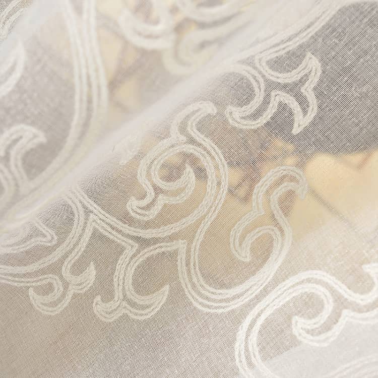 ヨーロピアン調のダマスク柄刺繍を施したエンブロイダリーレースカーテン。