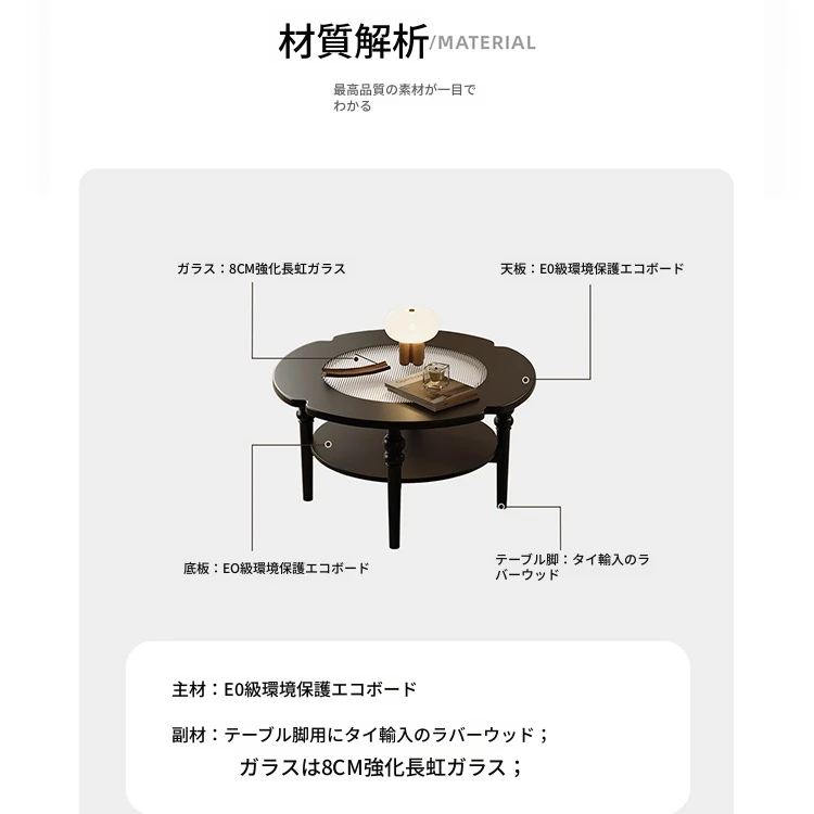 | 材質 | 集成材、ラバーウッド、強化ガラス | ||