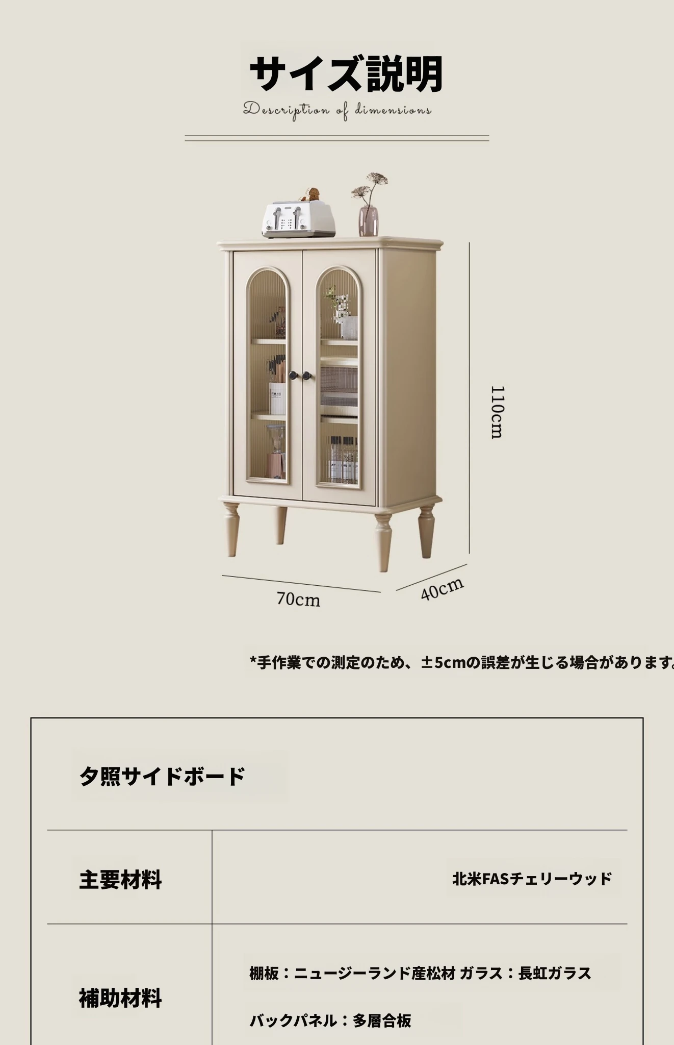 | 材質 | チェリー材、パイン、多層板、ガラス、金属 | ||